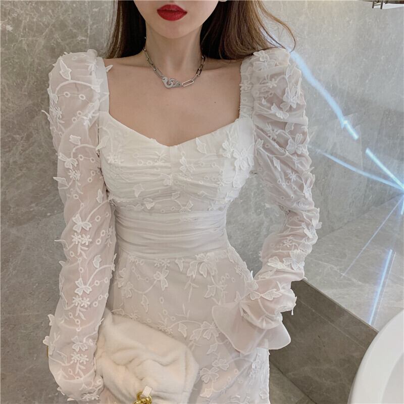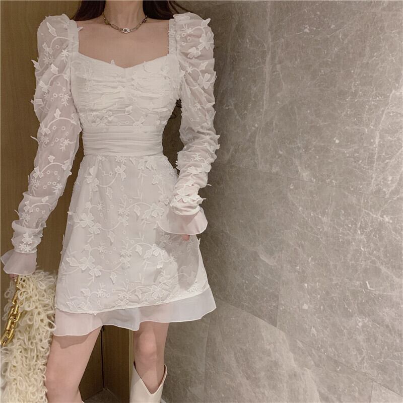 スプリングドレス ソリッド カラーウェストスカート チェーン Flowerデザイン レッド 刺繍 春物 ソリッドカラー フラワーデザイン スクウェア ドラファッションホール46323393073