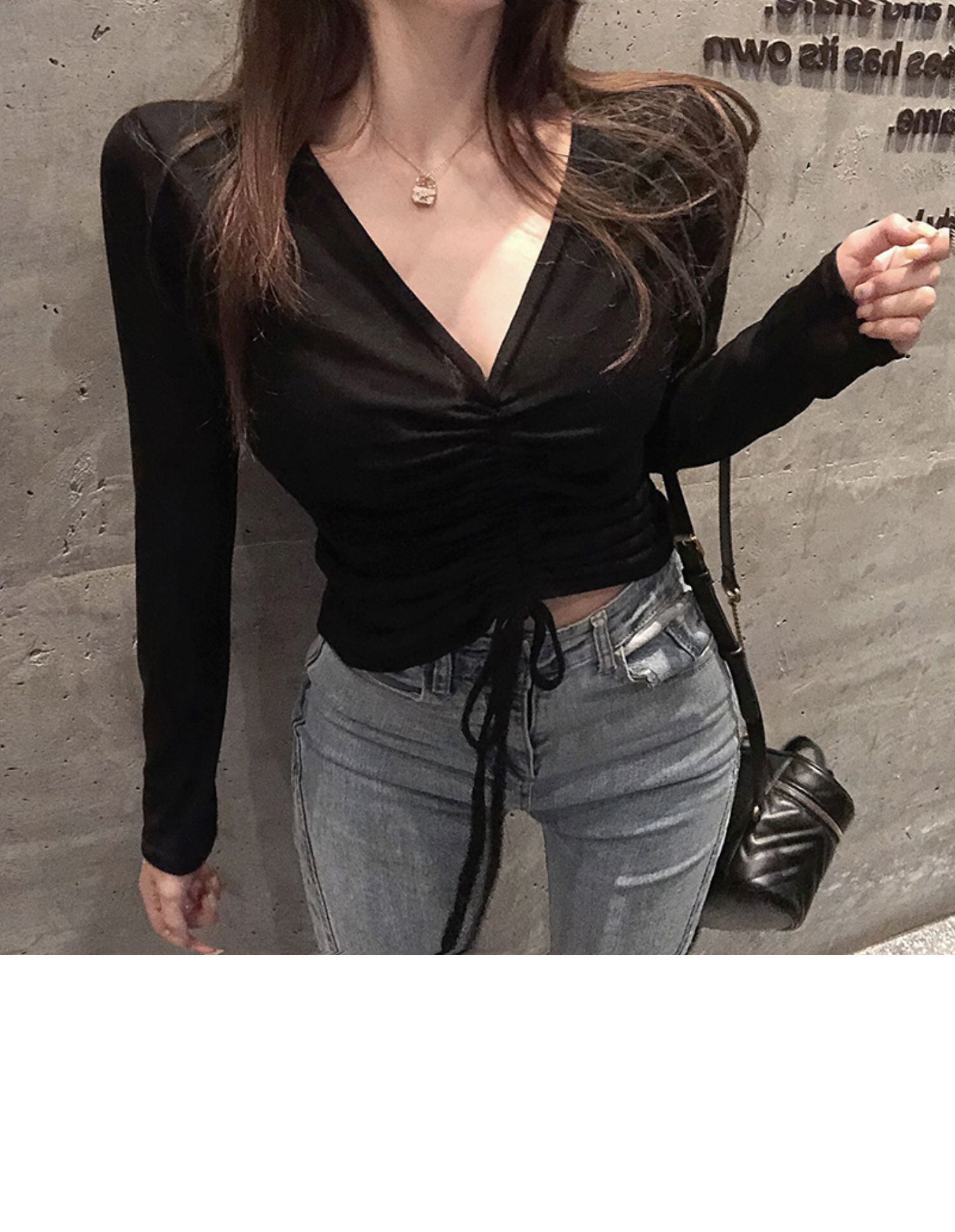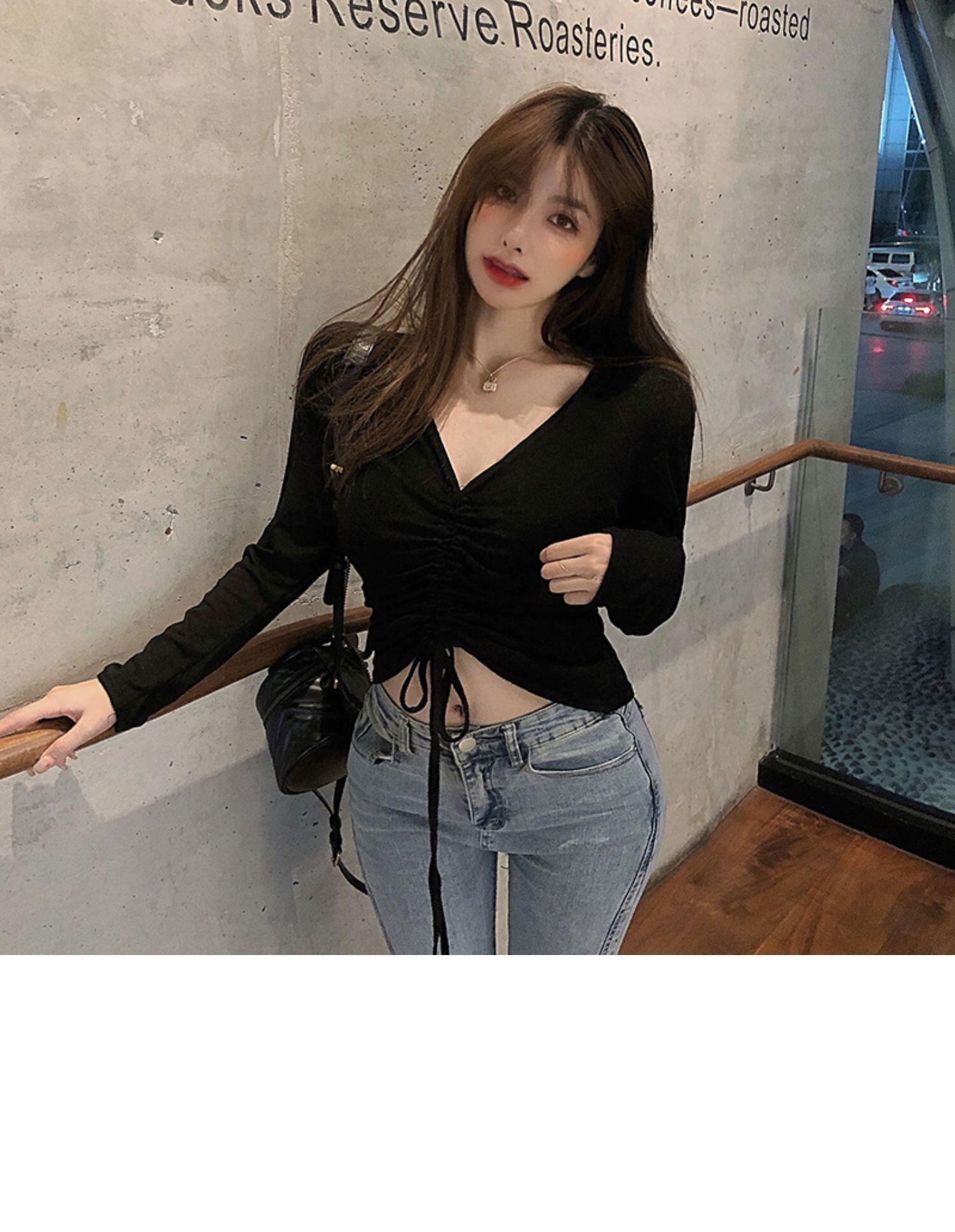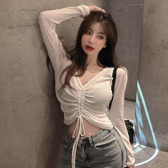 スプリングスタイルギャザーレッドトップス スリム薄手Tシャツ レディース ロング 春物 ドラファッションホール19393197091