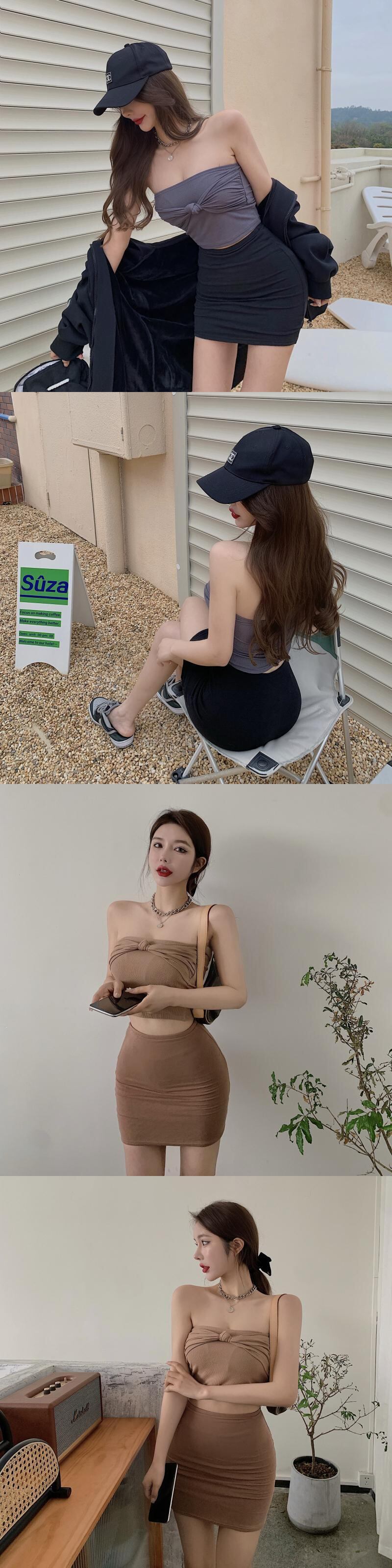 色:カーキチューブトップ,レイクブルーのチューブトップ,グレーのチューブトップ,カーキ色のスカート,黒スカート,グレースカート