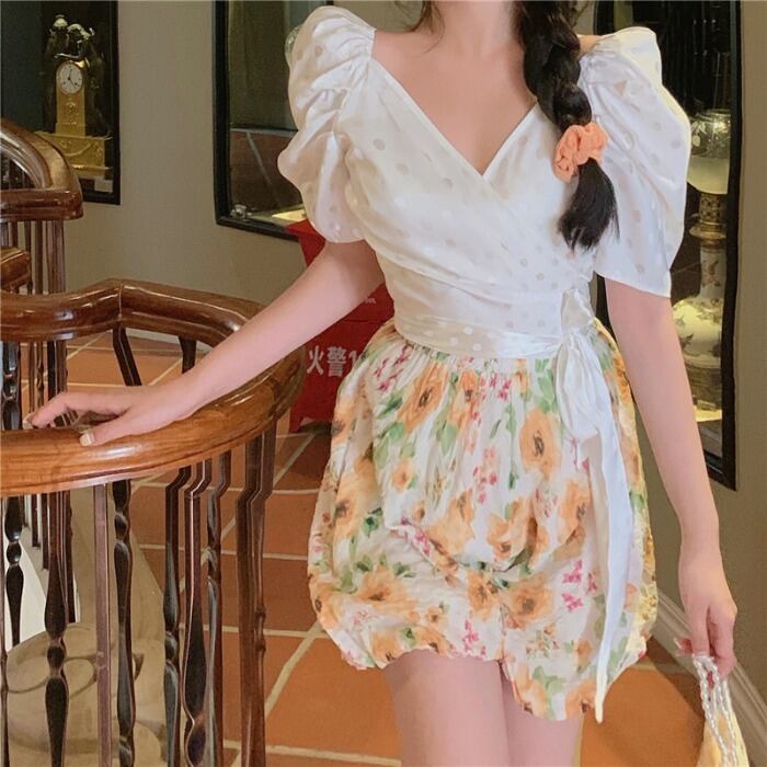 サマースタイルスタンダードVネックトップス ショーツ レディース レトロ 夏物 ブルマー ドラファッションホール79845730452