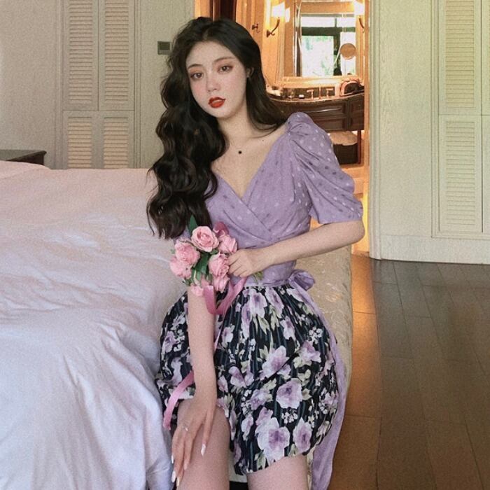 色:ホワイトトップ,パープルトップ,黒い底の紫色の花のショーツ,白地に黄色の花柄ショーツ