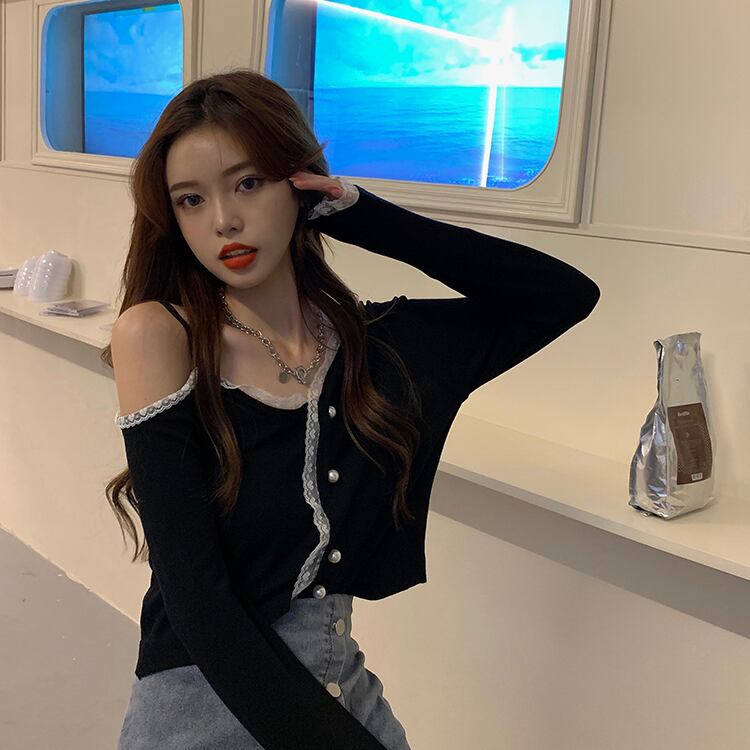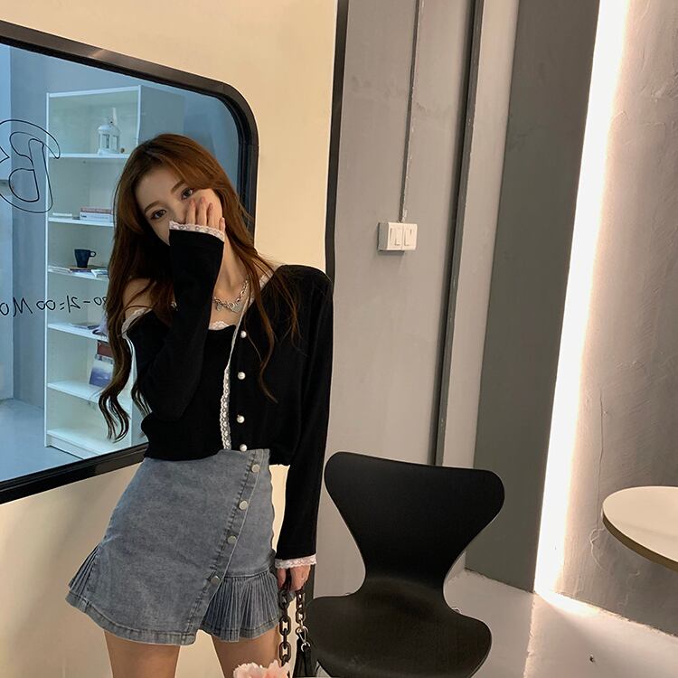 レースブラックカーディガンジャケット オータムスプリングレッドショートトップス 大人ガーリー スウィート キュート カジュアル 春物 秋物 ステッチ ドラファッションホール7001156811