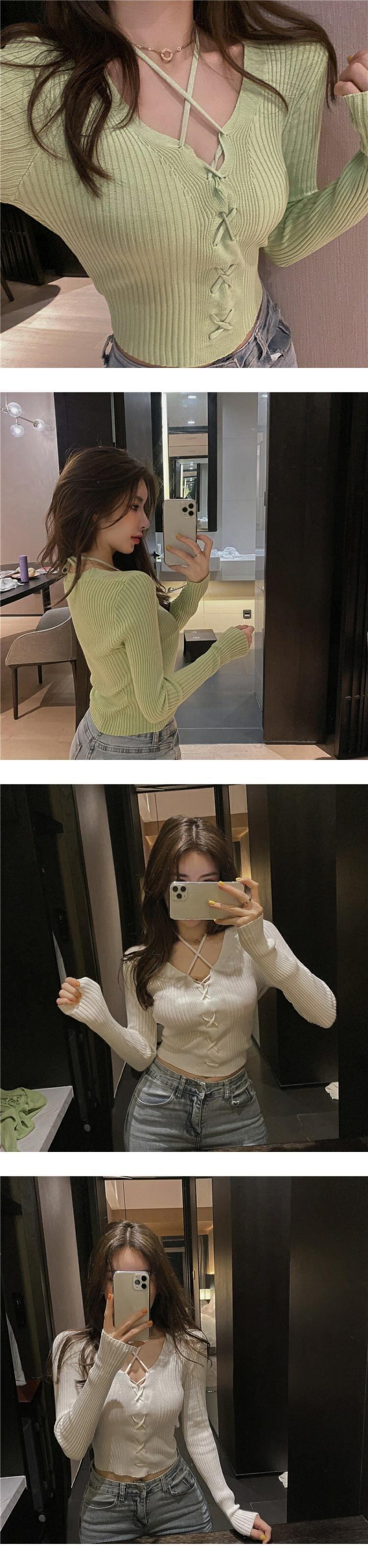 ニットセーター オータムウィンターVネックホルタースリムショートトップス 秋物 冬物 ドラファッションホール50886863284