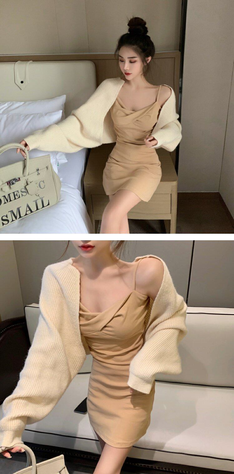 色:タフィースリングドレス,クリーミーな白いカーディガン