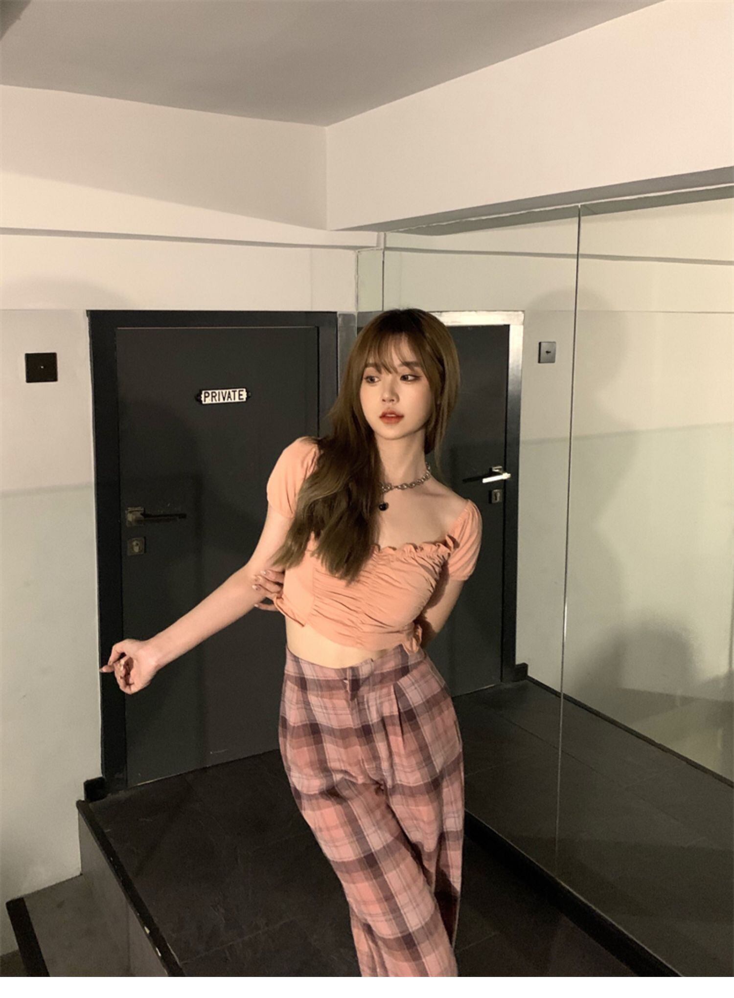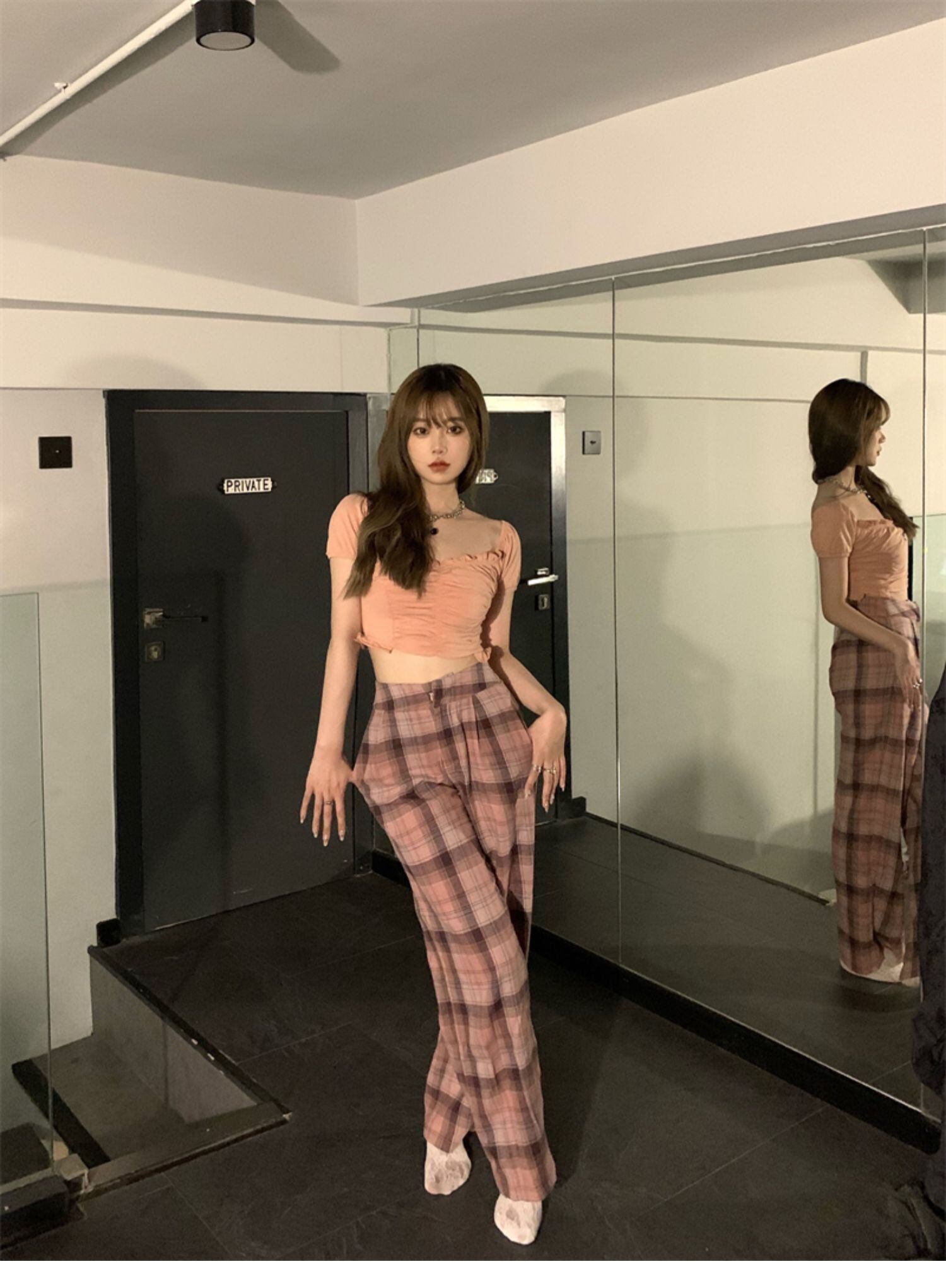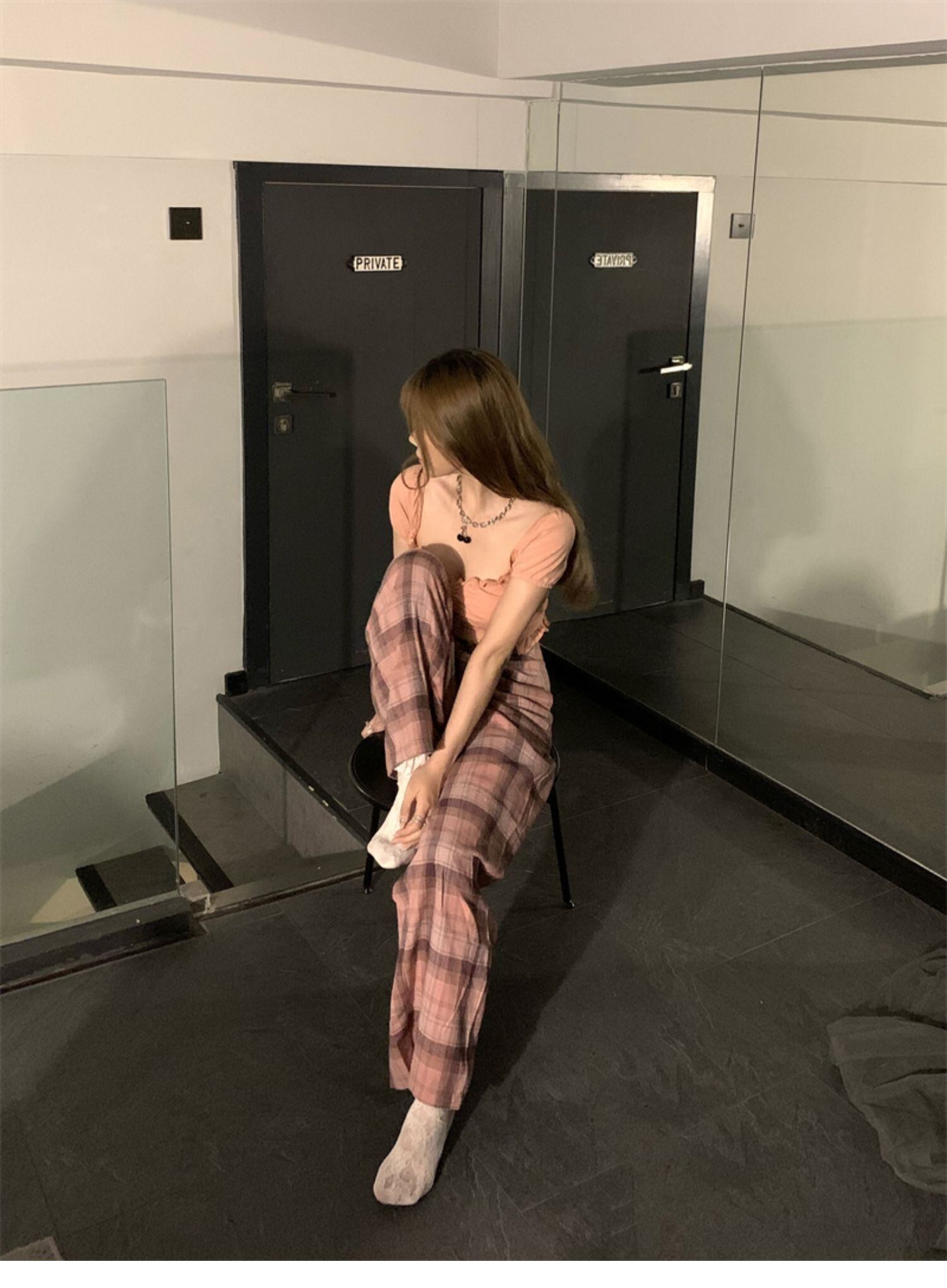 薄手Tシャツ 格子柄カジュアルパンツ レディース ドラファッションホール93891214558