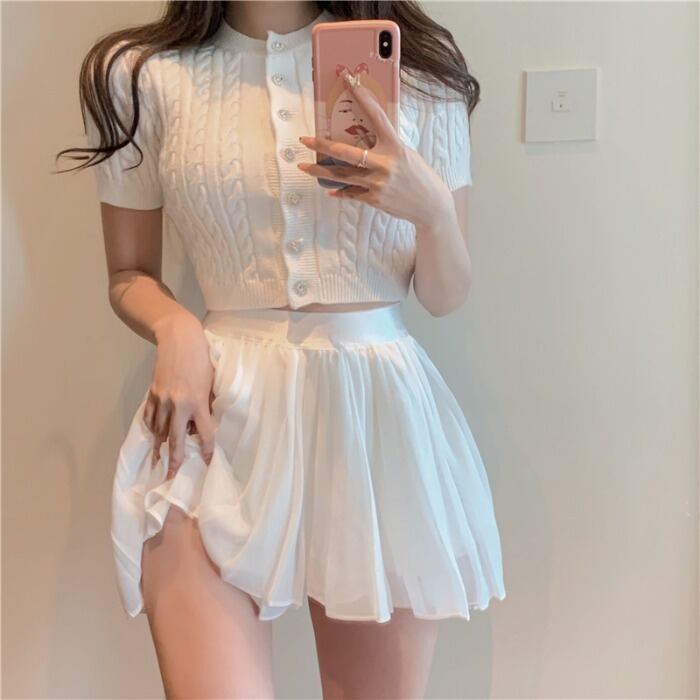 ニットショートボタントップス プリーツAラインスカート ピュア ドラファッションホール94604131534