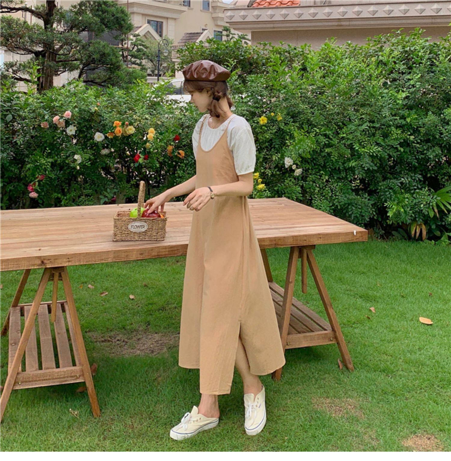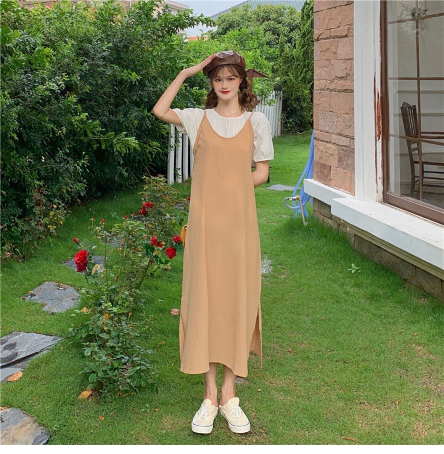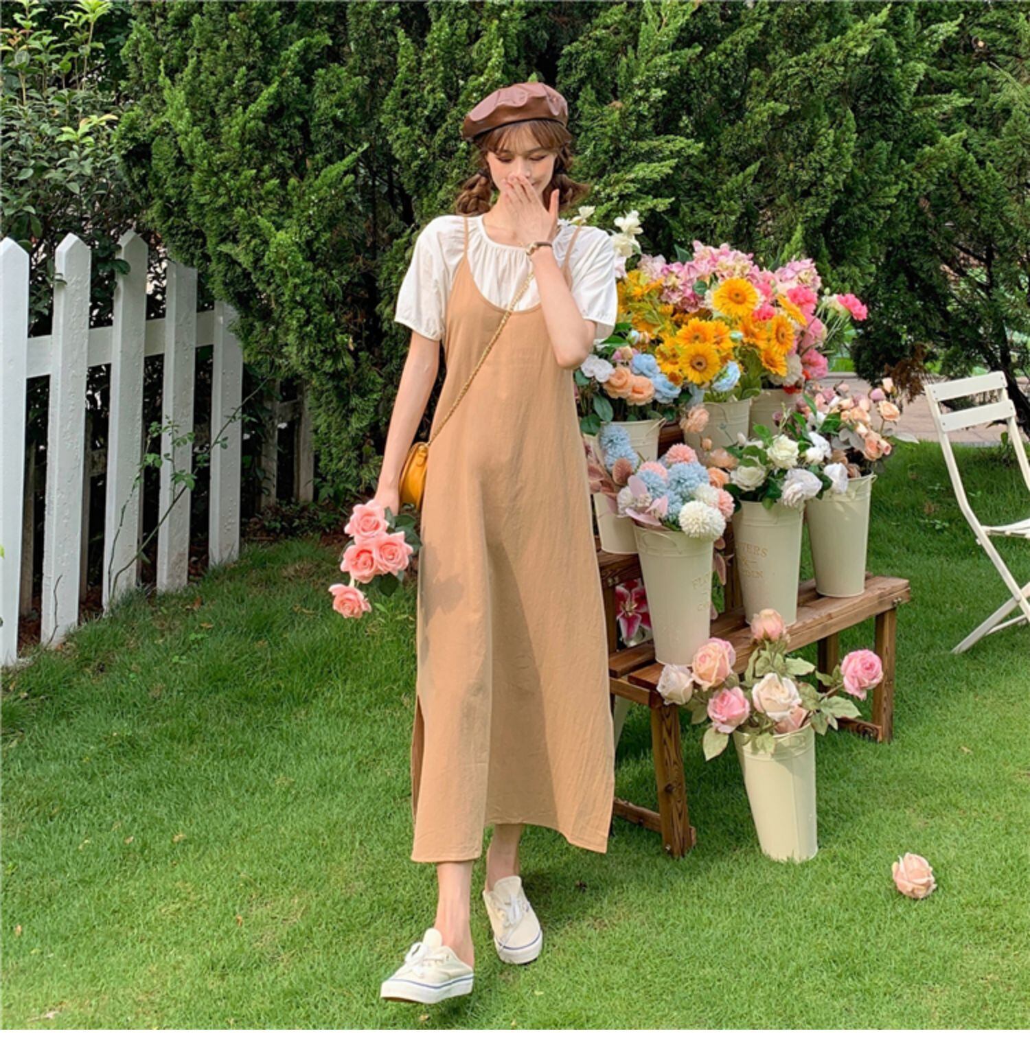 色:ホワイトトップ,黄色のシャツ,黄色のサスペンダースカート,ネイビーブルーのサスペンダースカート
