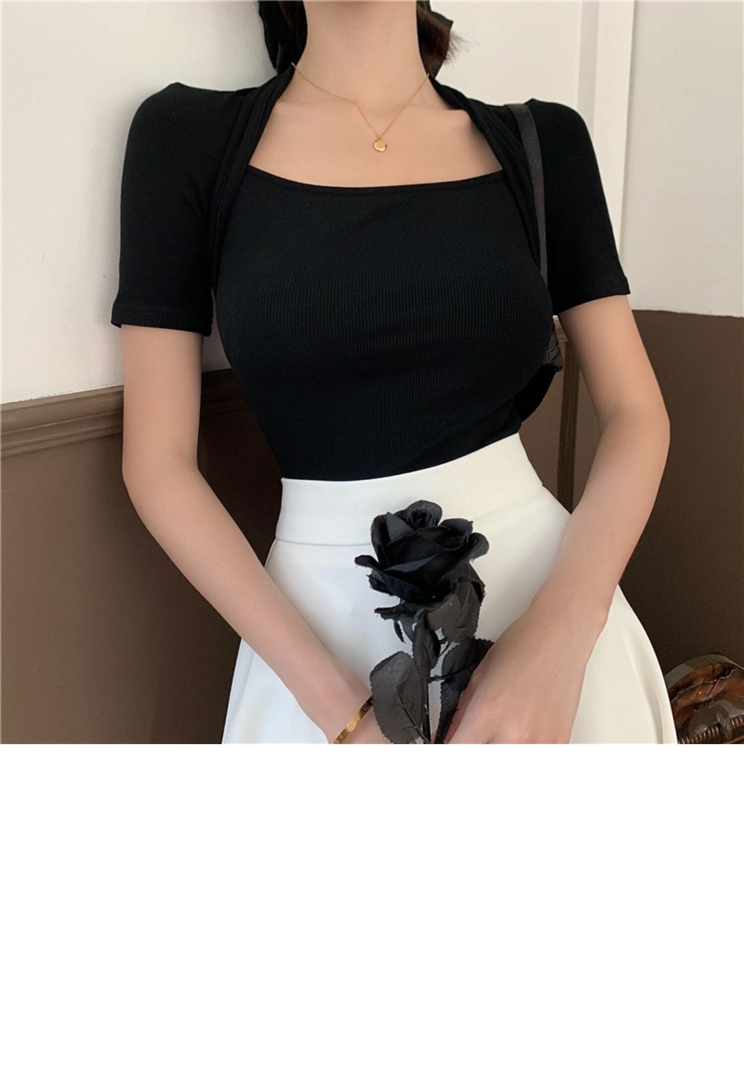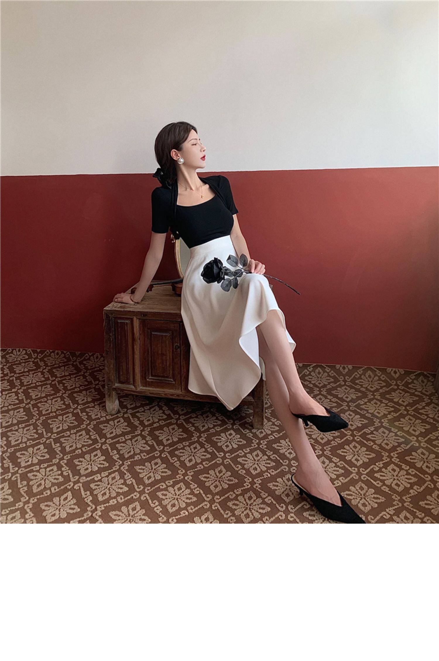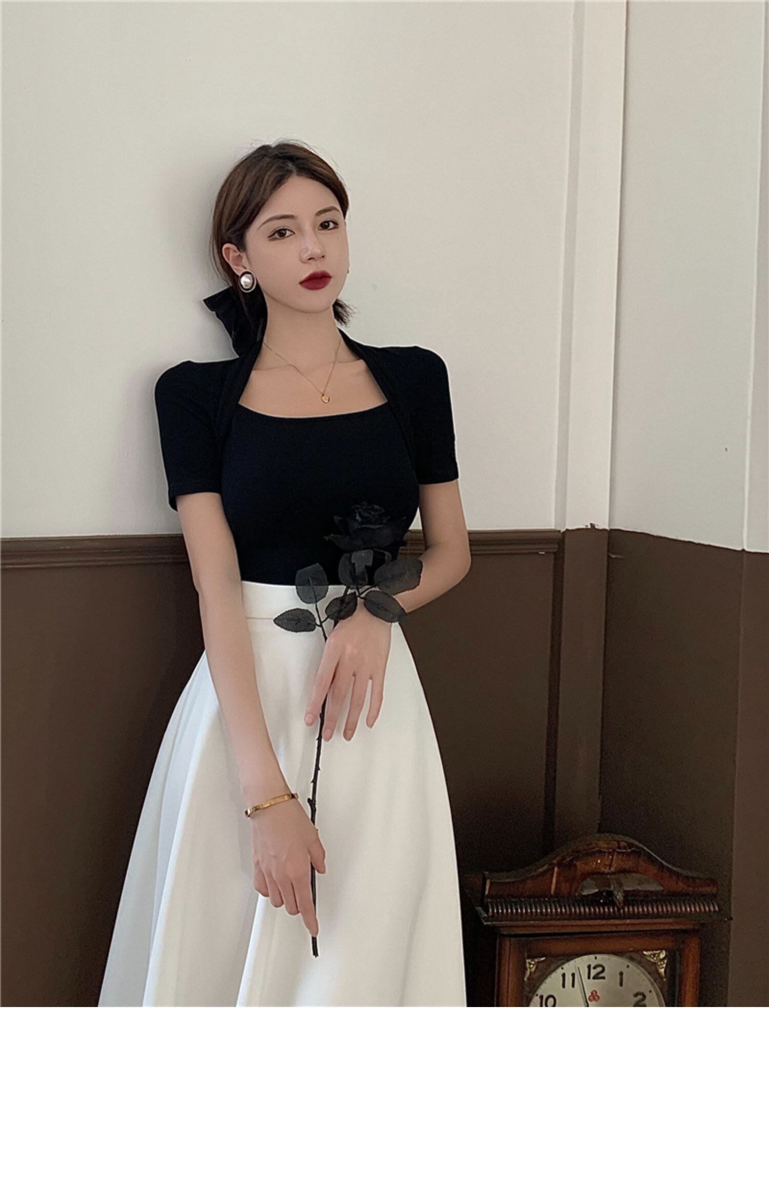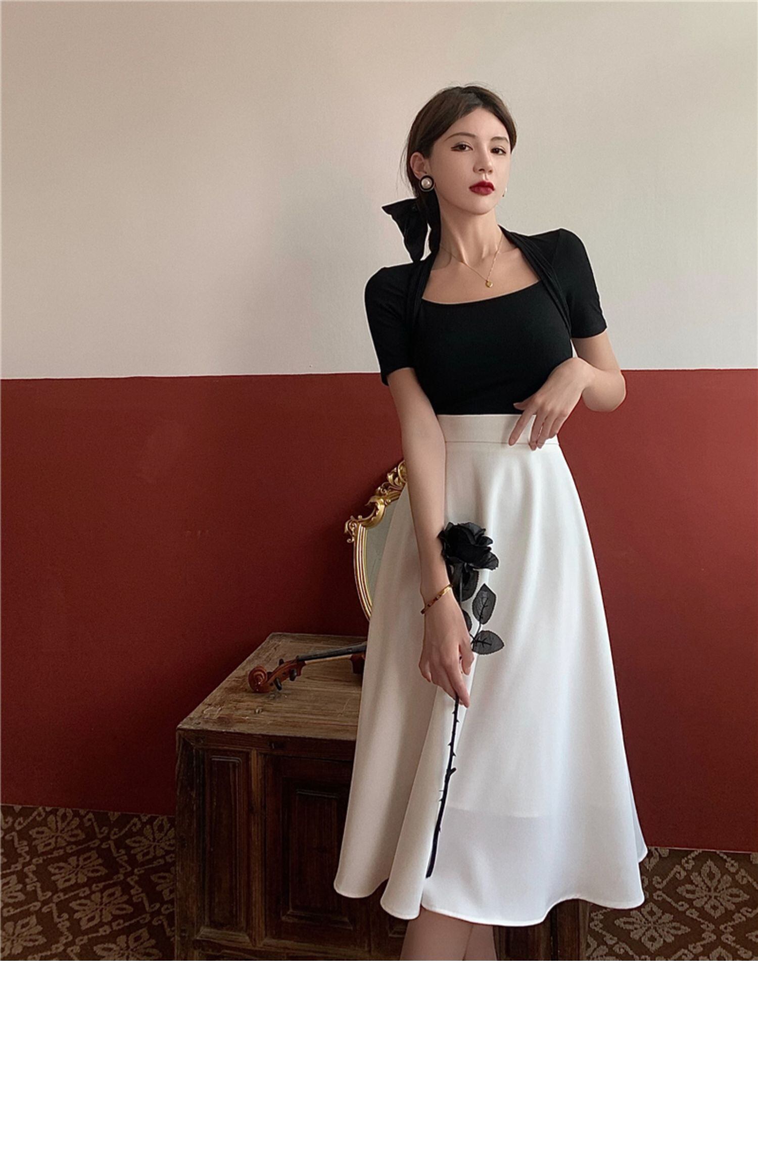 色:ブラックトップ,白いスカート