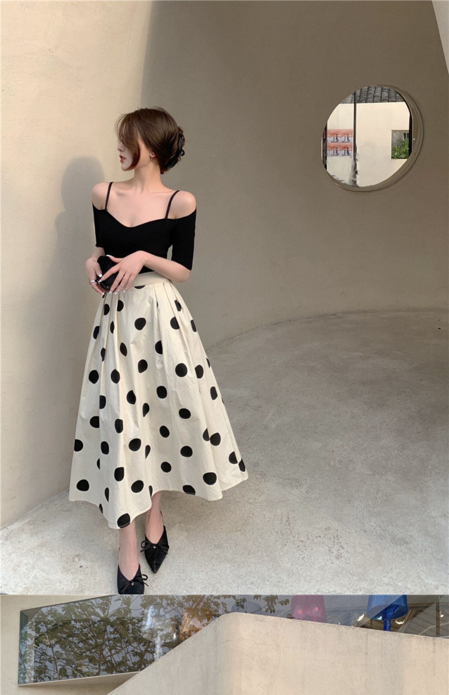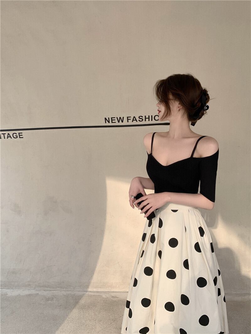 スプリングサマースタンダードハイウェスト薄手水玉スカート ブラックシャツ レトロ 春物 夏物 ドラファッションホール58694687755