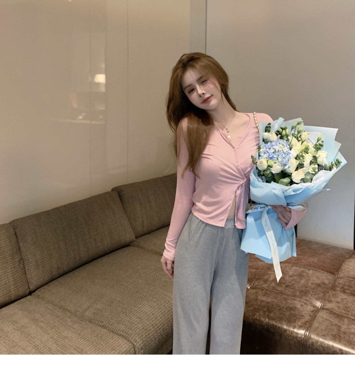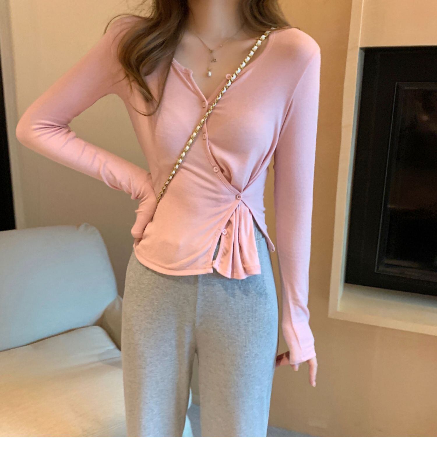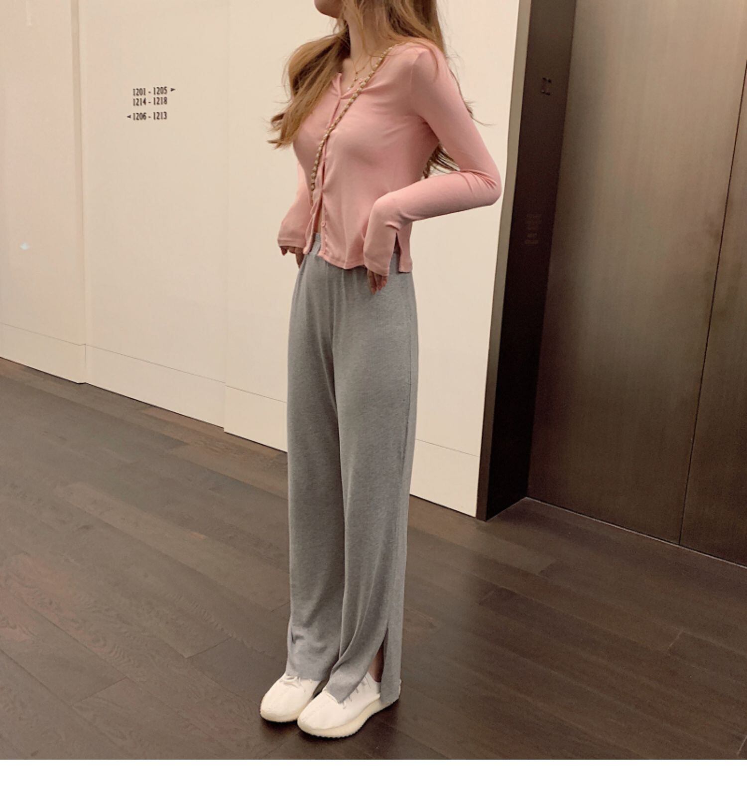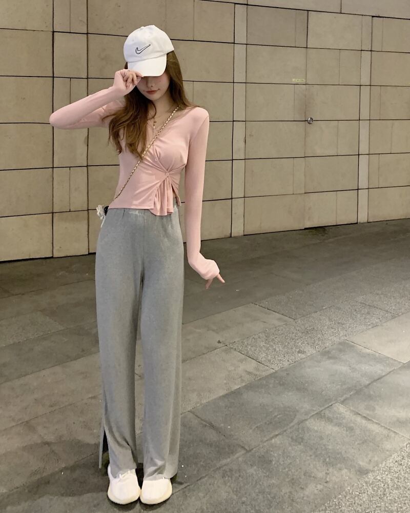色:ピンクの長袖カーディガン,グレーのズボン