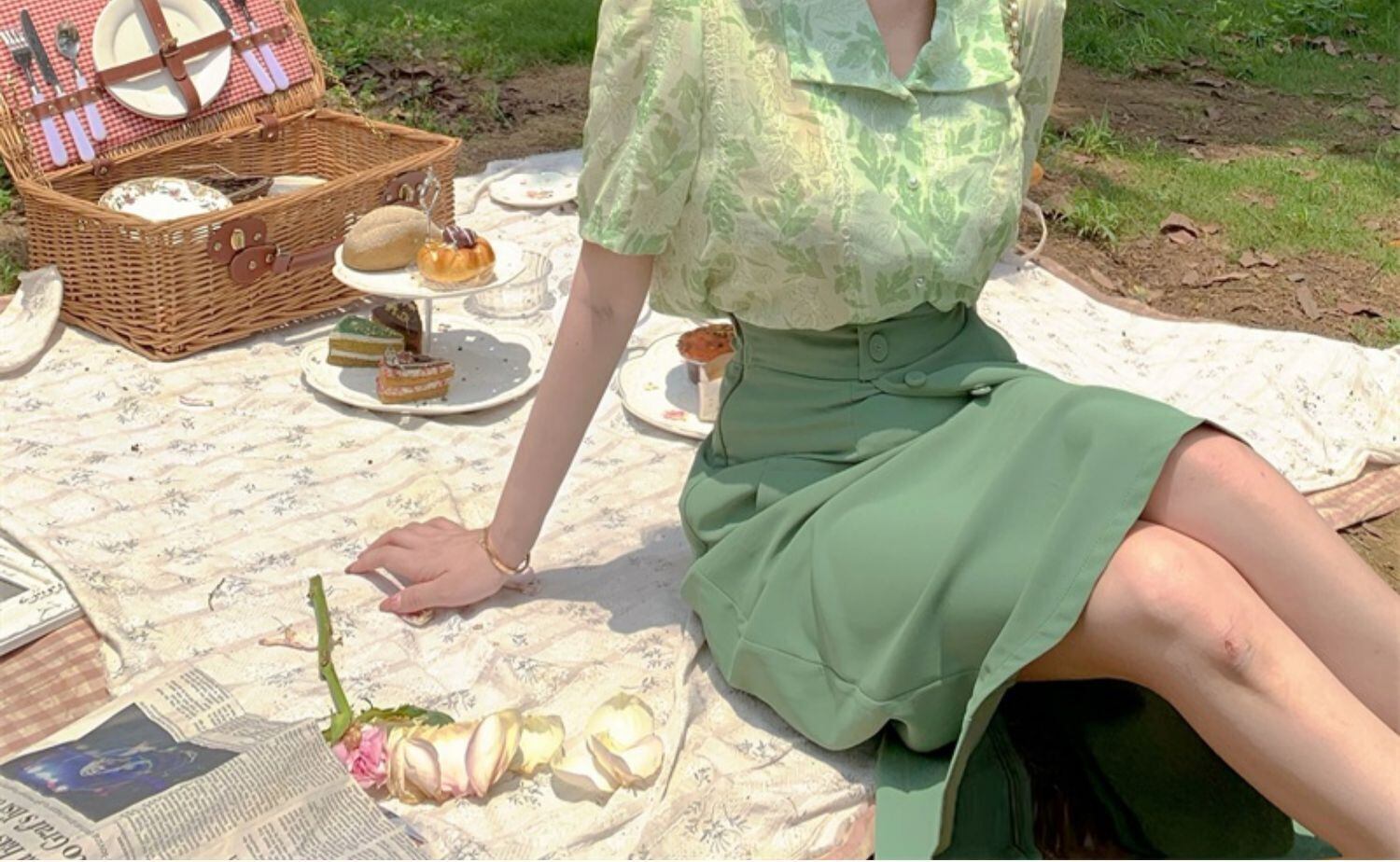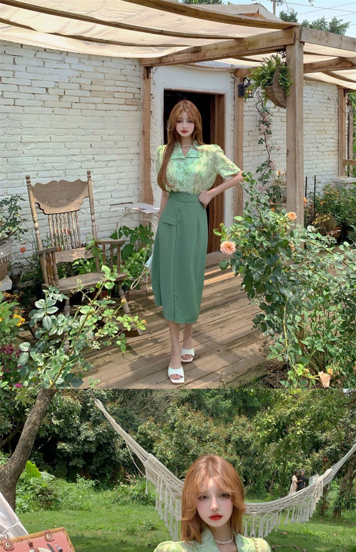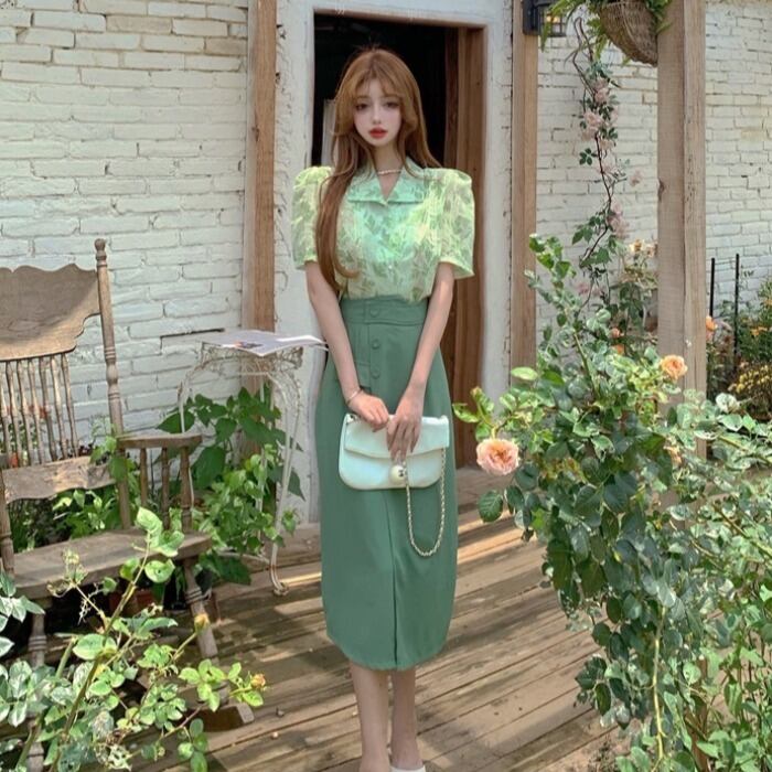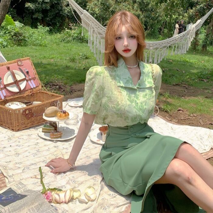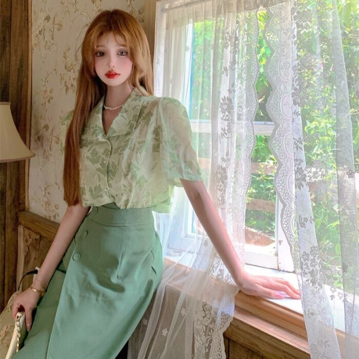 レッドスリーブシフォンシャツ トップス ハイウェストウェストスカート サマー 夏物 ドラファッションホール91897420226