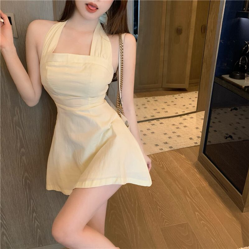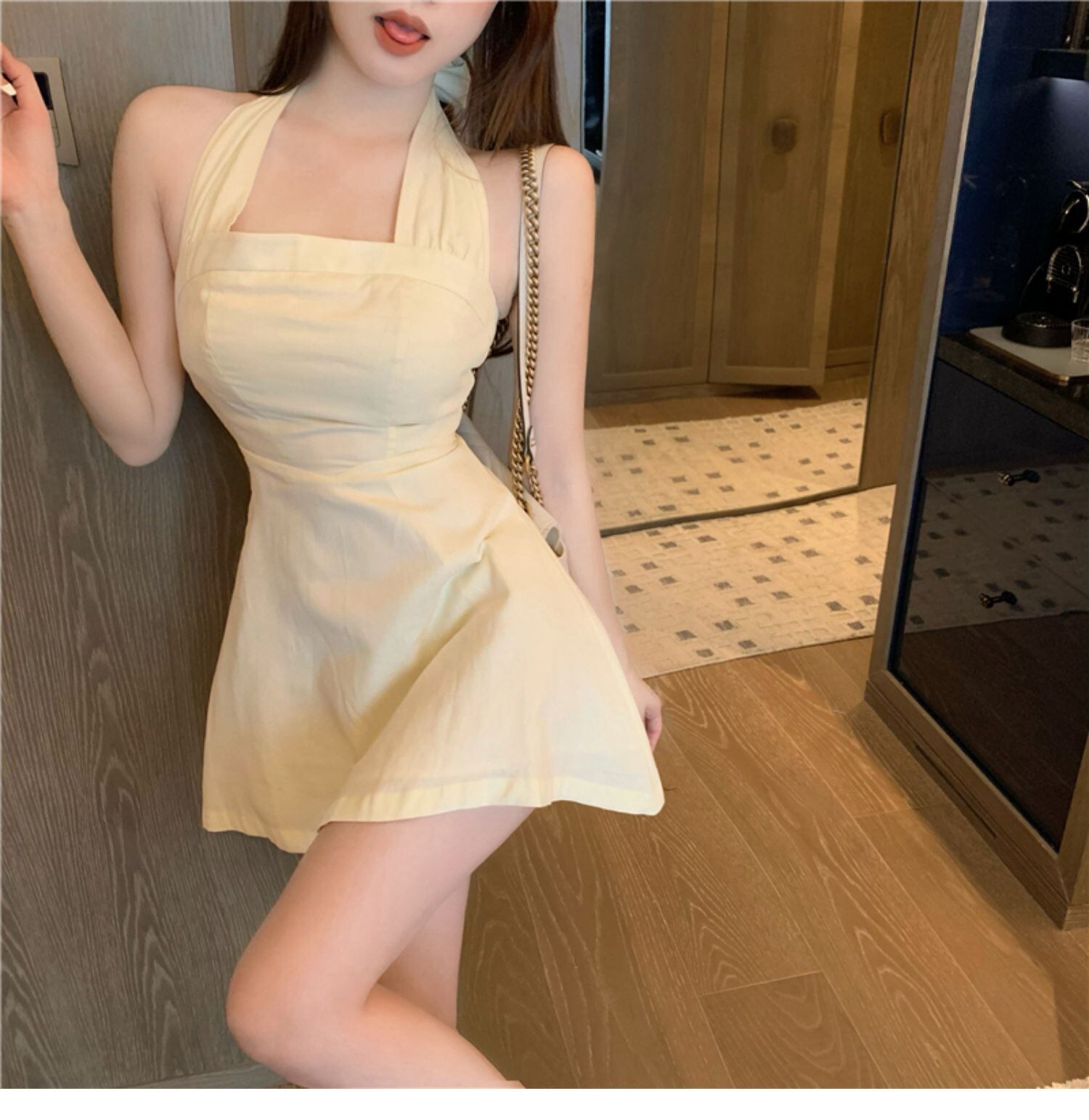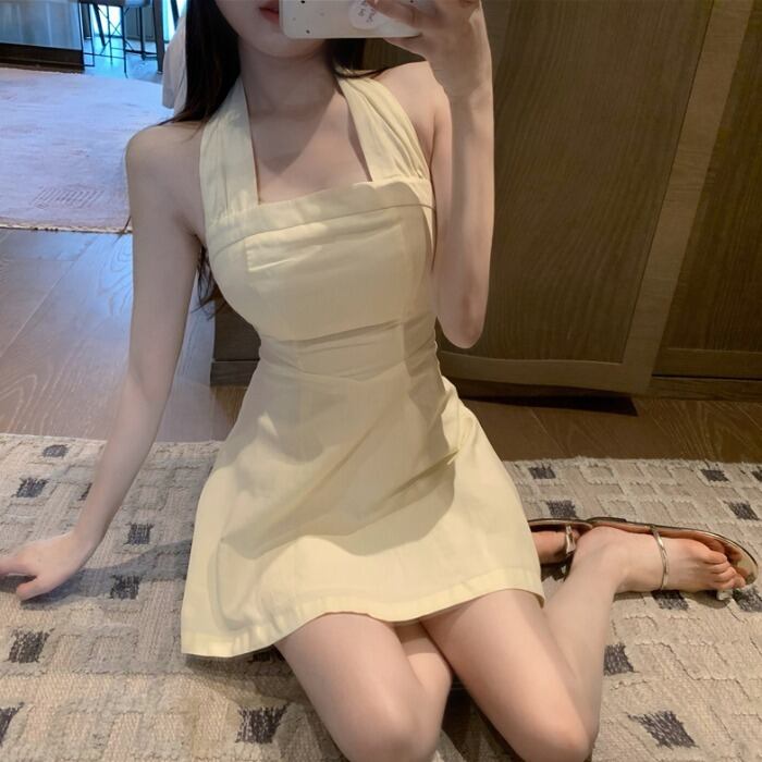 サマースタンダードカラーソリッド ドレス ホルターAラインスカート レトロ 夏物 ソリッドカラー スクウェア ドラファッションホール29431472261