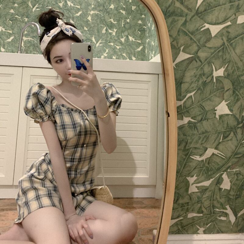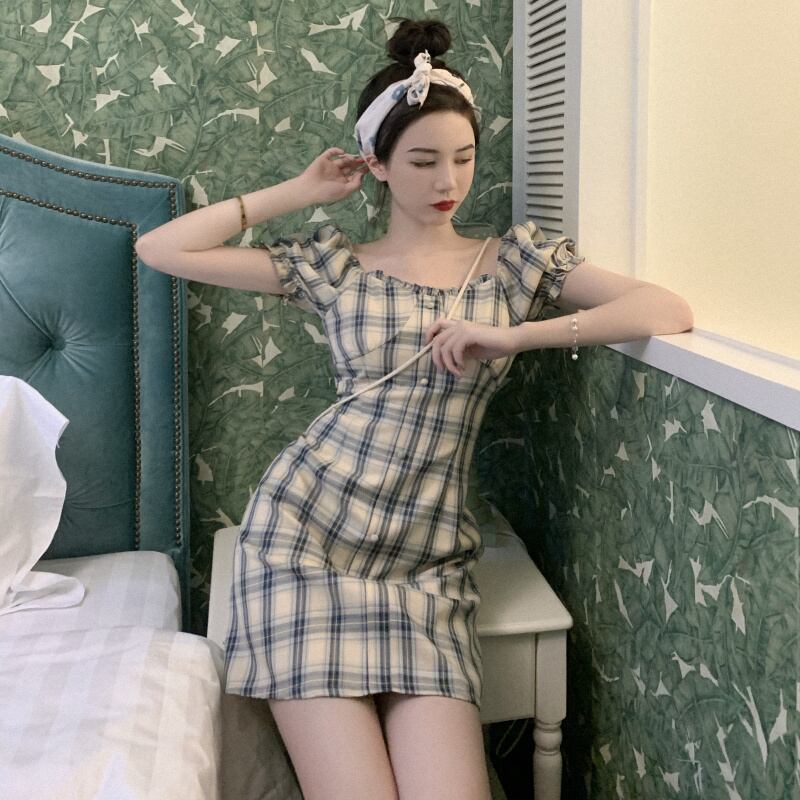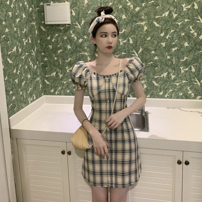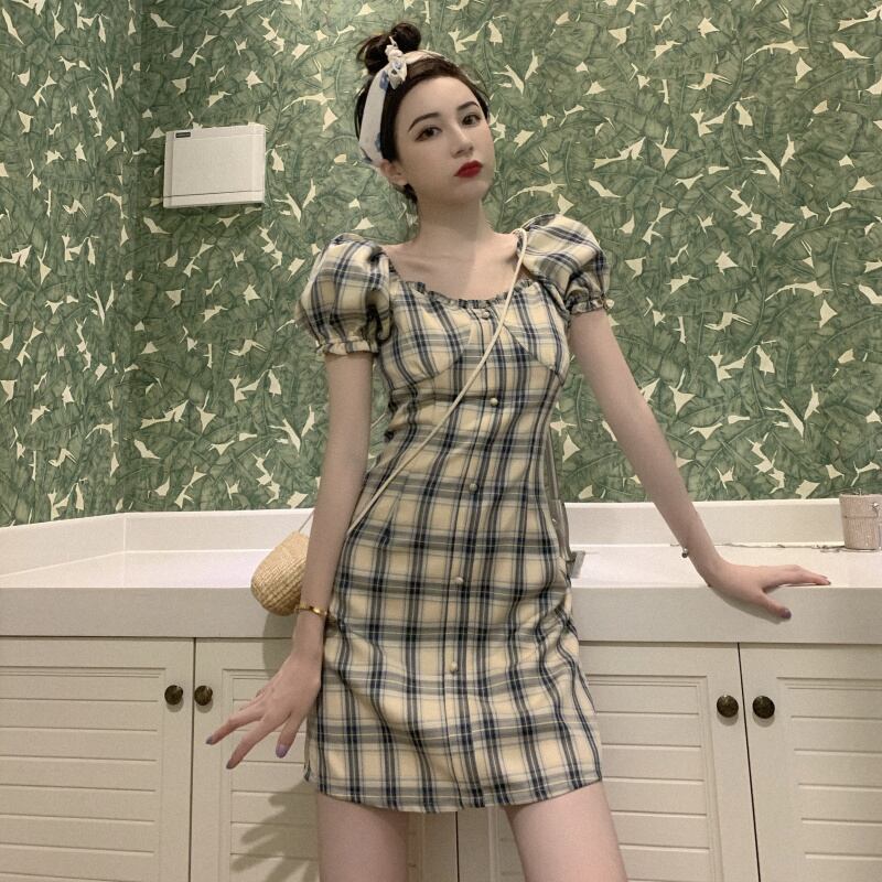 スプリングサマーウェストスリーブ格子柄ドレス スカート 大人ガーリー スウィート キュート カジュアル 春物 夏物 スクウェア ドラファッションホール48798331617