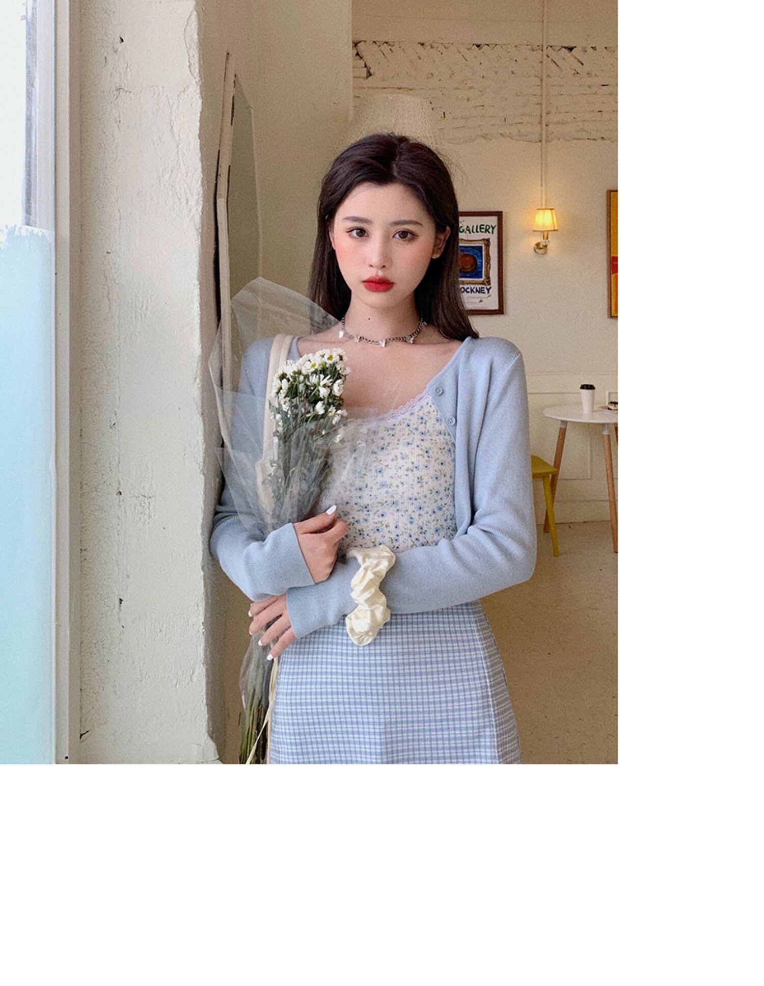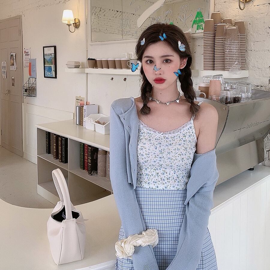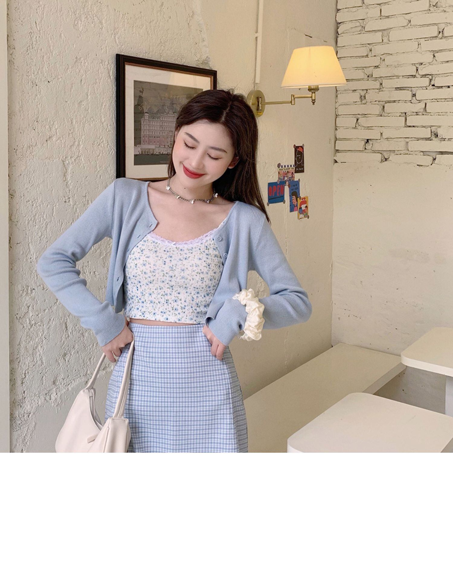 色:ブルーカーディガン,フローリングスリング,チェック柄スカート