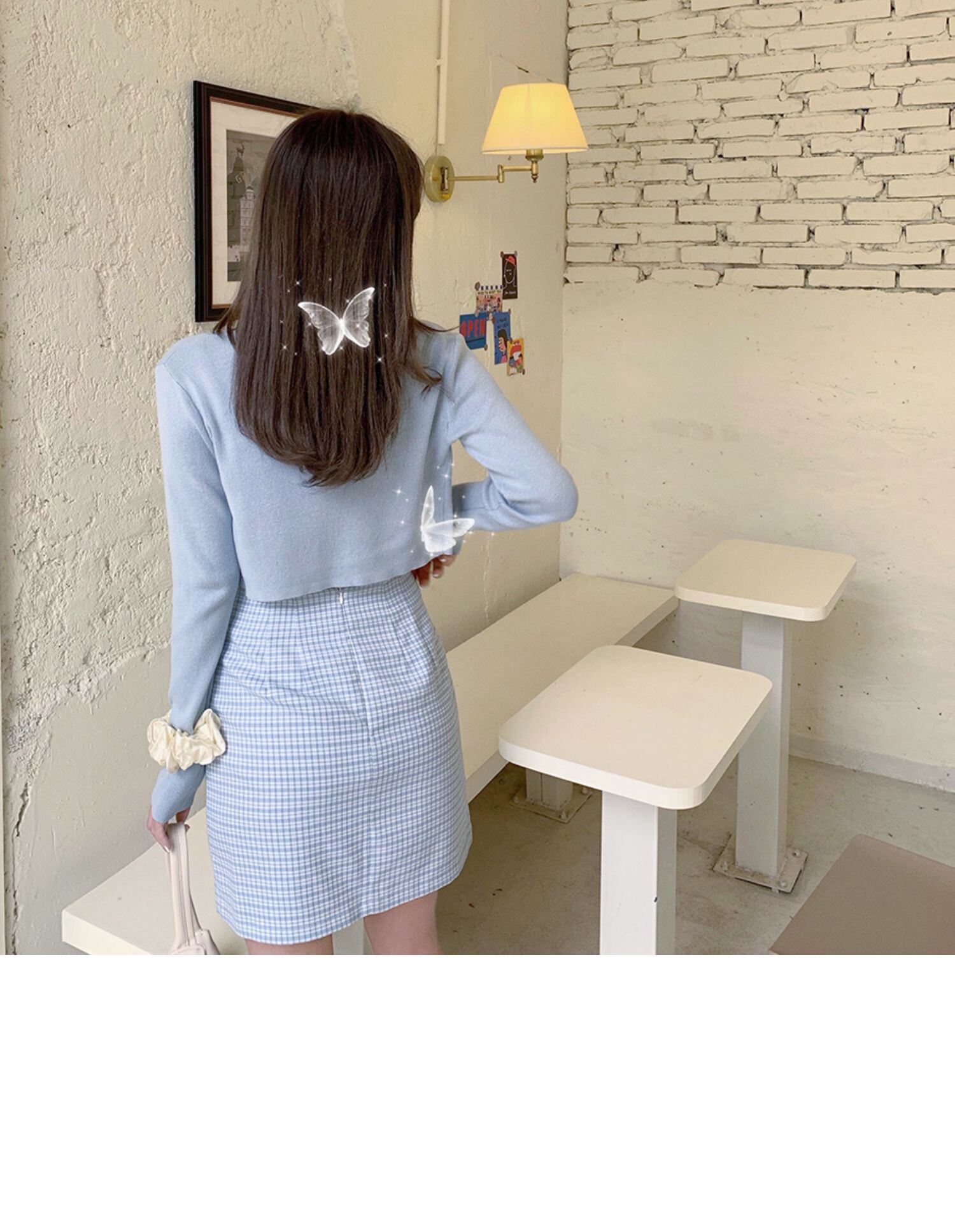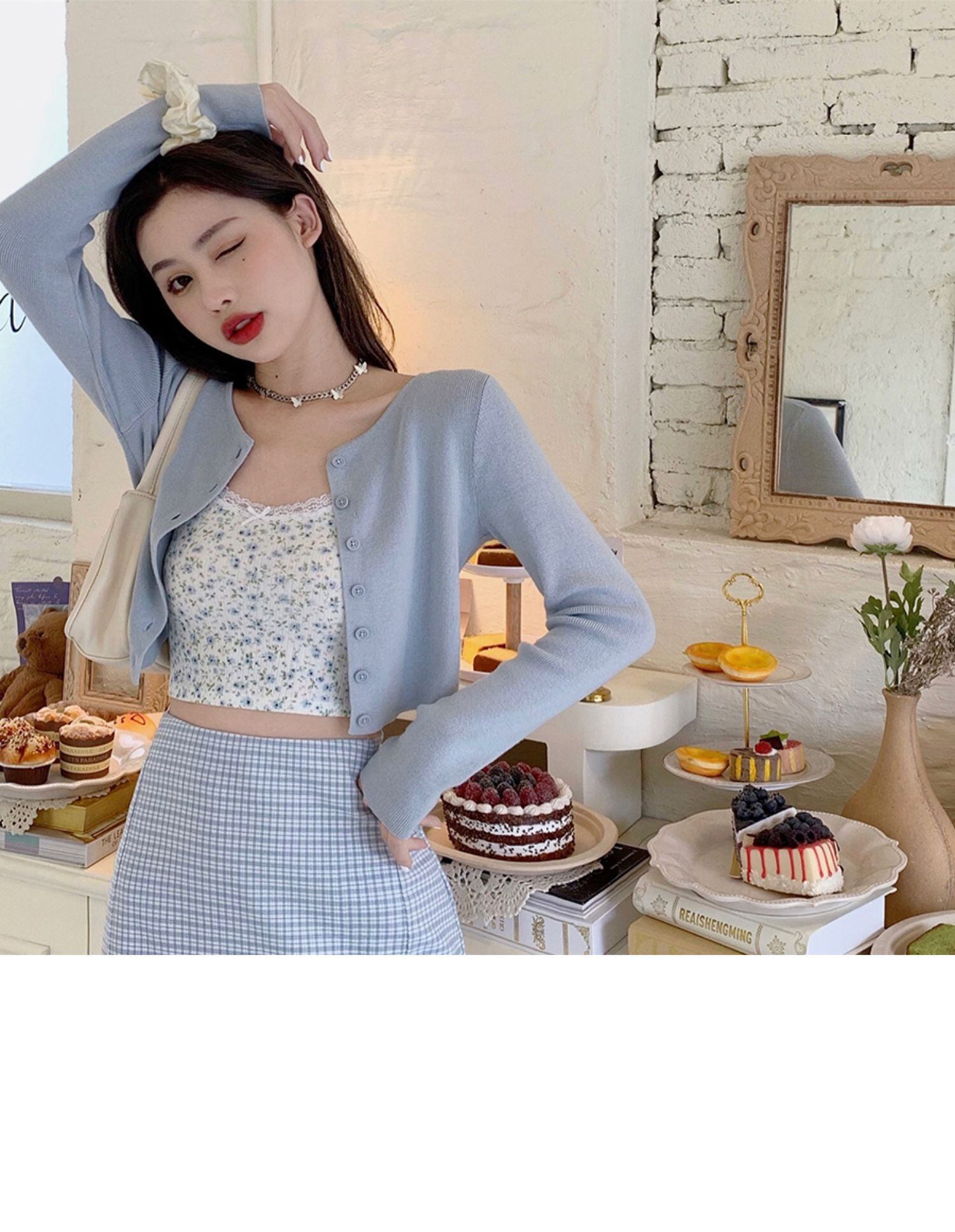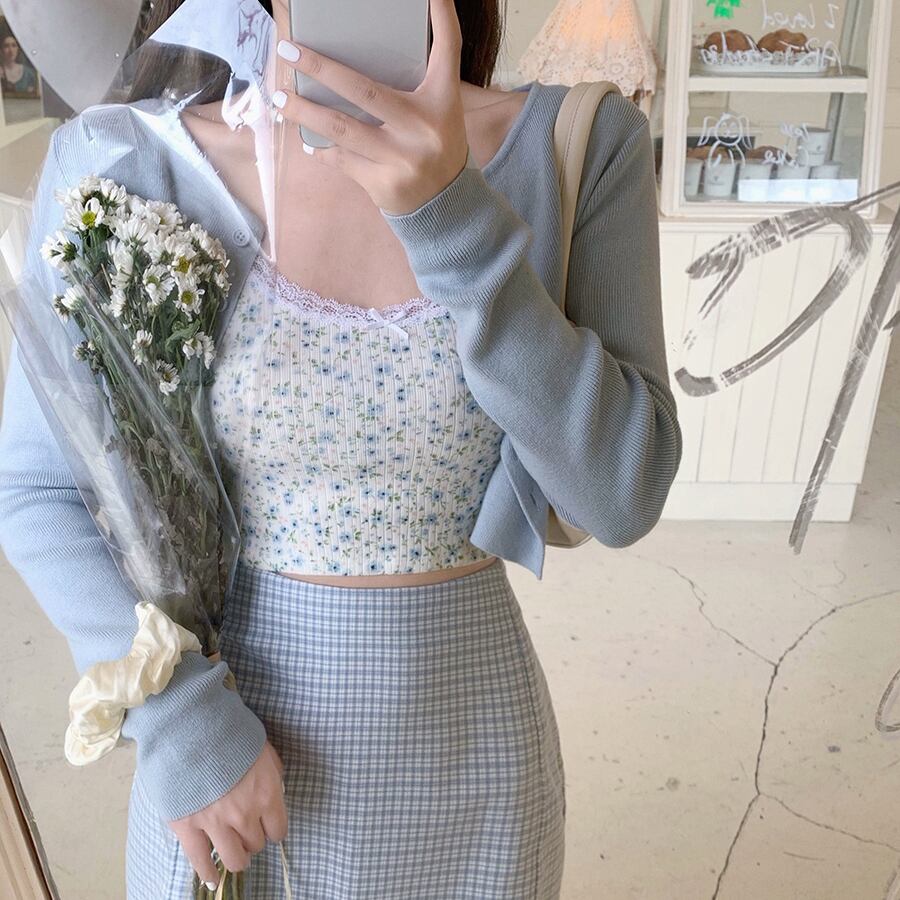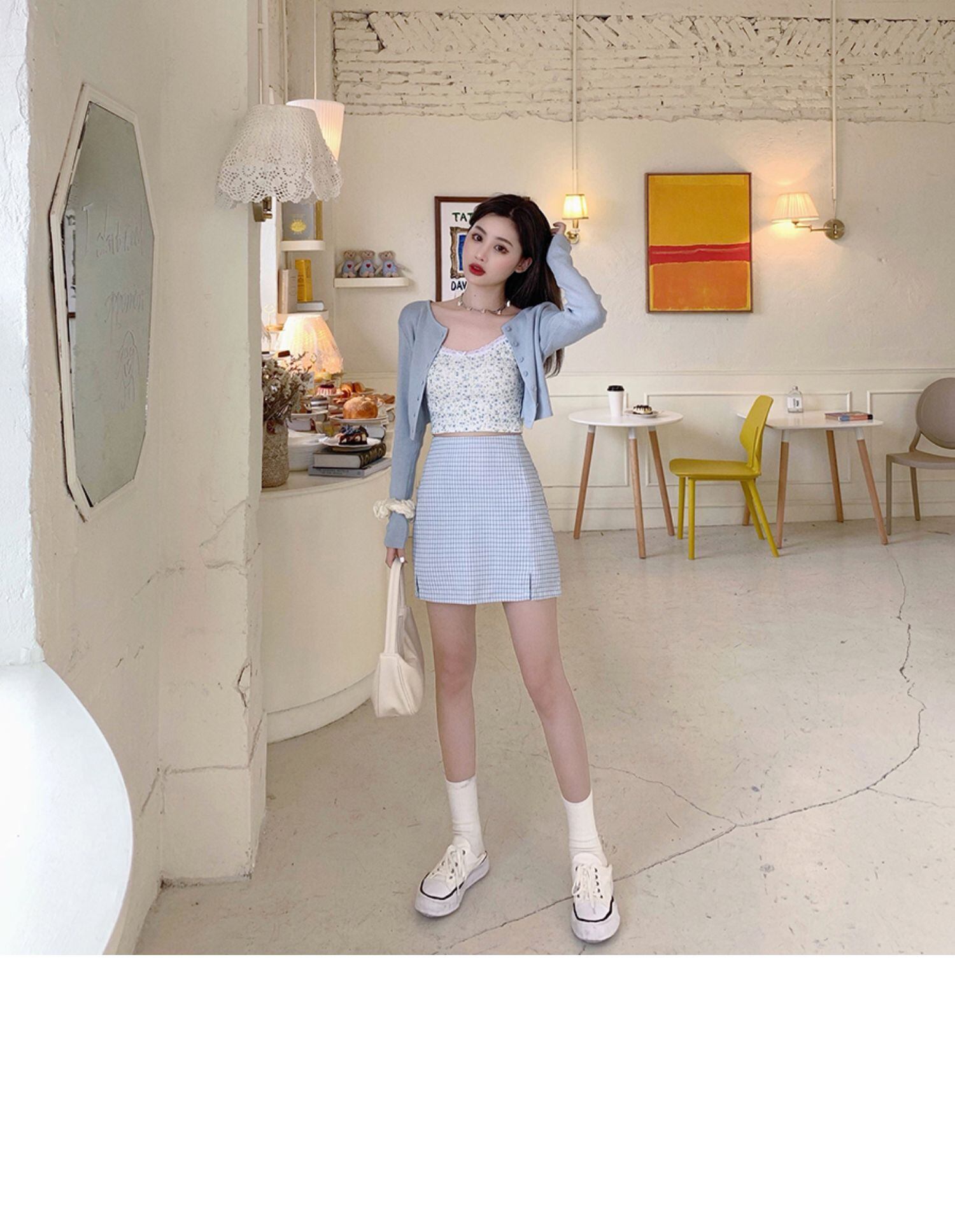 色:ブルーカーディガン,フローリングスリング,チェック柄スカート