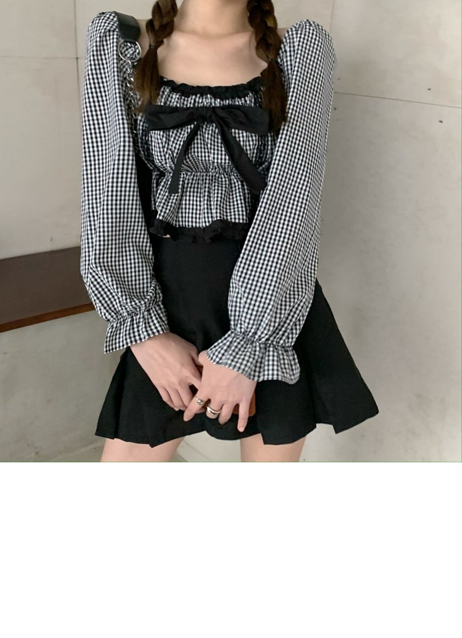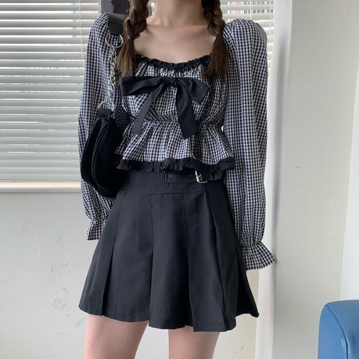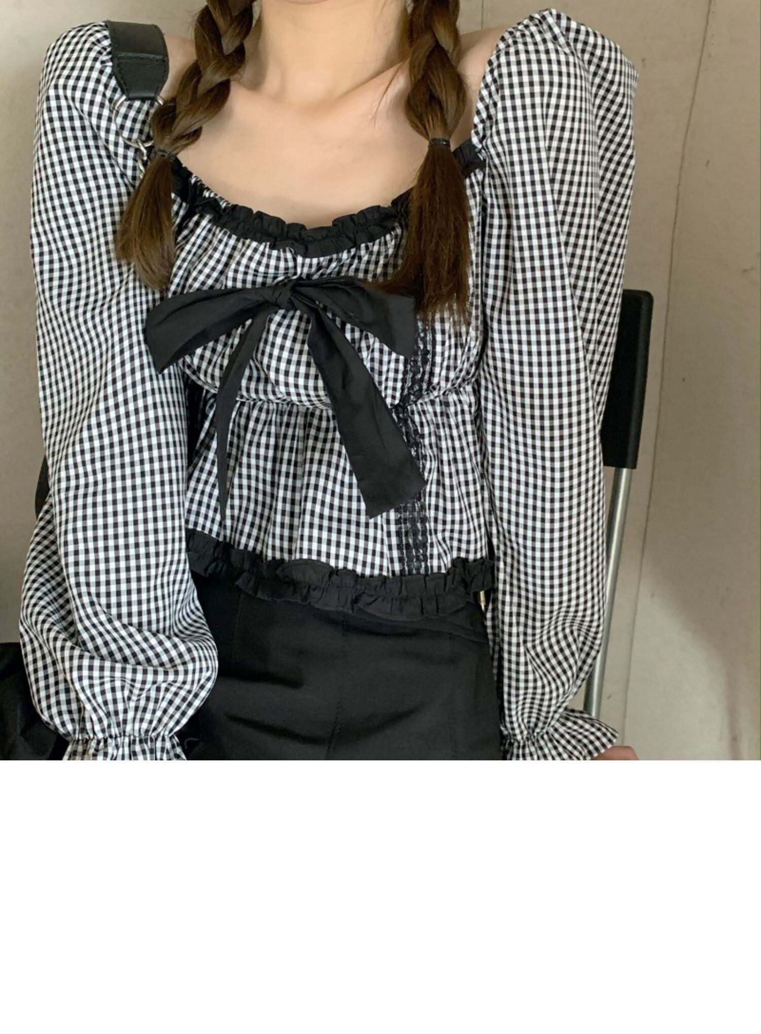 スリーブカラートップス レディースリボン格子柄シャツ スクウェア ドラファッションホール40038253116