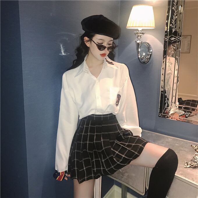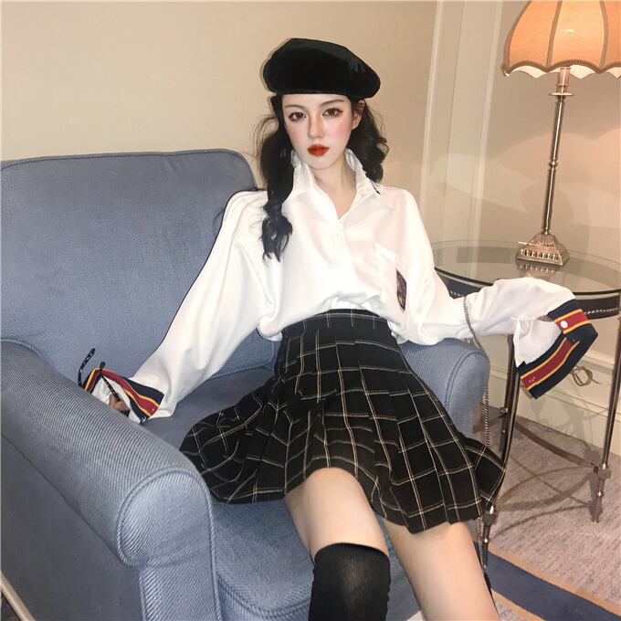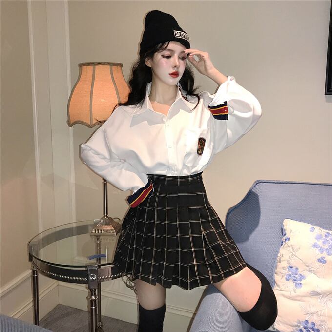 スプリングルーズシャツ ハイウェストプリーツスカート レディース ロング レッド 刺繍 春物 ステッチ ドラファッションホール11987599878