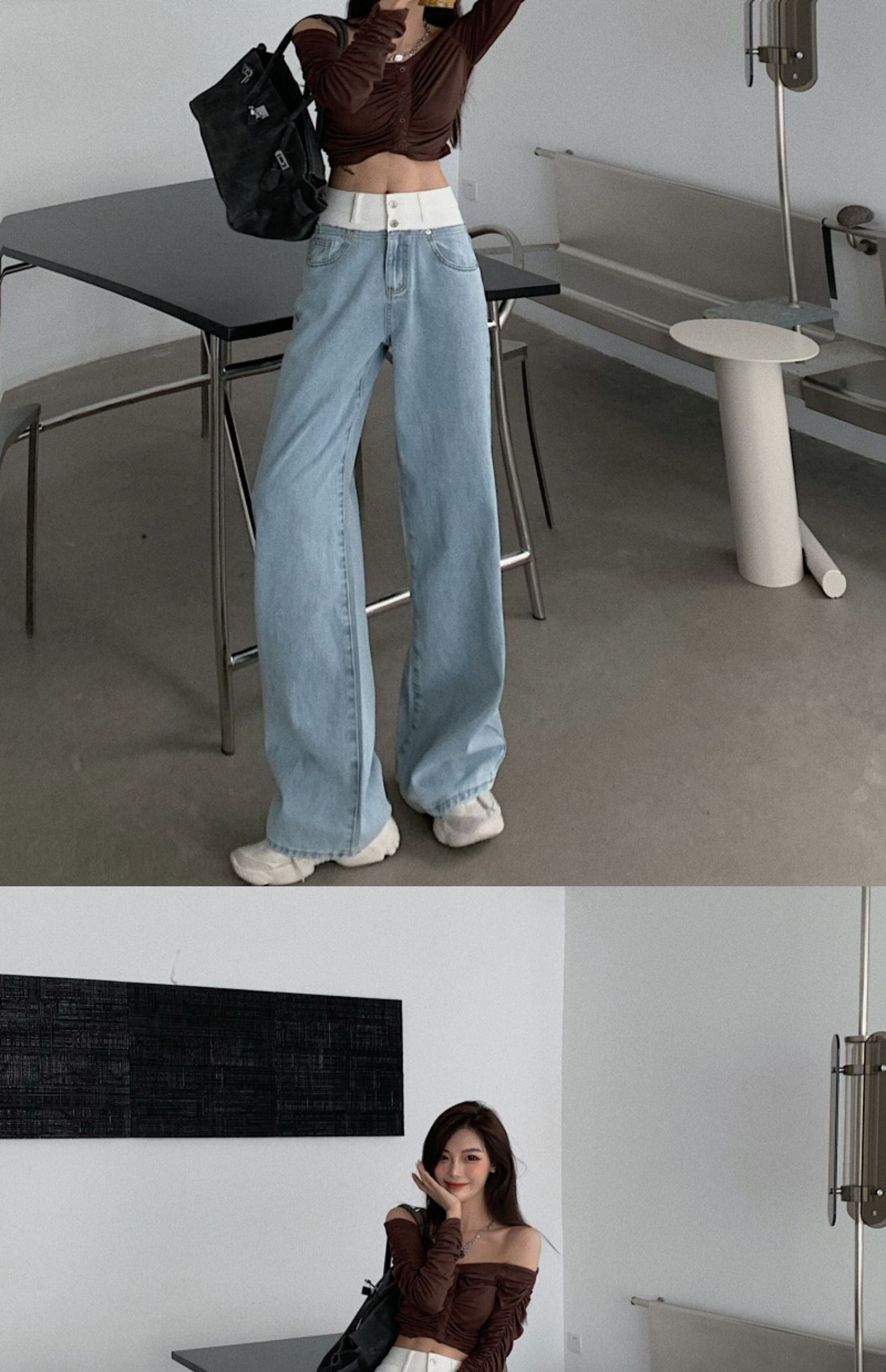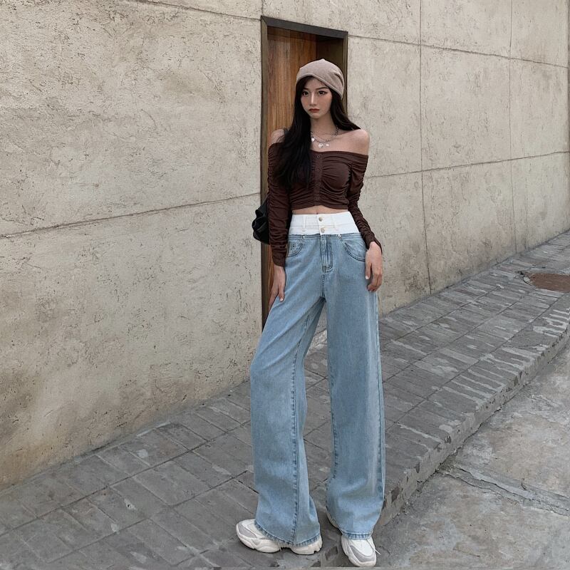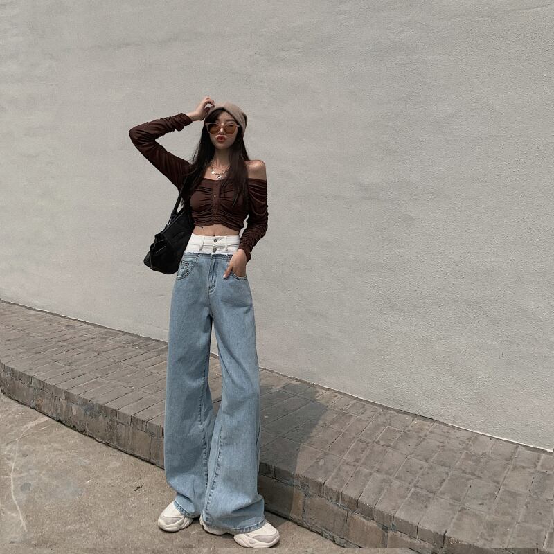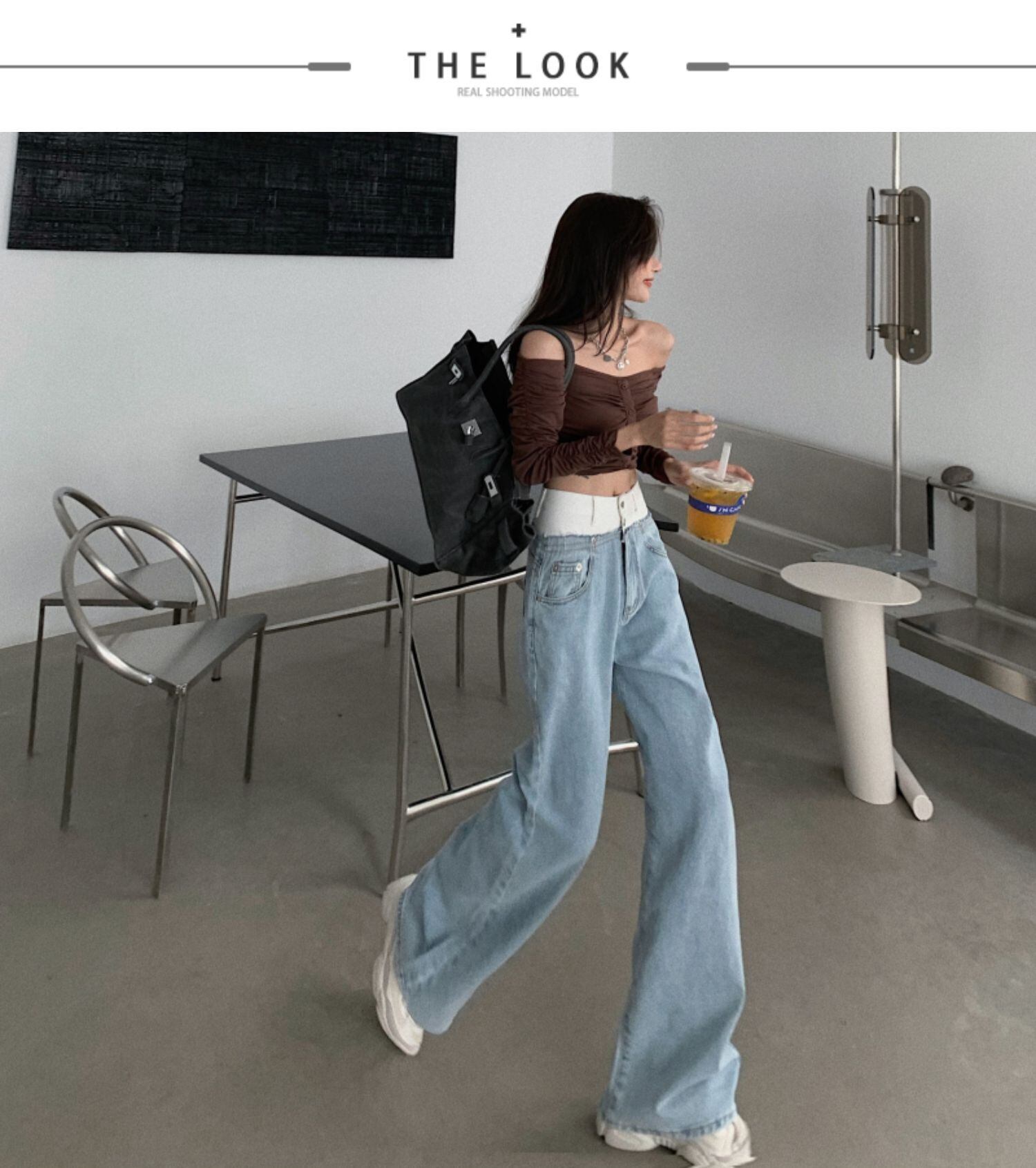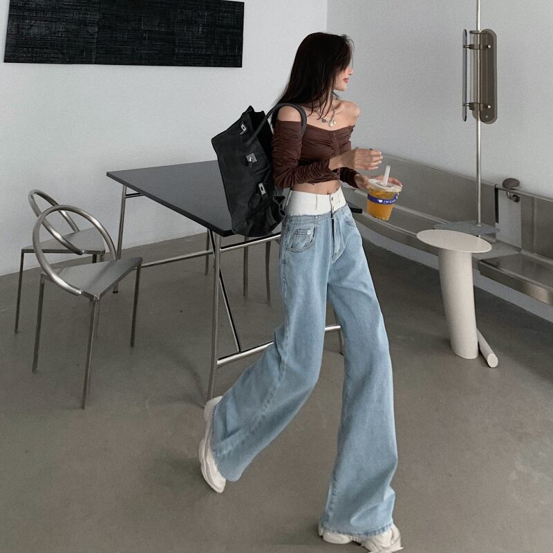 カラーハイウェストウェストジーンズ レディーススタイルロングパンツ ステッチ ドラファッションホール25222100762