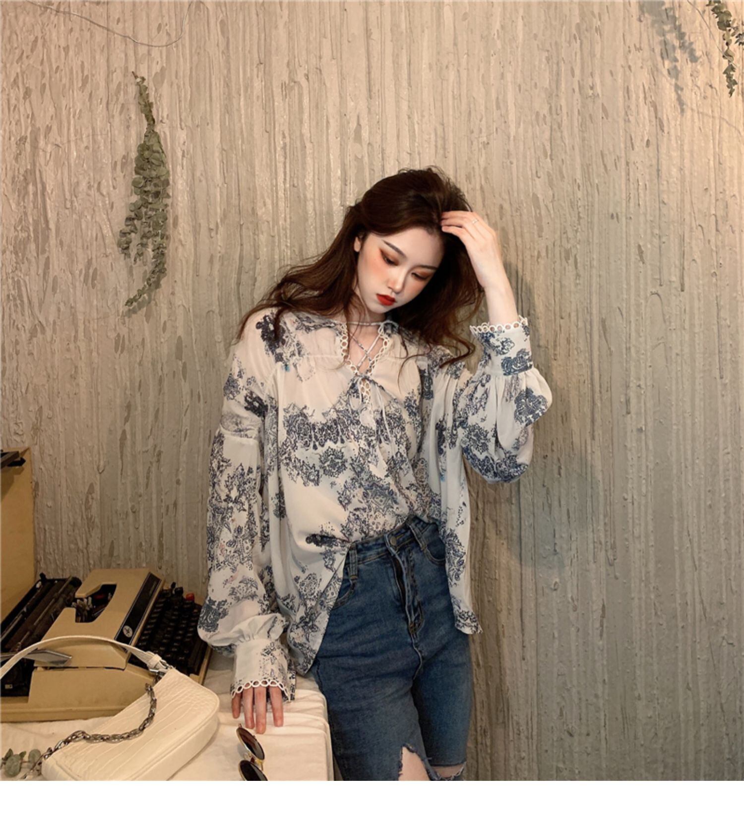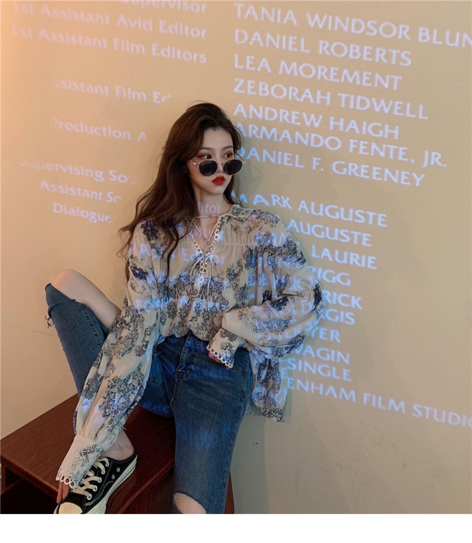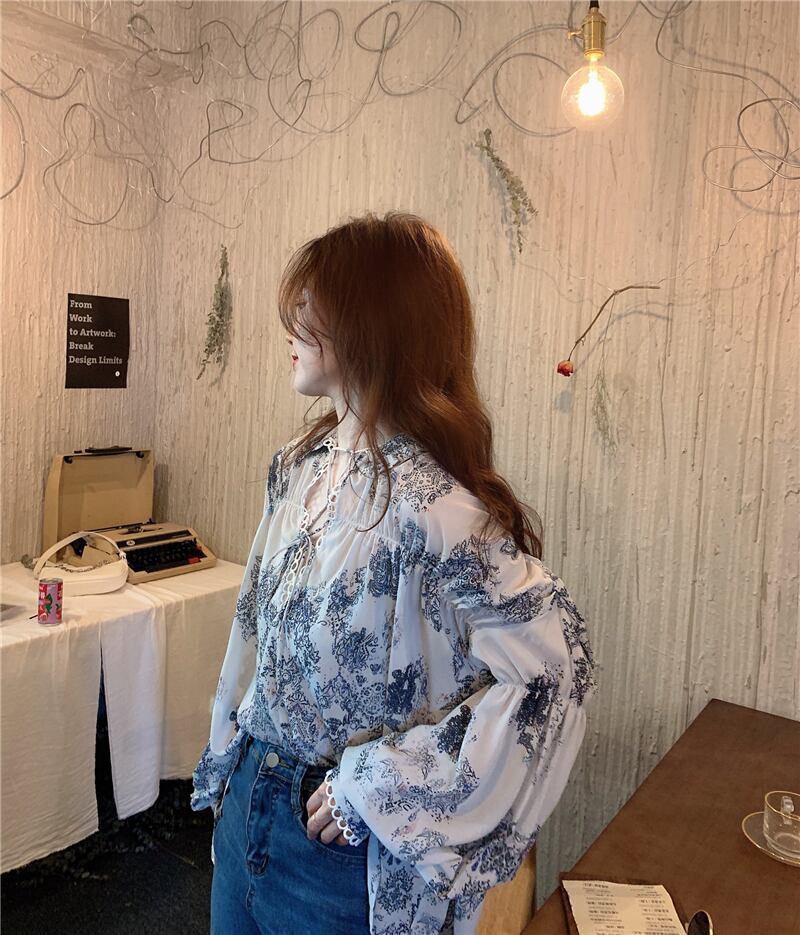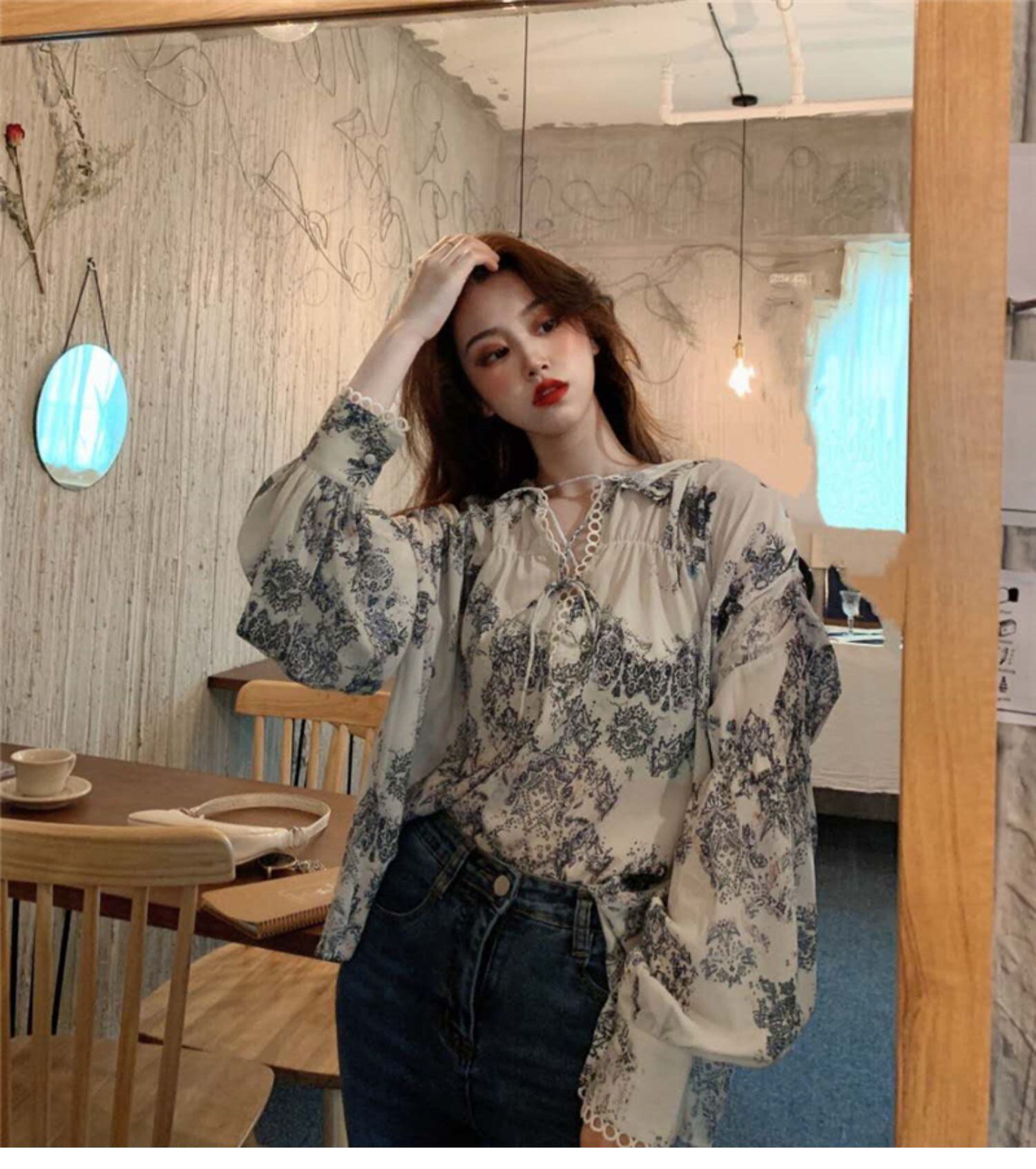 Flowerデザイン シャツ レディーススタンダードスプリングレーススリーブルーズトップス ランタンスリーブ レトロ 春物 フラワーデザイン ドラファッションホール78590956859