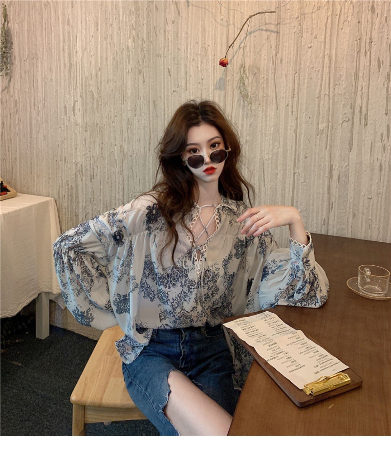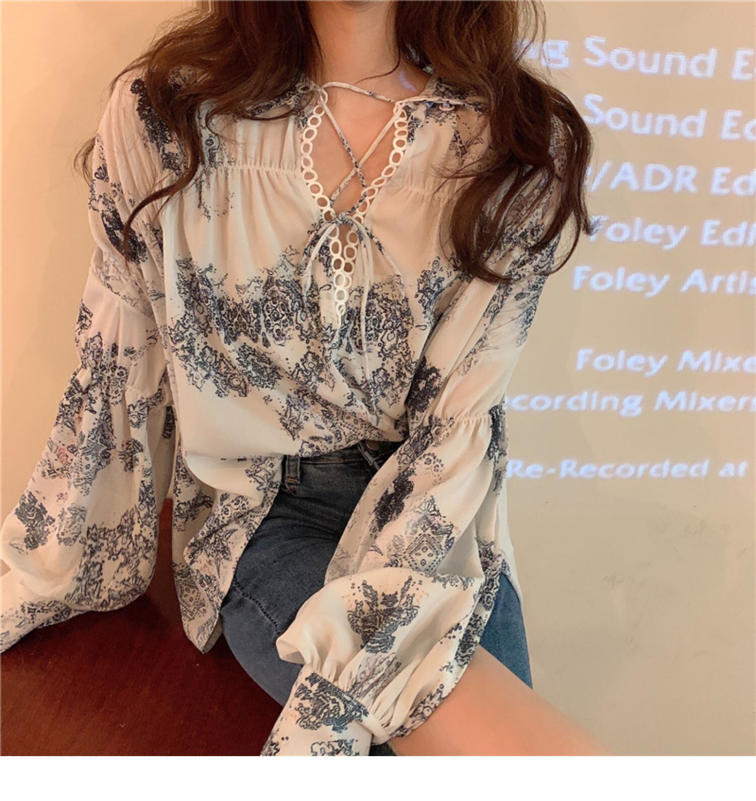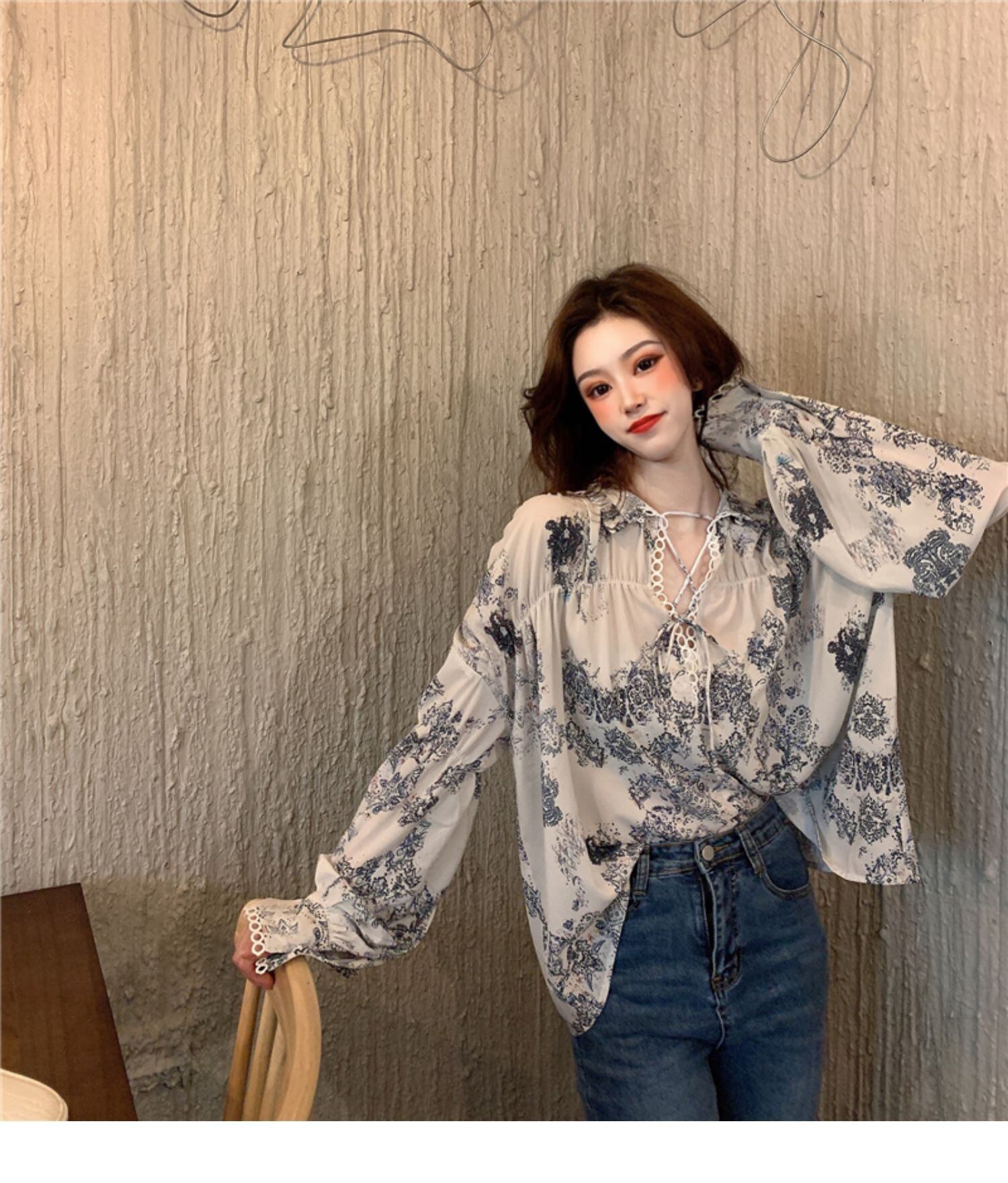 Flowerデザイン シャツ レディーススタンダードスプリングレーススリーブルーズトップス ランタンスリーブ レトロ 春物 フラワーデザイン ドラファッションホール78590956859