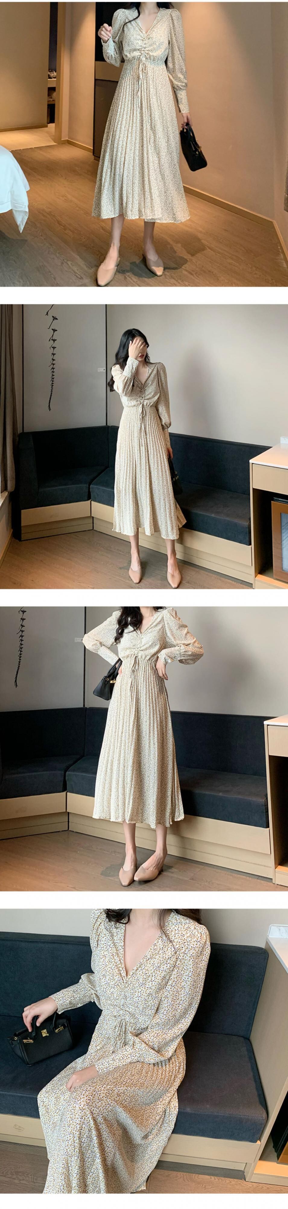 フローラルドレス スプリングスタイルスタンダードVネックギャザープリーツスカート ロング レトロ 春物 花柄 ドラファッションホール30978349552