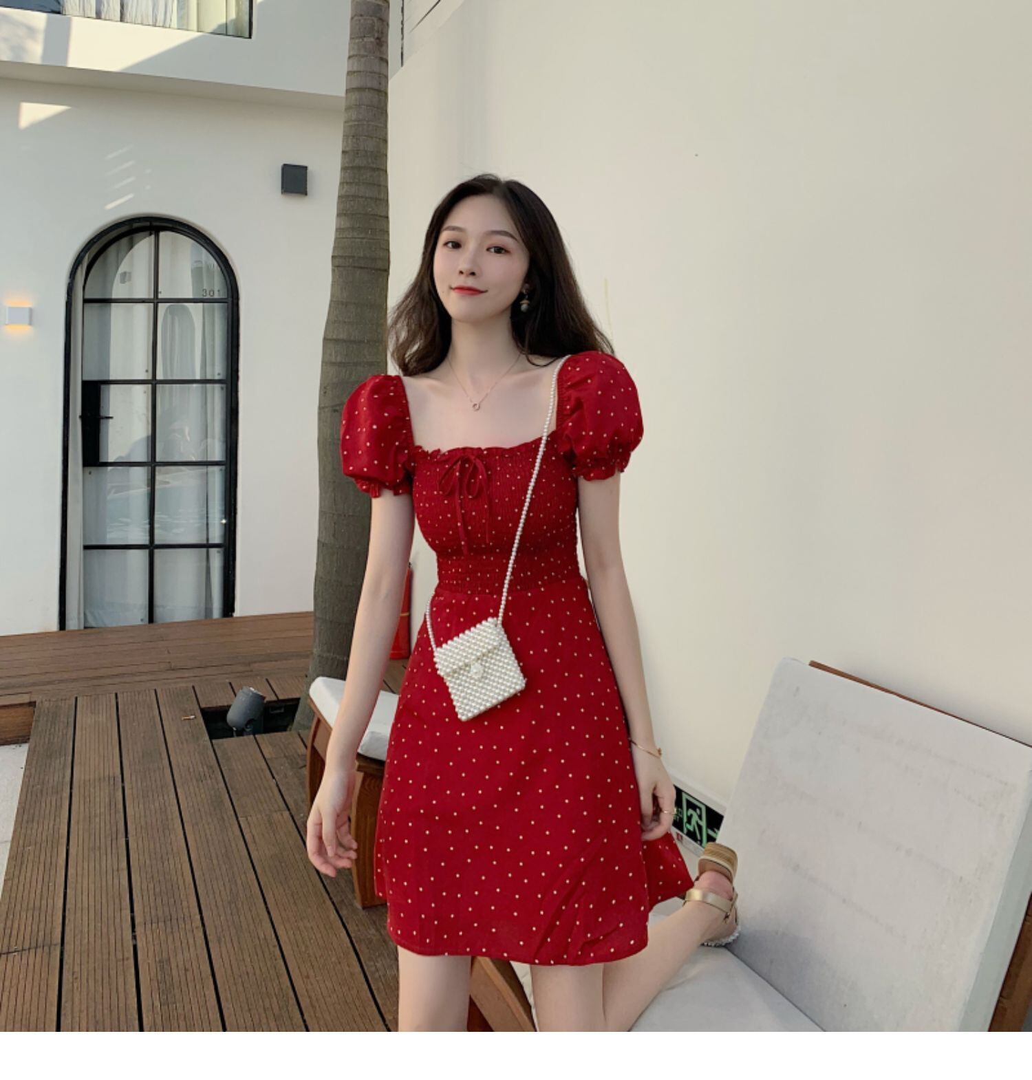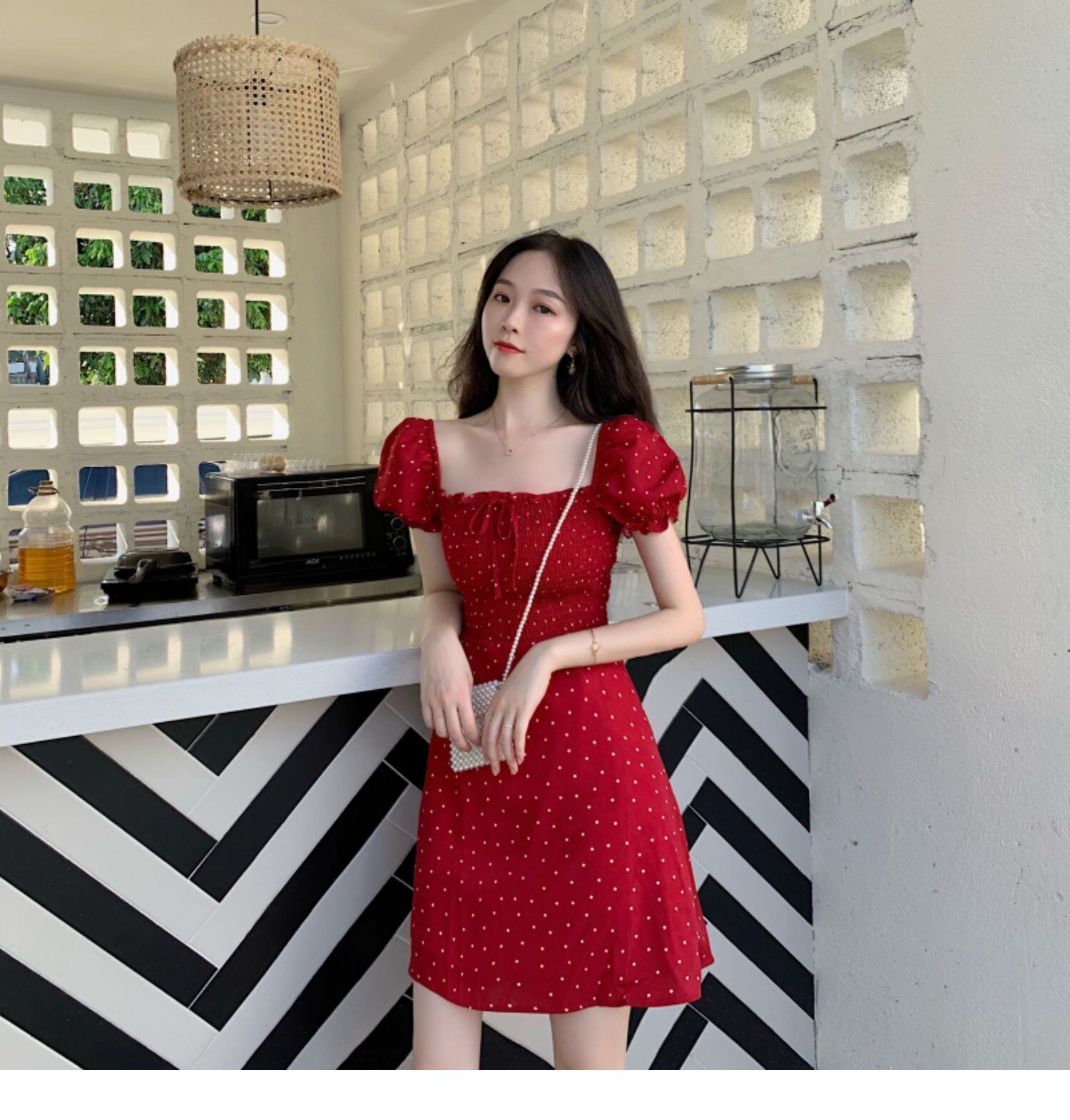 スリーブドレス サマースタンダードカラーウェストAラインスカート レトロ 夏物 スクウェア ドラファッションホール70337110073