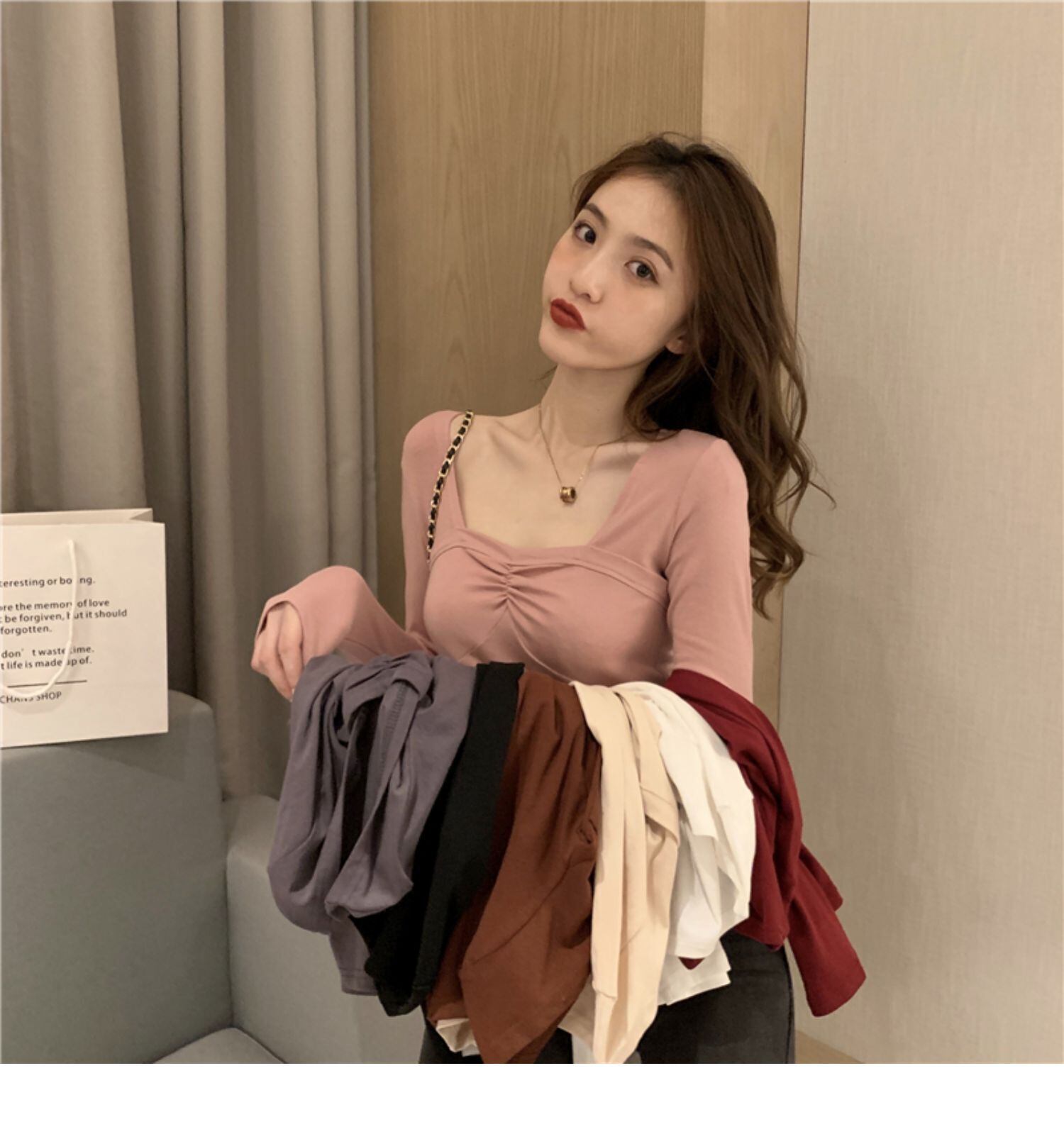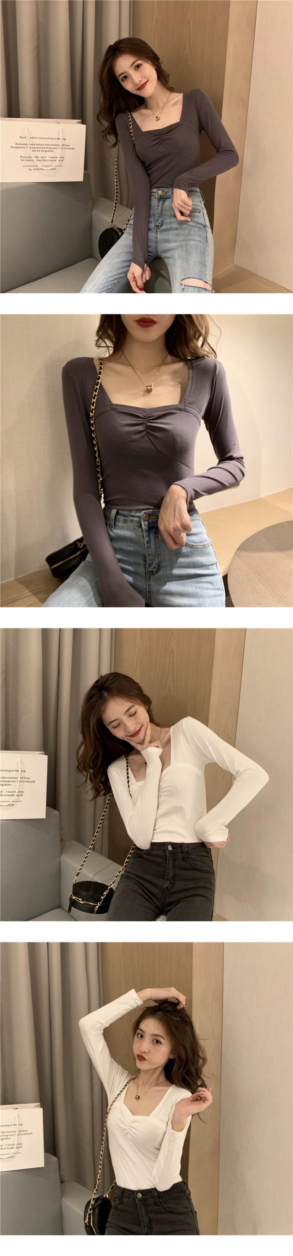 スリムシャツ スプリングレッドトップス スタイルソリッド カラーTシャツ ロング 春物 ソリッドカラー スクウェア ドラファッションホール66182911474