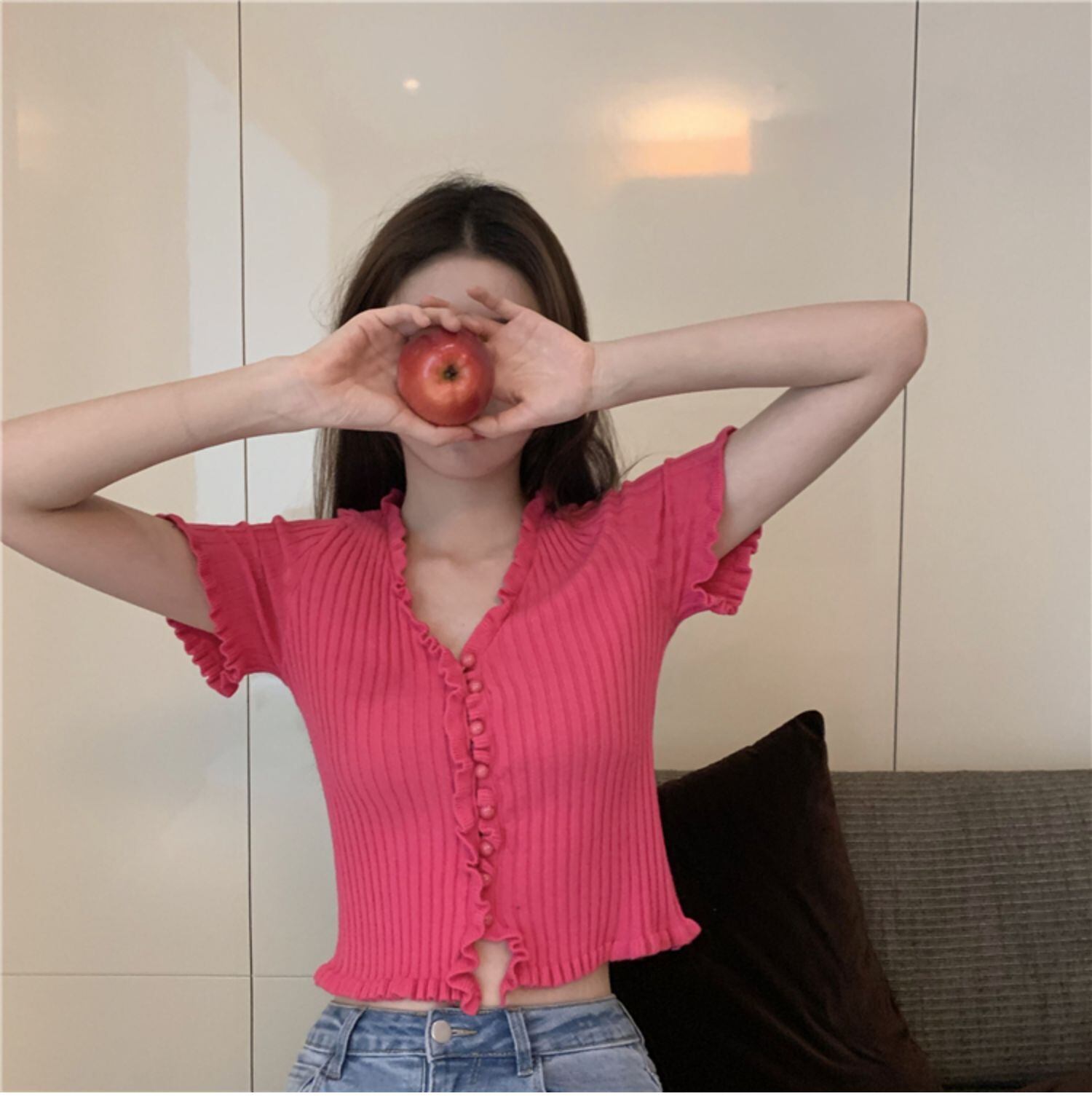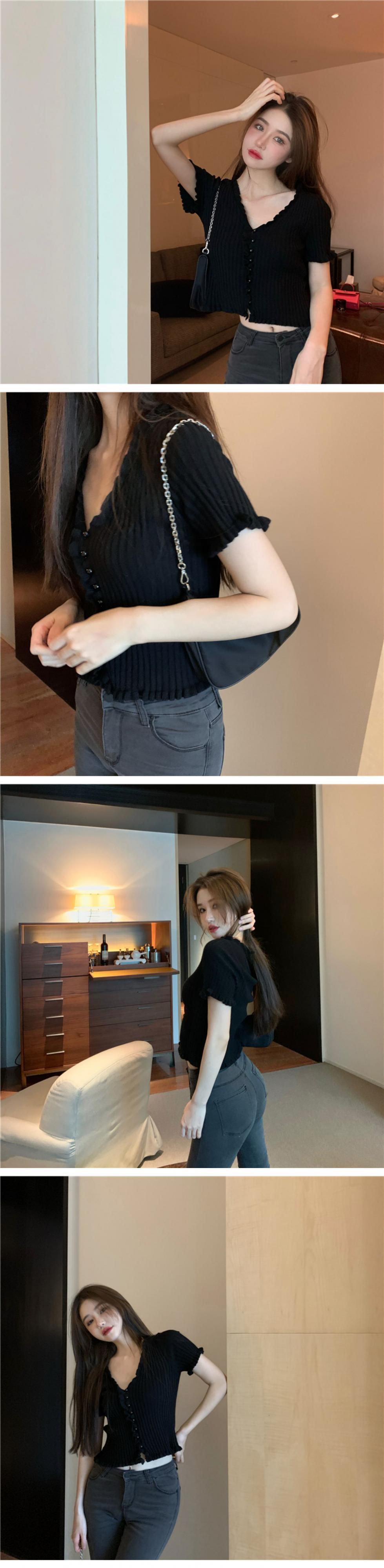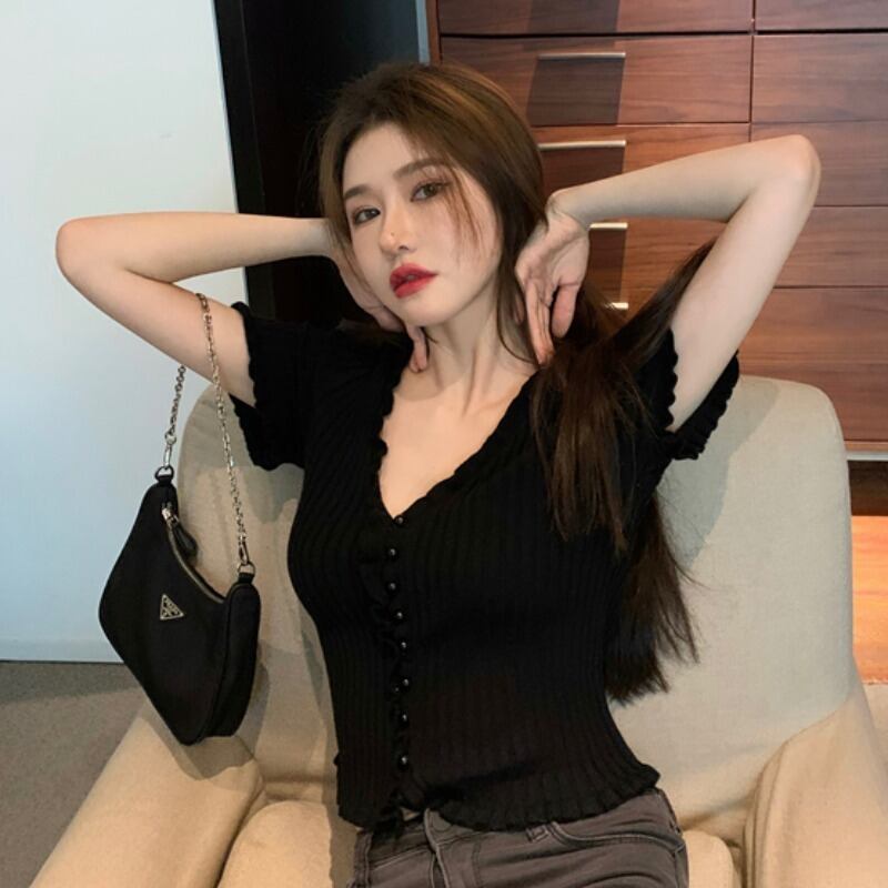 ブラウス スプリングサマーVネックショートニットセーター スリム 春物 夏物 ドラファッションホール34266741204