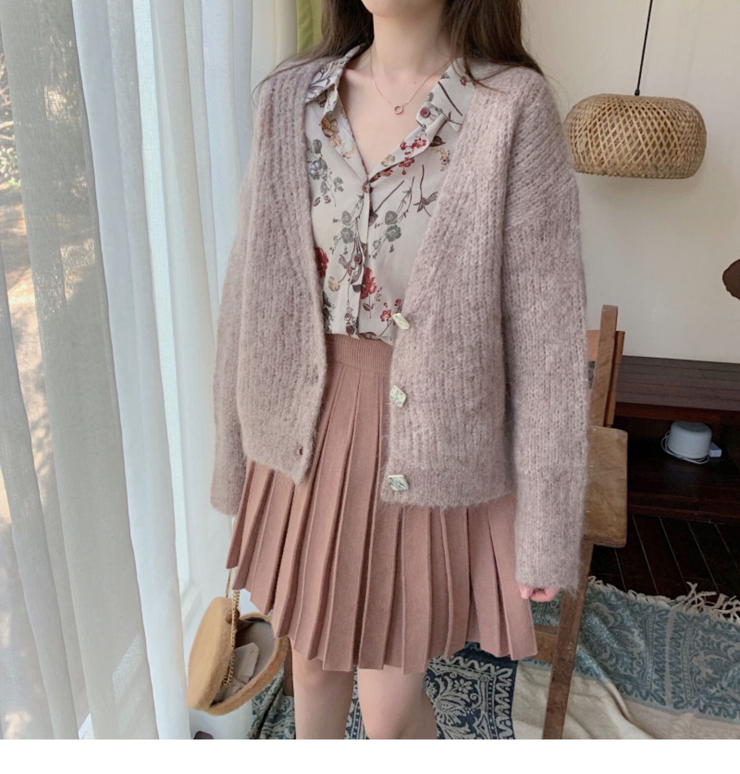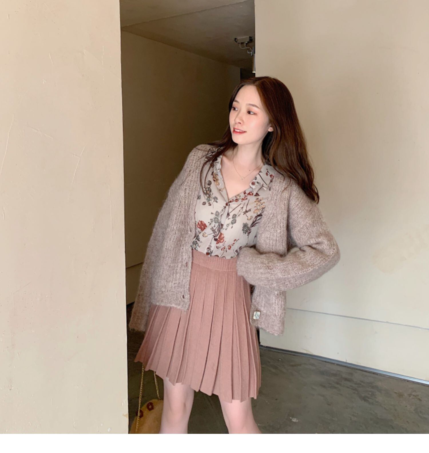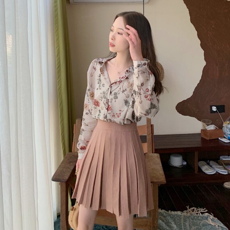 フローラルシャツ レディーススタンダードスプリングハイウェストニットプリーツスカート セット レトロ 春物 花柄 ドラファッションホール22361427299