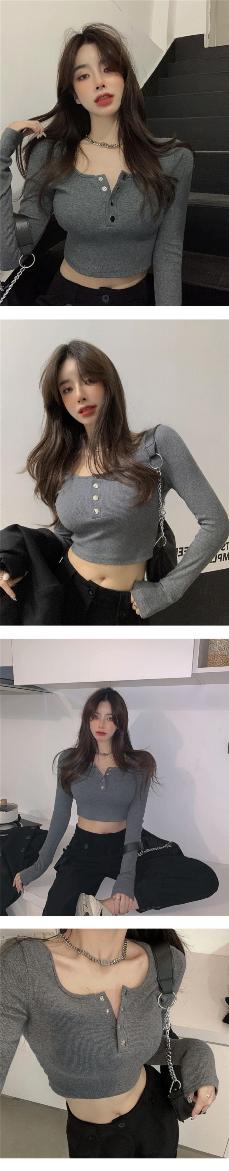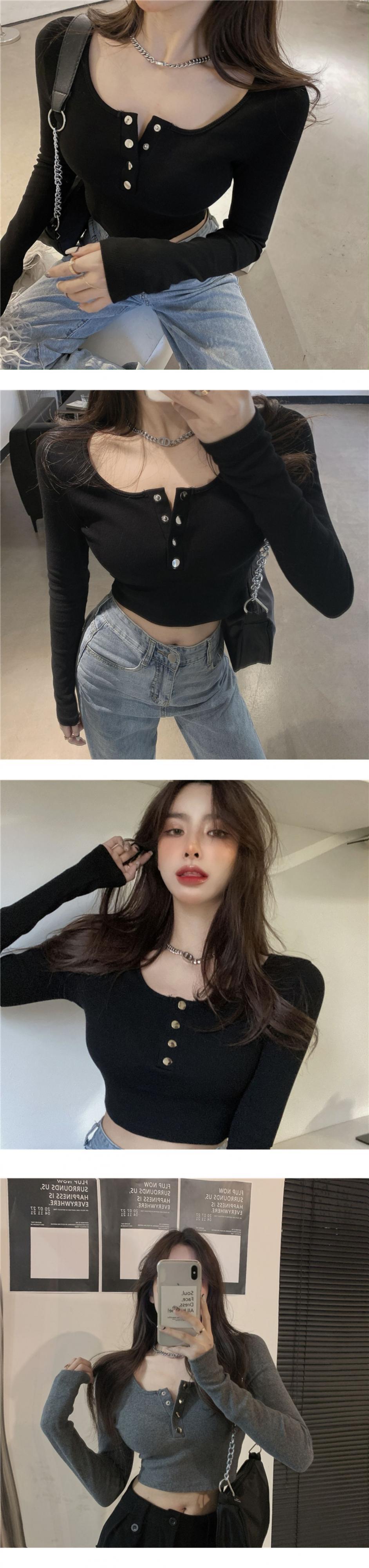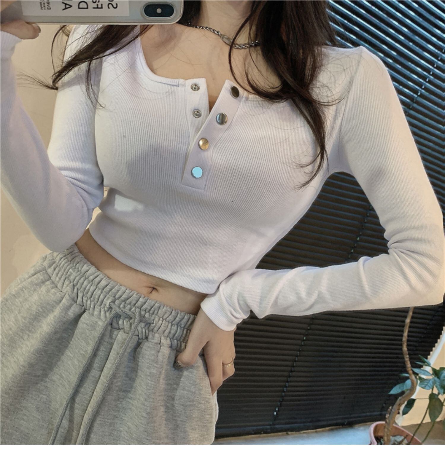 ボタントップス スプリングラウンドネックニットTシャツ シャツ スリム ロング 春物 Oネック ドラファッションホール63131032856