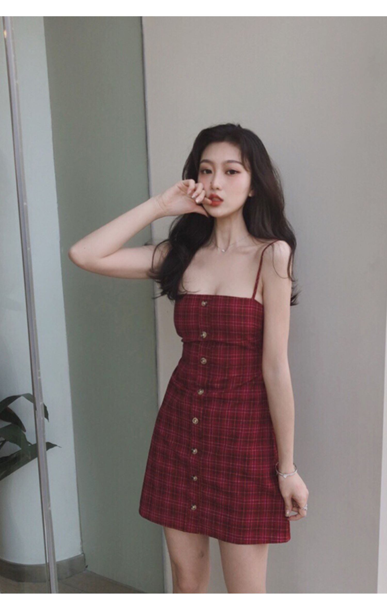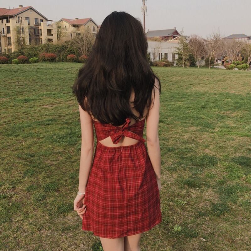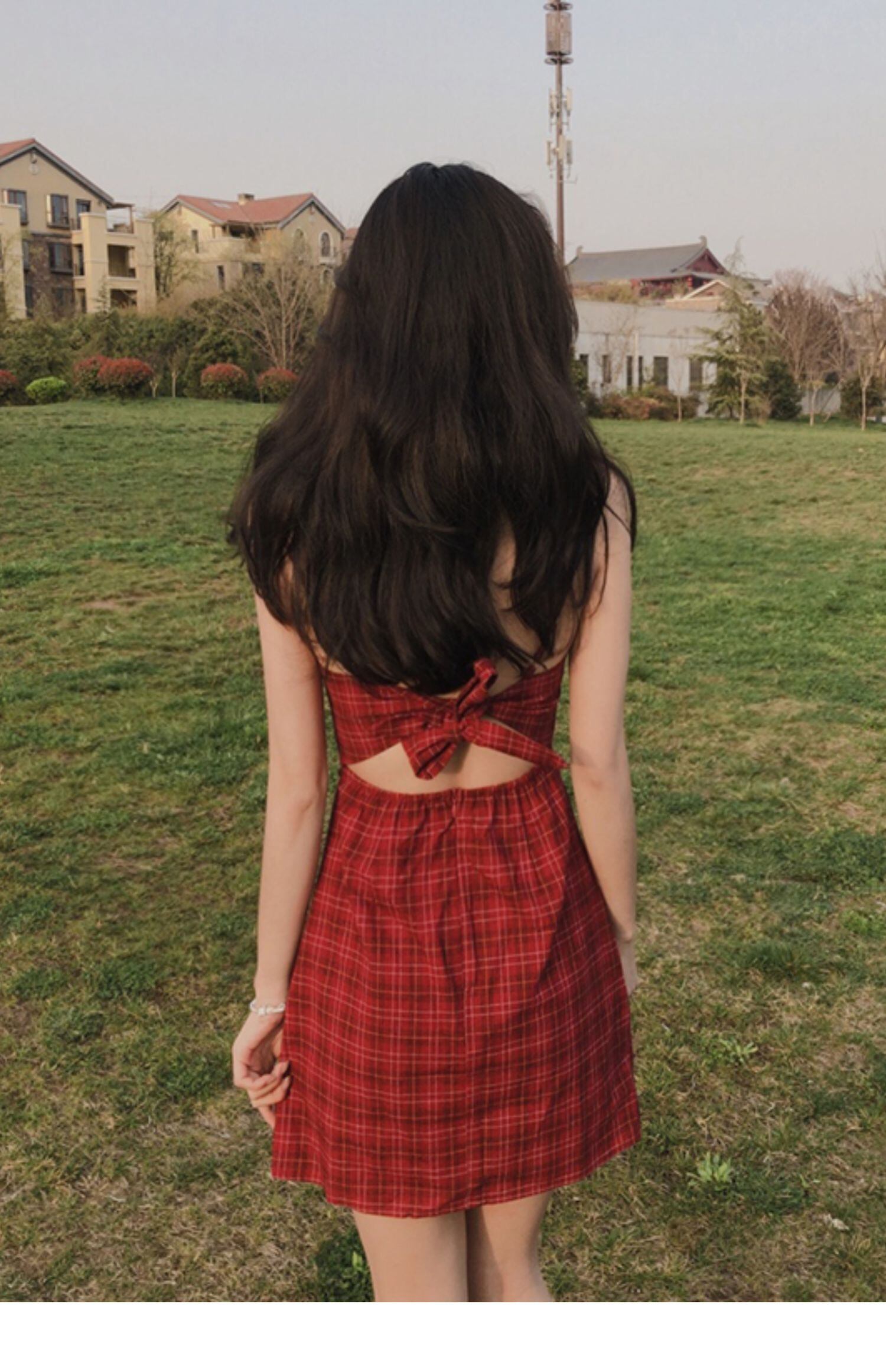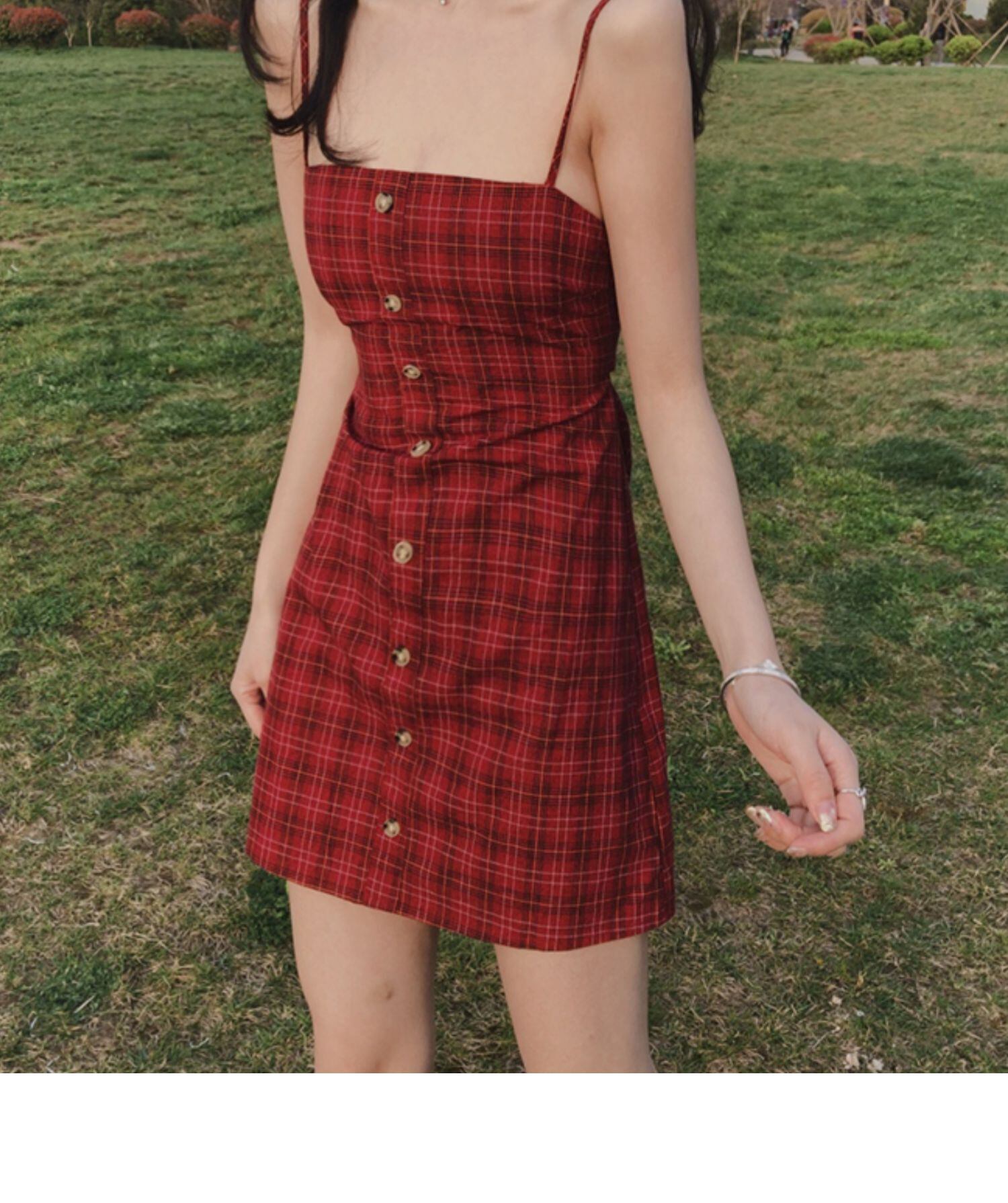 スプリングサマースタンダード格子柄ドレス レースホルタースカート トップス レトロ 春物 夏物 ドラファッションホール60364146968