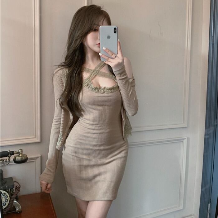 レディースオータムウィンタースリムレースドレス スタイルカーディガンレッド 秋物 冬物 ドラファッションホール99072934818