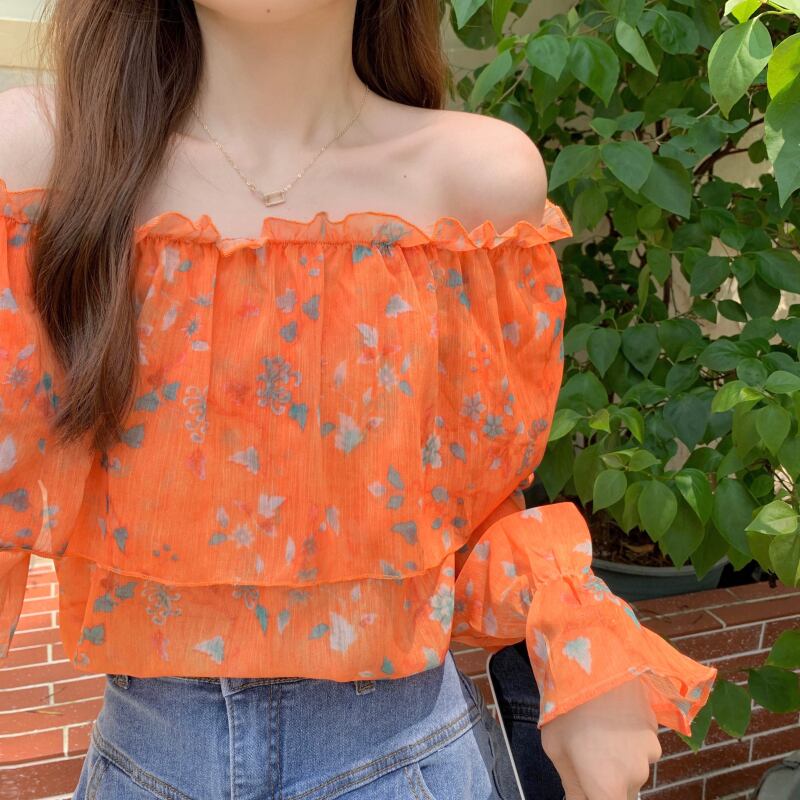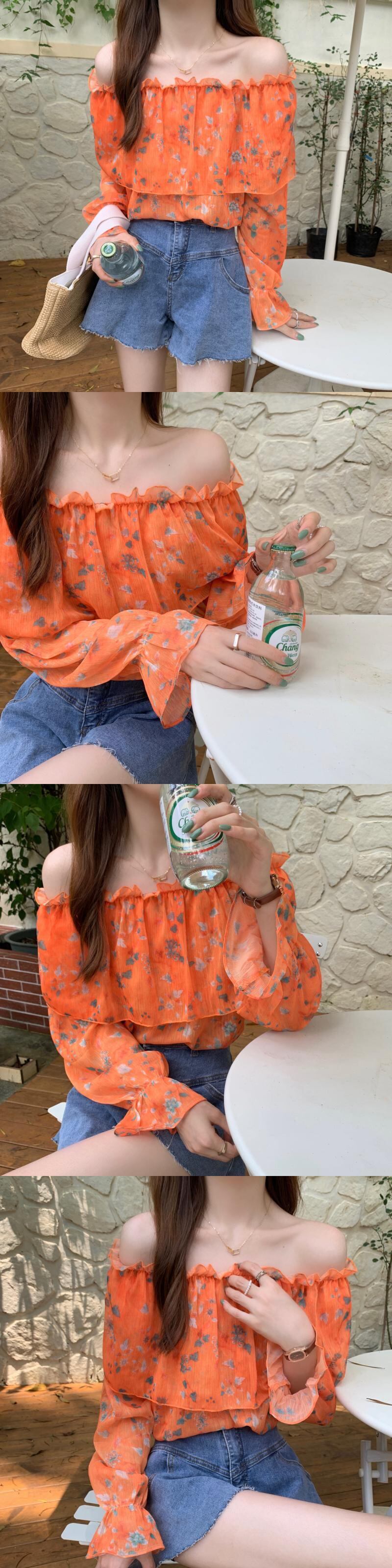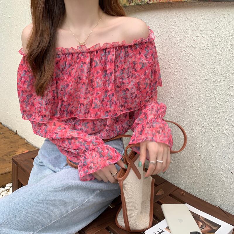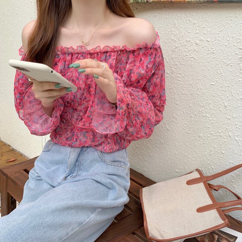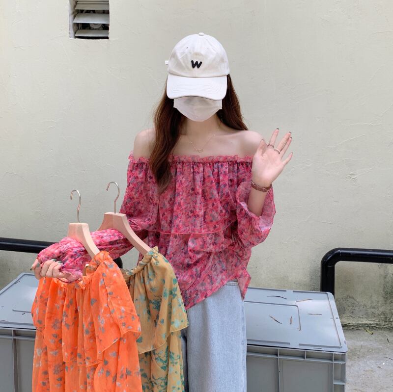 フローラルシフォンブラウス サマー薄手 大人ガーリー スウィート キュート カジュアル 夏物 花柄 オフショルダー ドラファッションホール56332231167