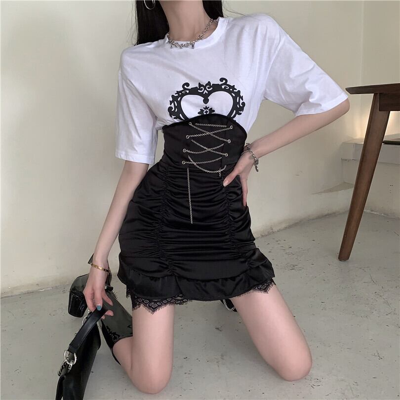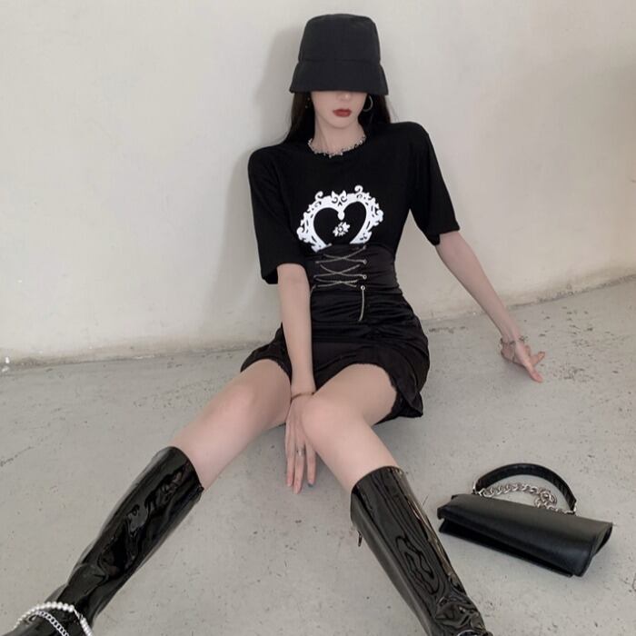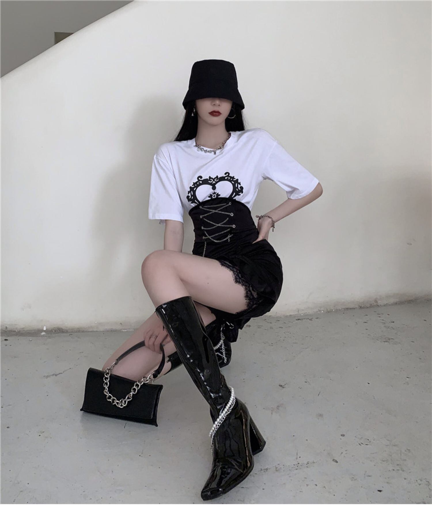 プリントTシャツ トップス レディースサマーハイウェストウェストレーススカート ストリート 夏物 ステッチ ドラファッションホール39454677442
