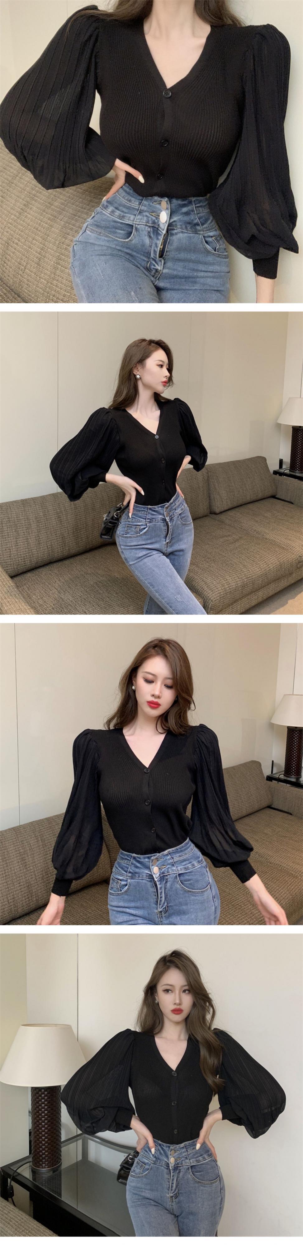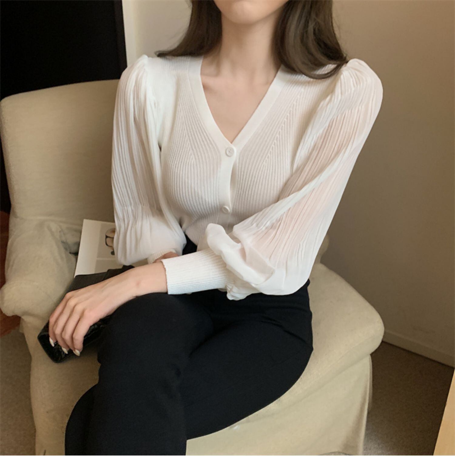 オータム薄手ニットセーター Vネックメッシュスリーブカーディガントップス レディース ロング ランタンスリーブ 秋物 ドラファッションホール52874068915