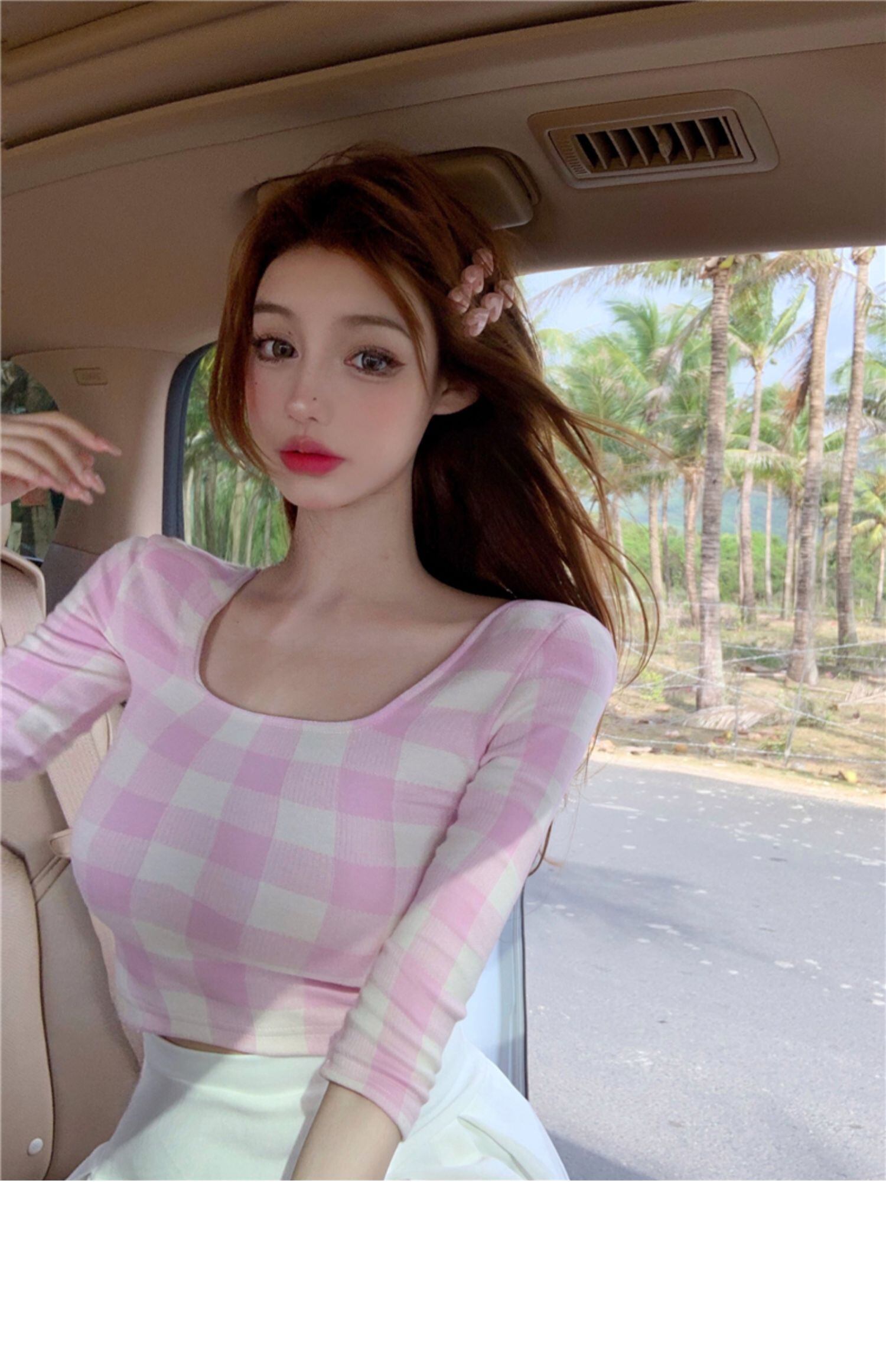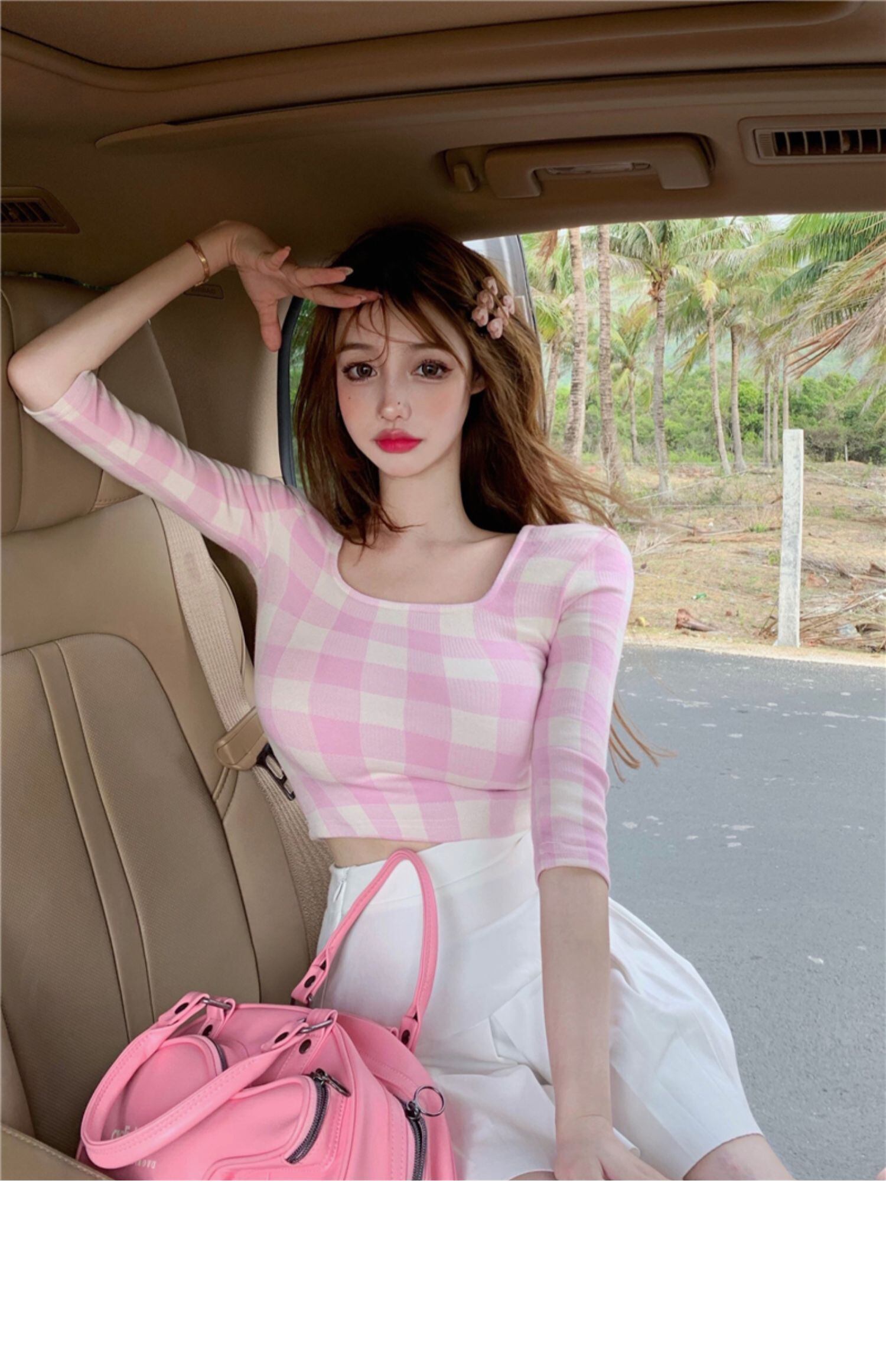 サマースタイルスタンダードレッドショート格子柄トップス Tシャツ レディース レトロ 夏物 スクウェア ドラファッションホール46547304548