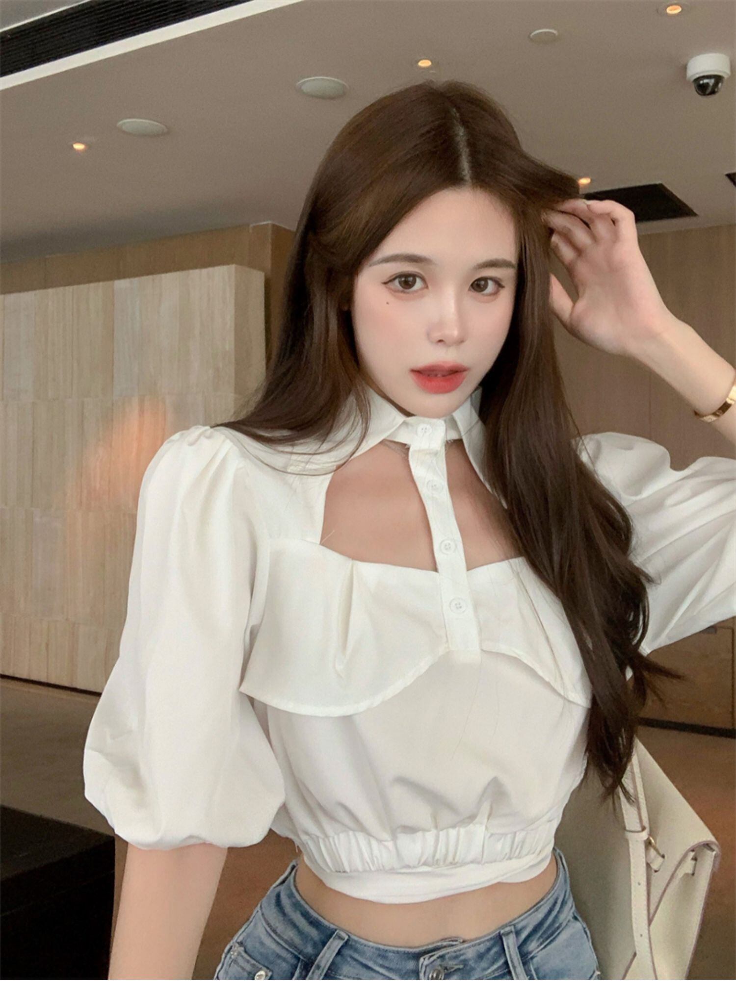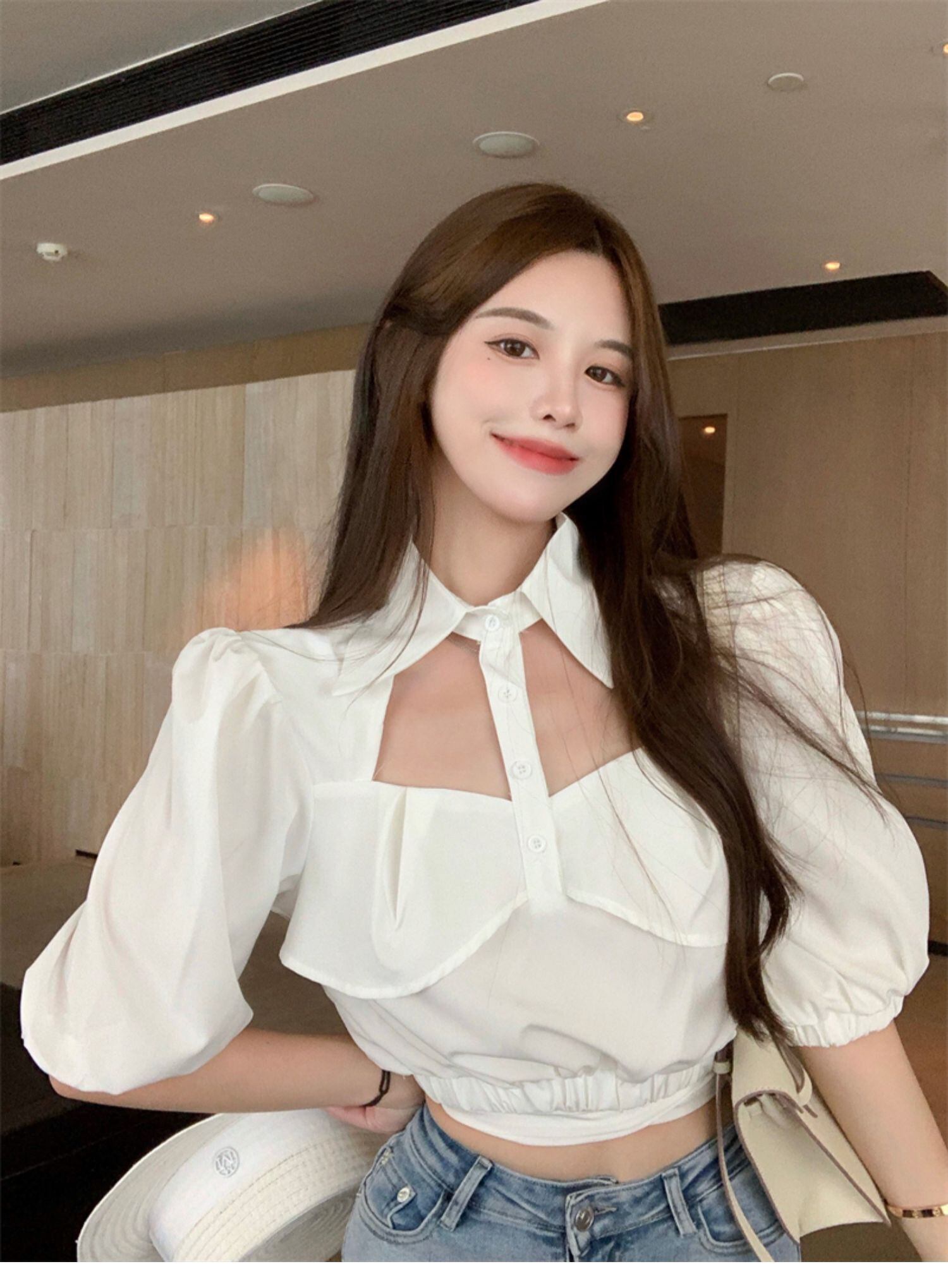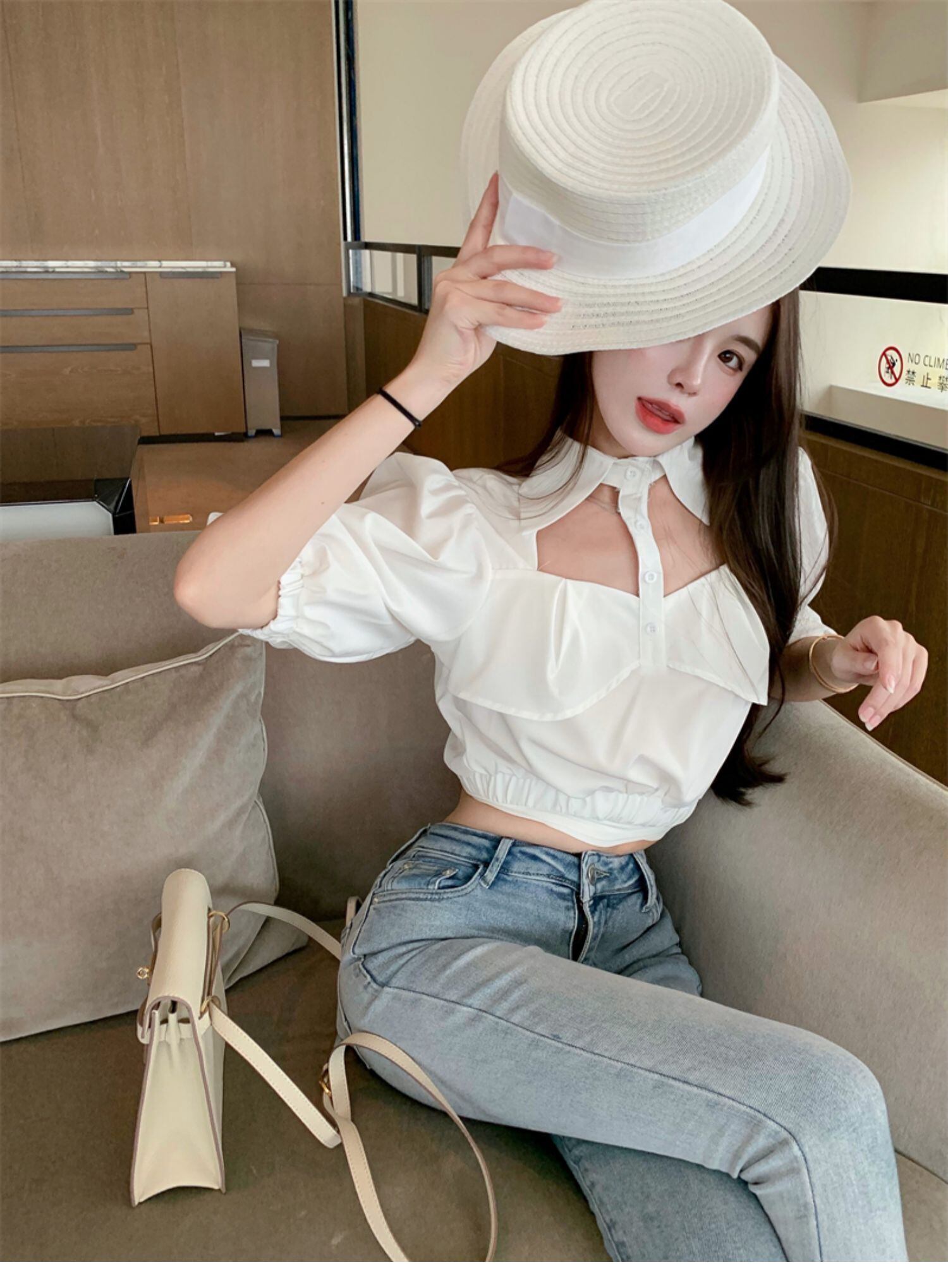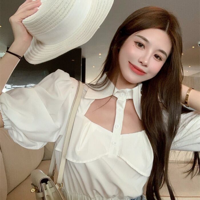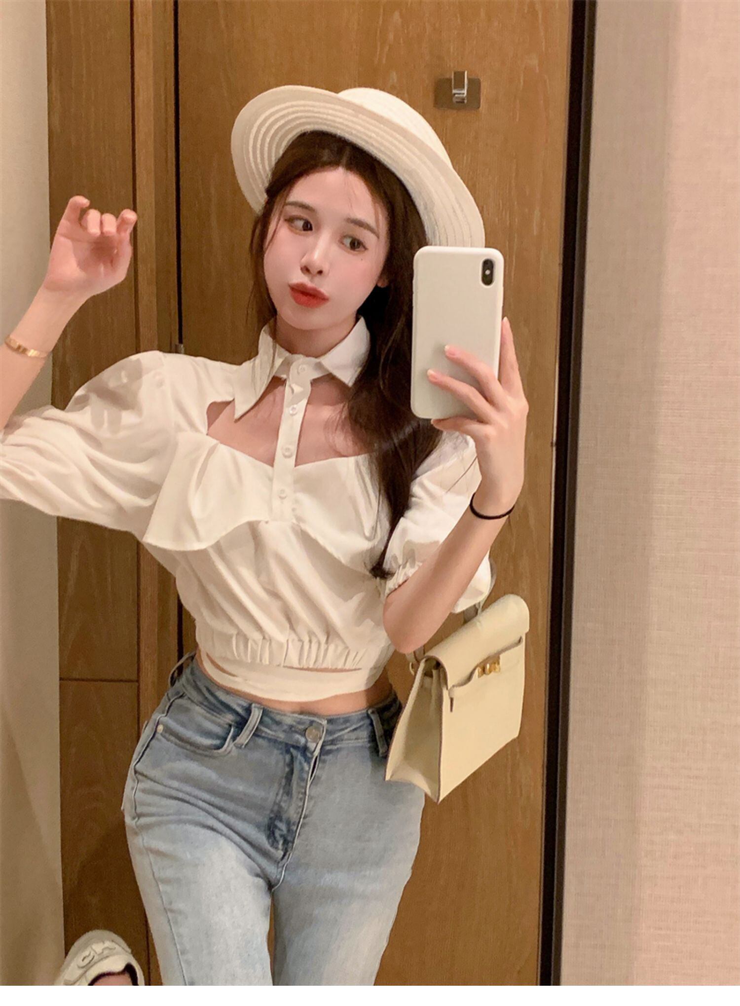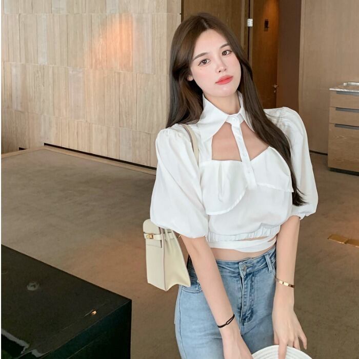 ホワイトスタンダードショートトップス サマーハイウェストスリーブシャツ レトロ 夏物 ドラファッションホール77916852123