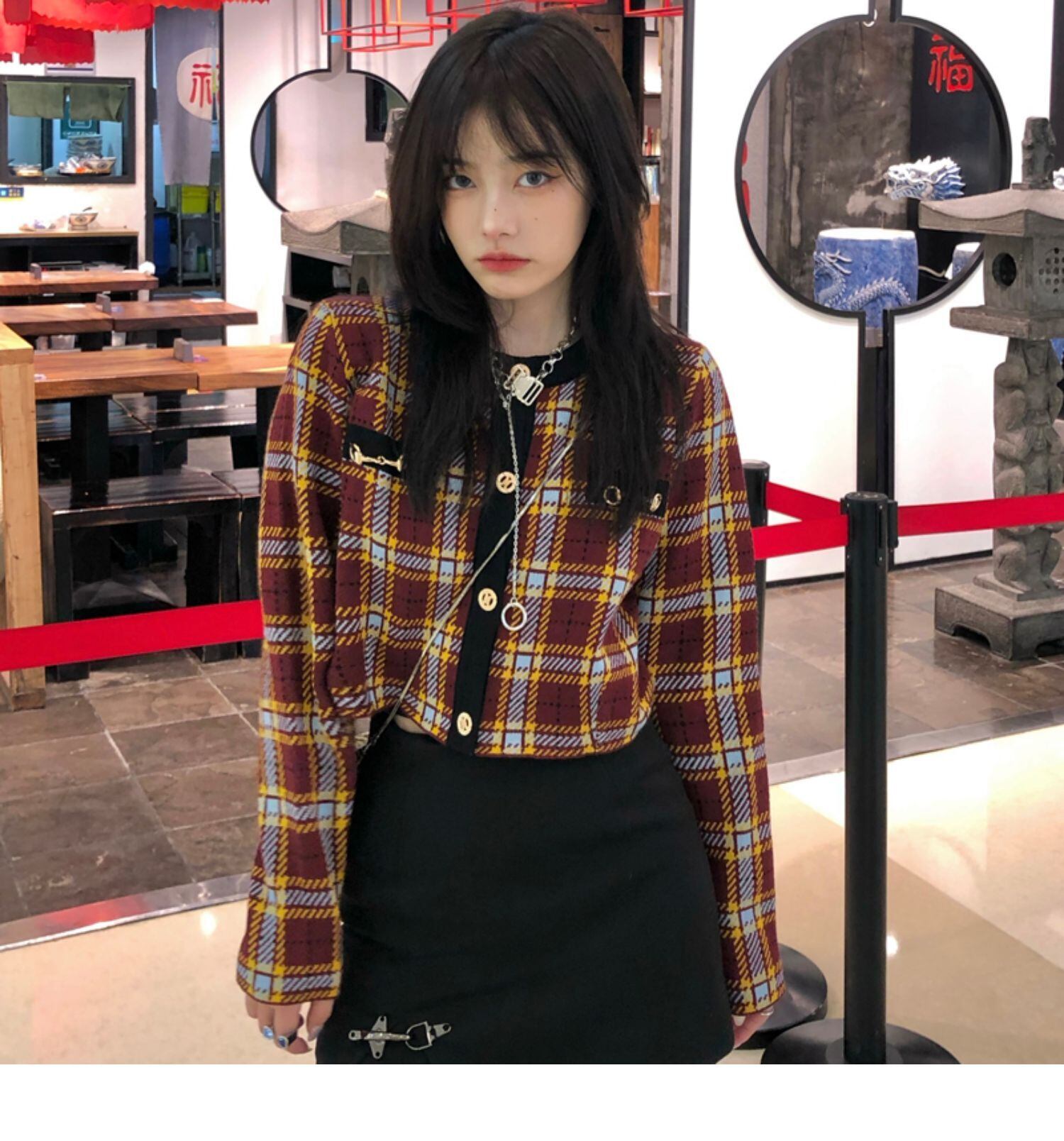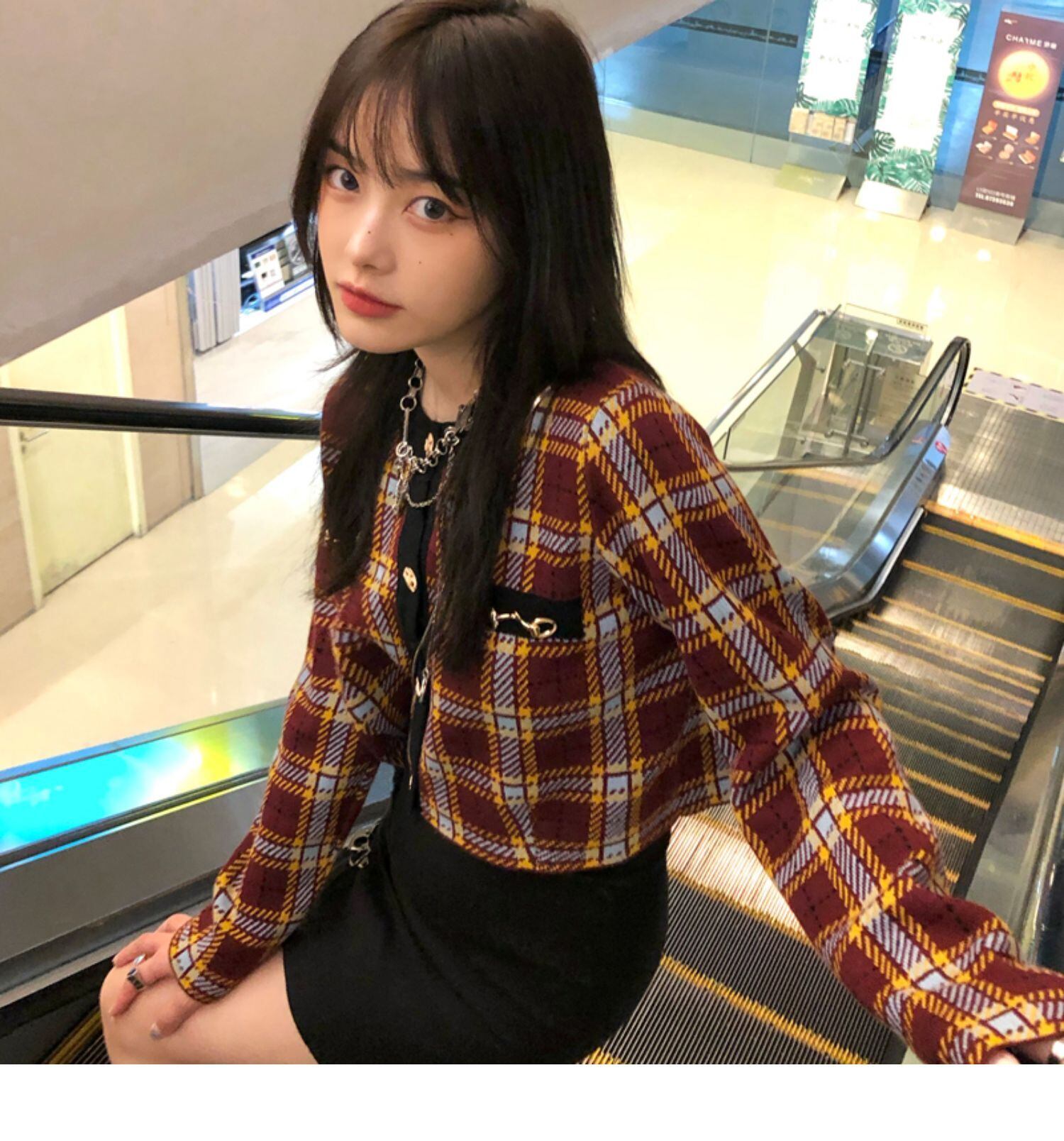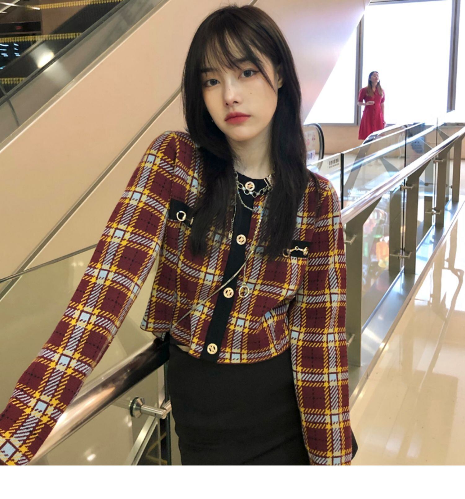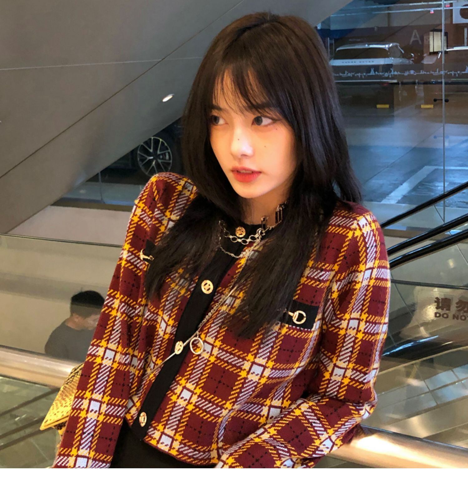 オータムレッドスタンダード格子柄ニットセーター カーディガンスタイルショートジャケット レディース ロング レトロ 秋物 ドラファッションホール10197010527