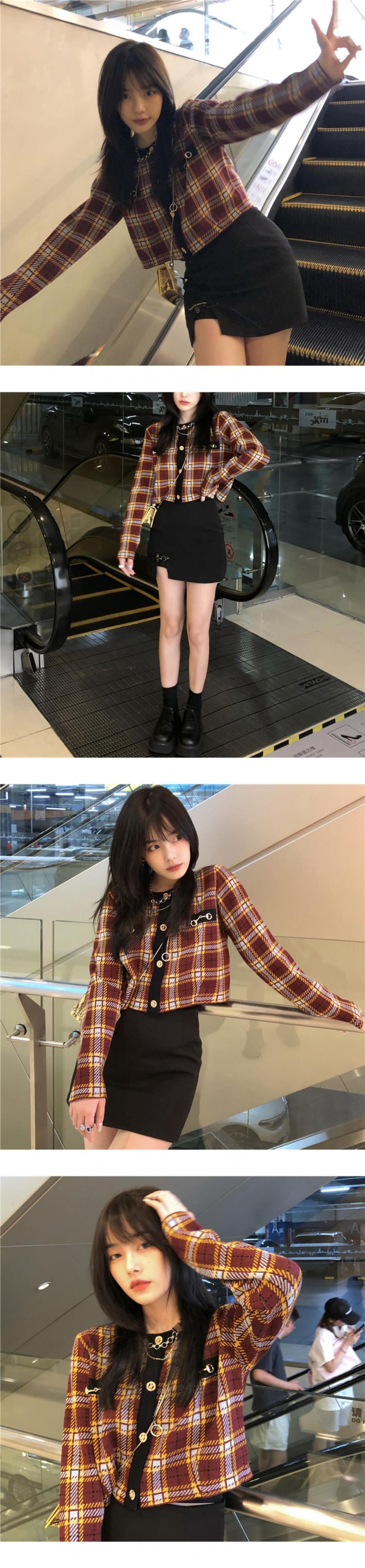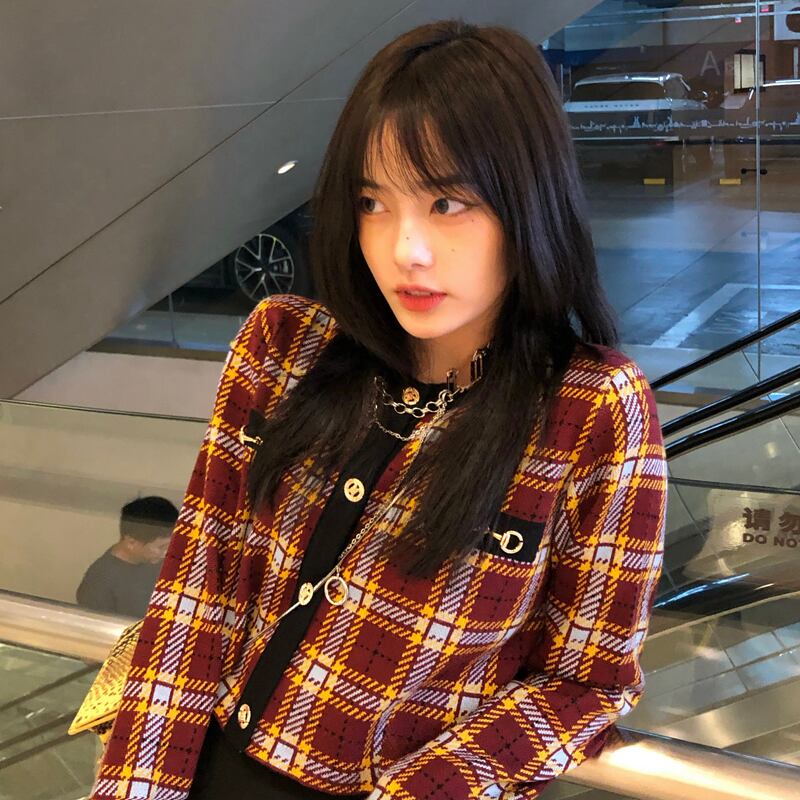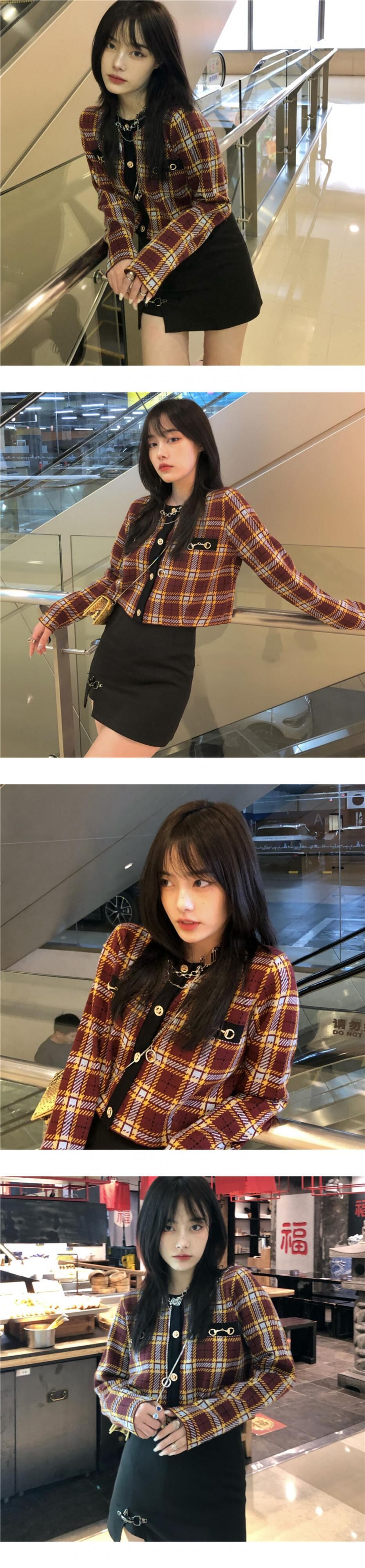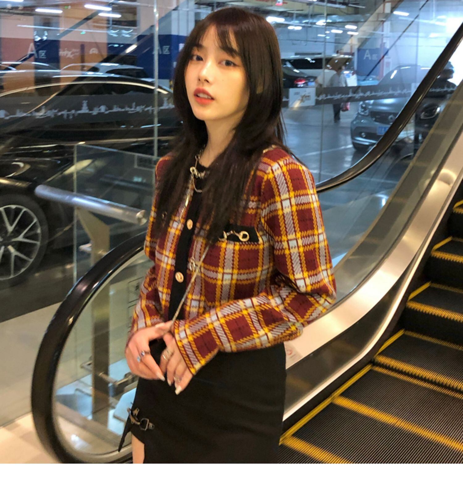 オータムレッドスタンダード格子柄ニットセーター カーディガンスタイルショートジャケット レディース ロング レトロ 秋物 ドラファッションホール10197010527