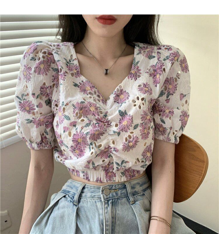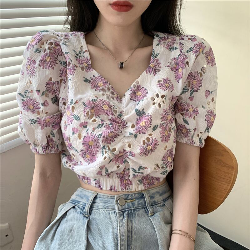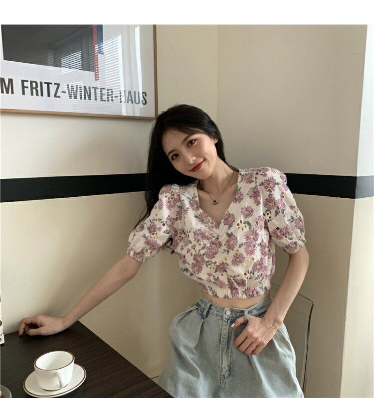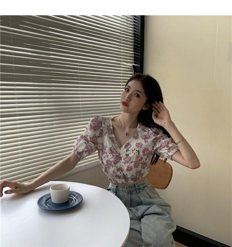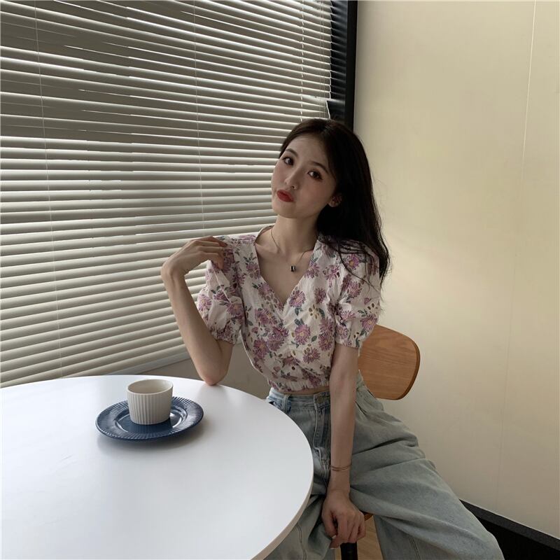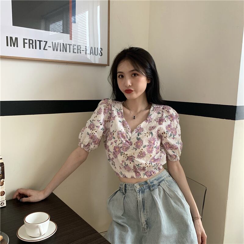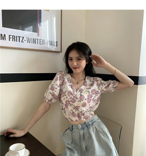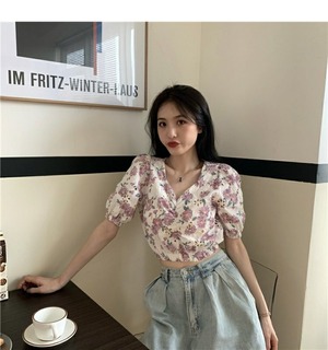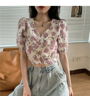 サマーフローラルシャツ スリーブショートウェストトップス 夏物 花柄 ドラファッションホール99783251421