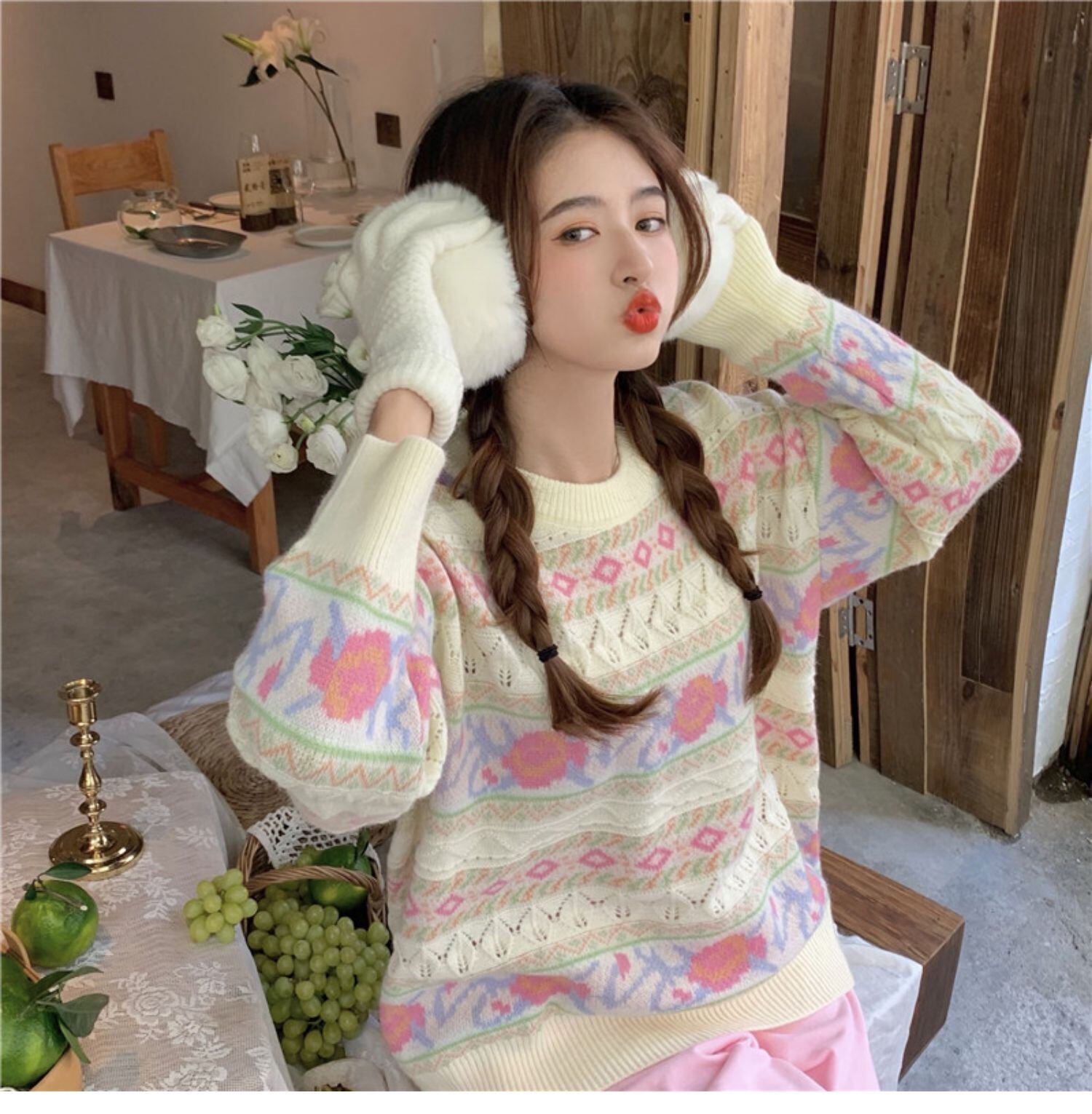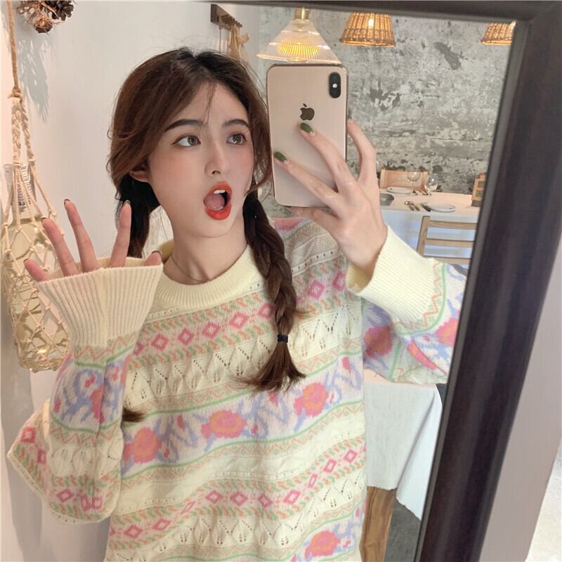 スタンダードジャカードルーズニットセーター レディース レトロ 大人ガーリー スウィート キュート カジュアル ドラファッションホール41564081669