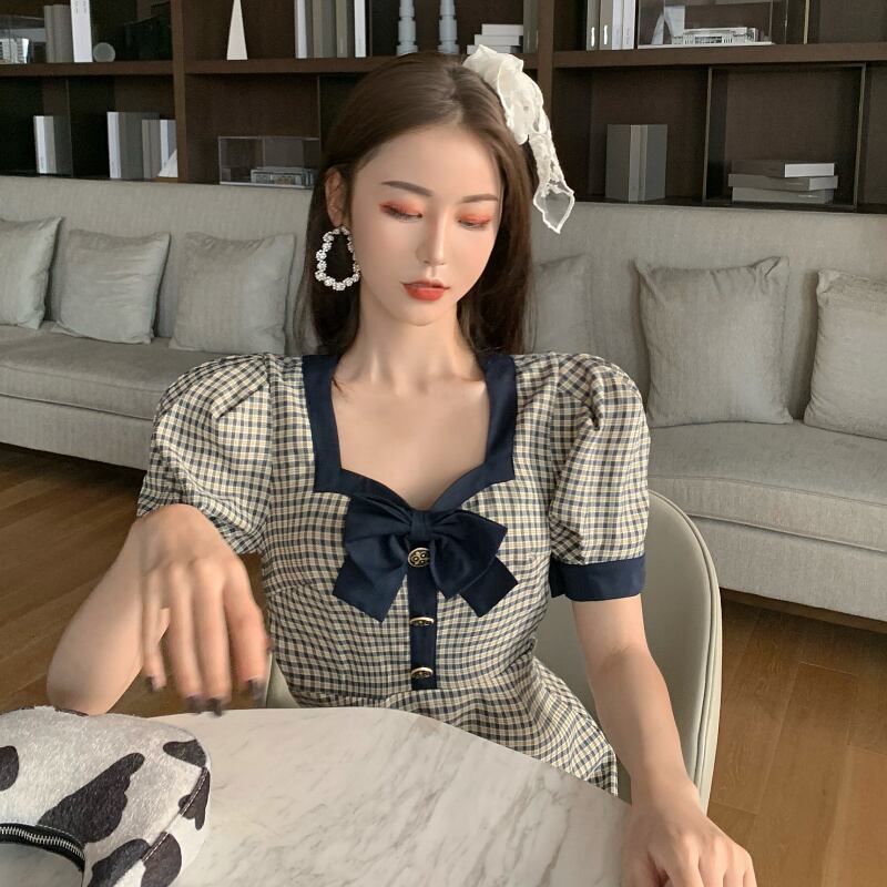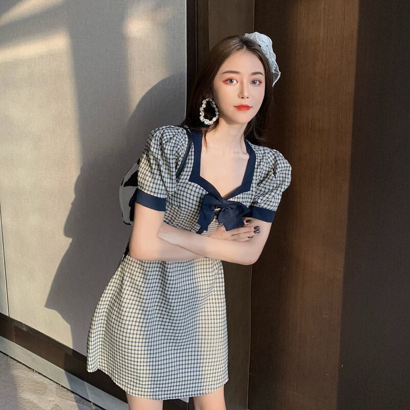 スプリングサマースタンダードスリーブ格子柄ドレス リボンスカート レトロ 春物 夏物 スクウェア ドラファッションホール79962961758