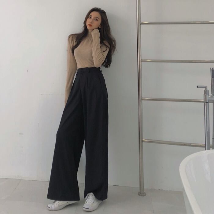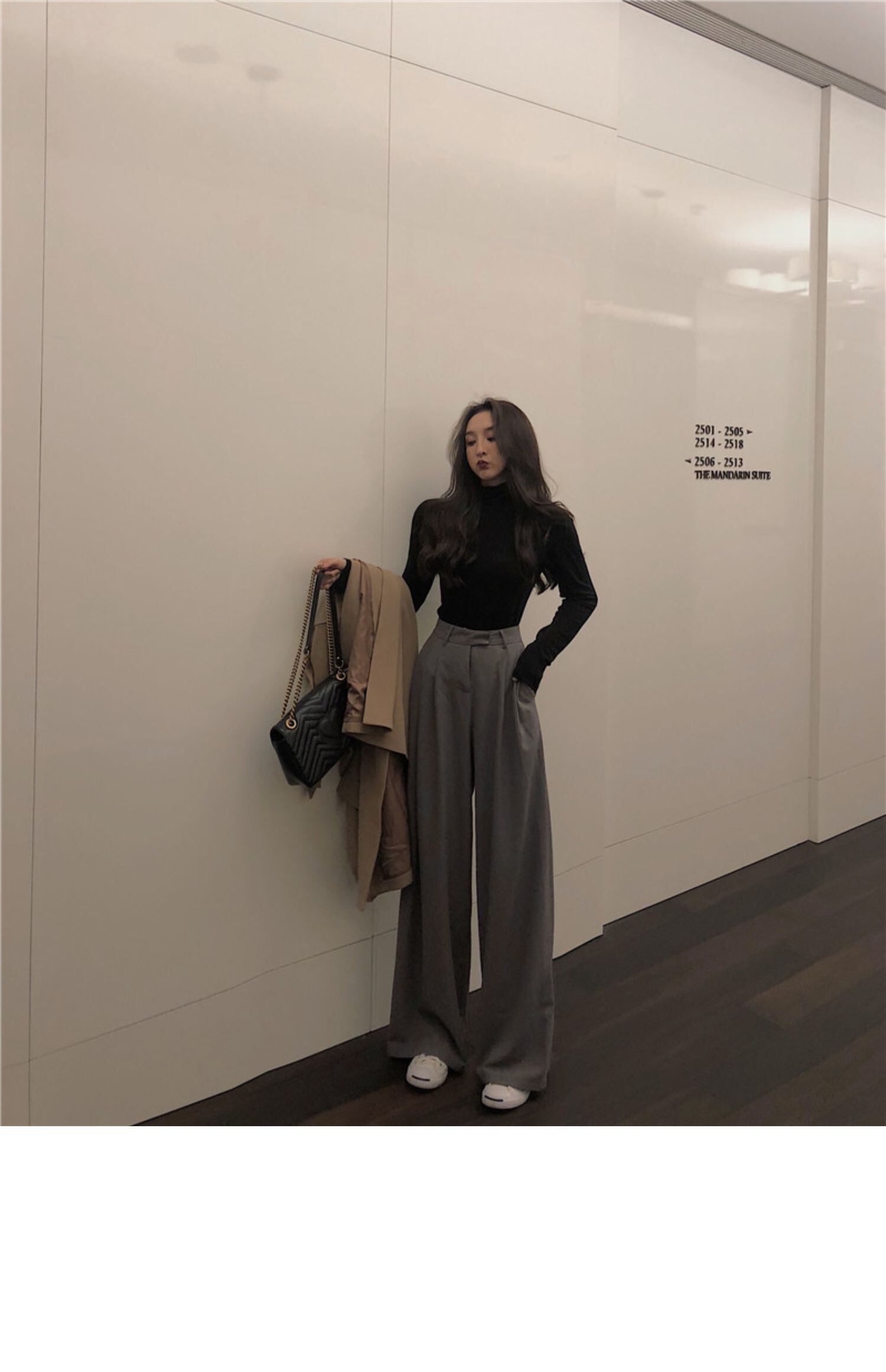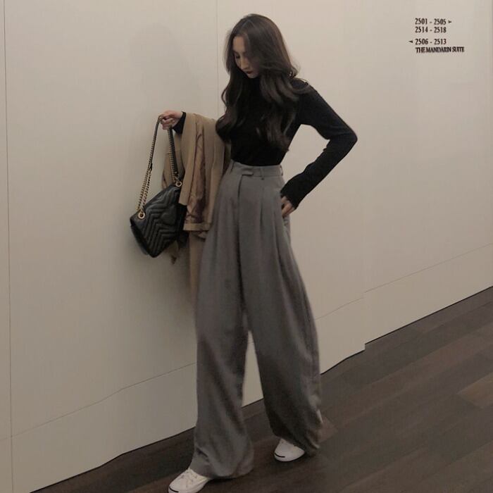 パンツ オータムスタンダードグレーハイウェストウェストワイドレッグ レトロ 秋物 ワイドパンツ ドラファッションホール81568897345