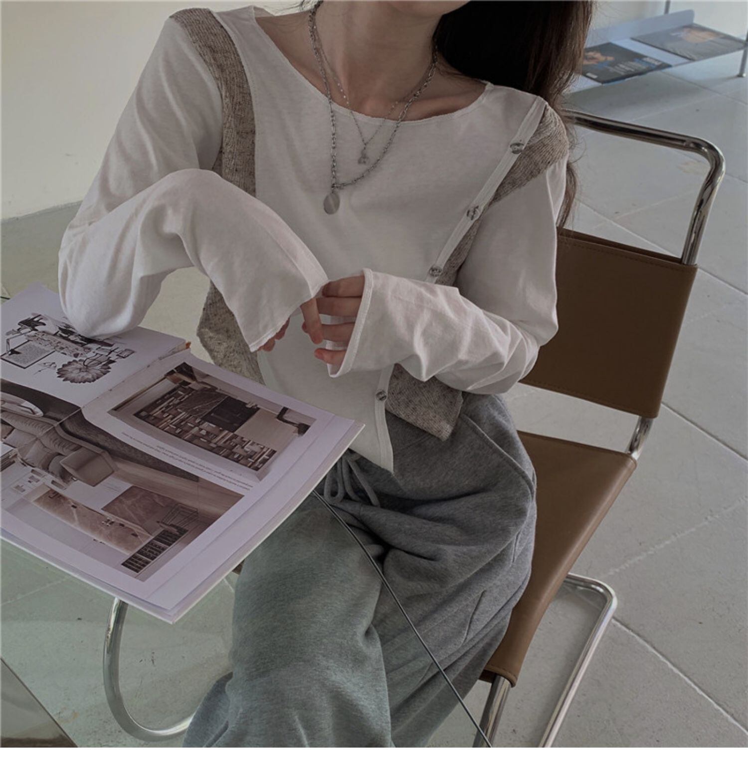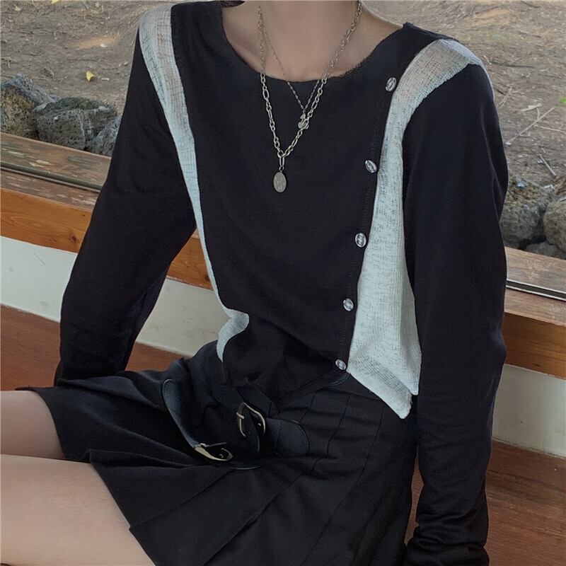オータムラウンドネックボタンスリムTシャツ トップス レディース ロング 秋物 Oネック ステッチ ドラファッションホール65550752035