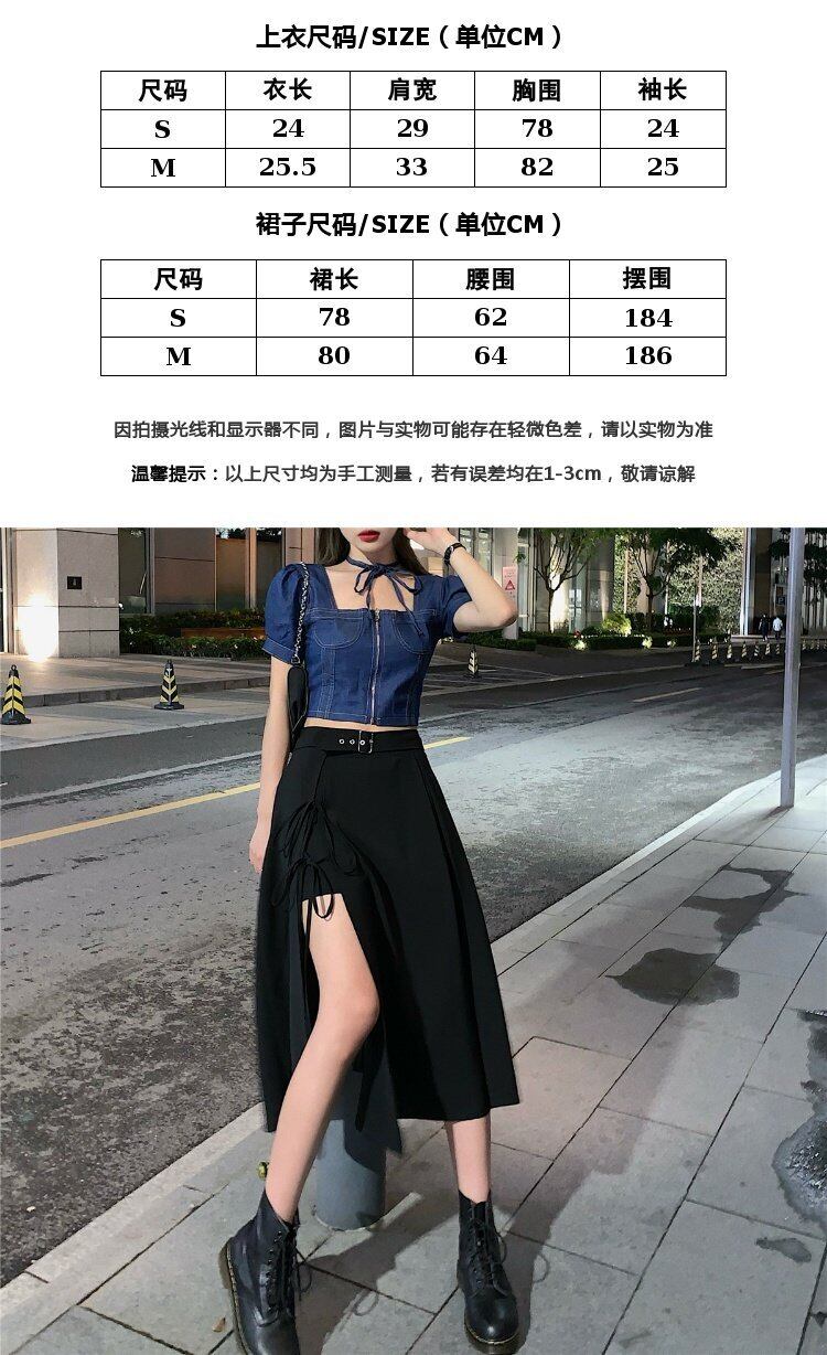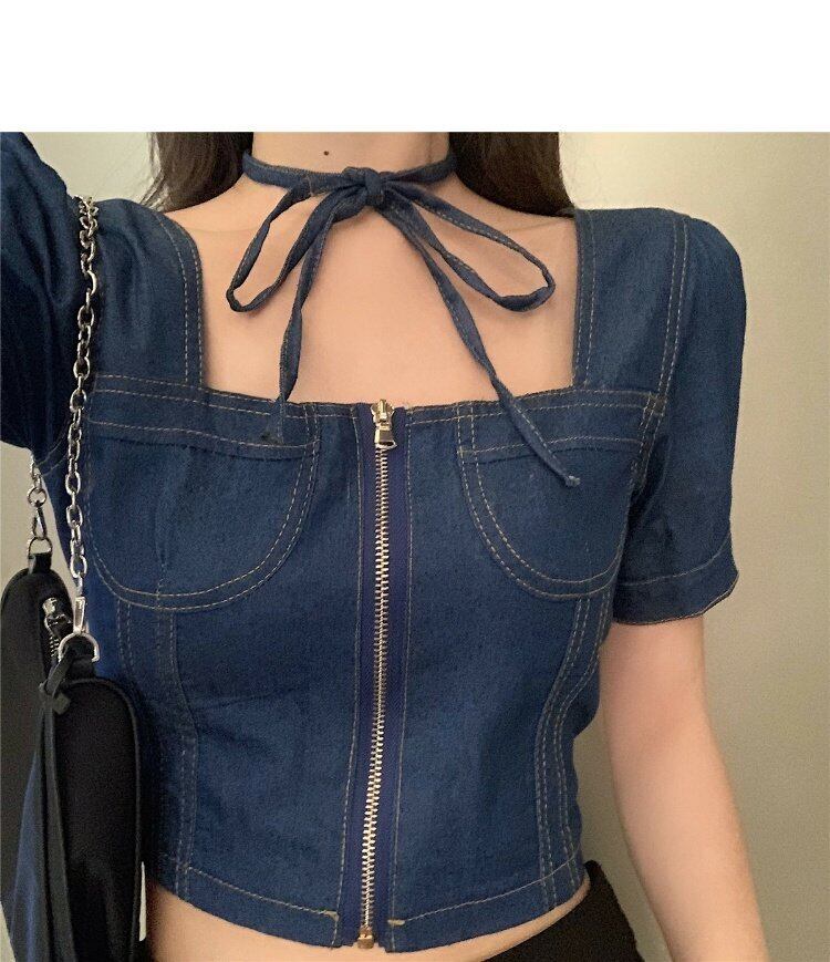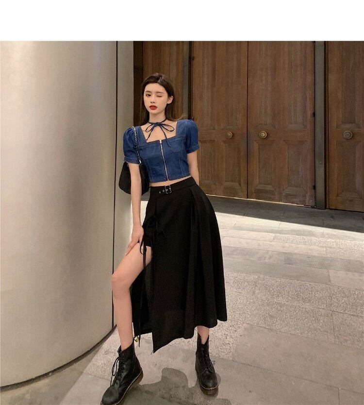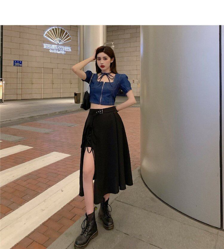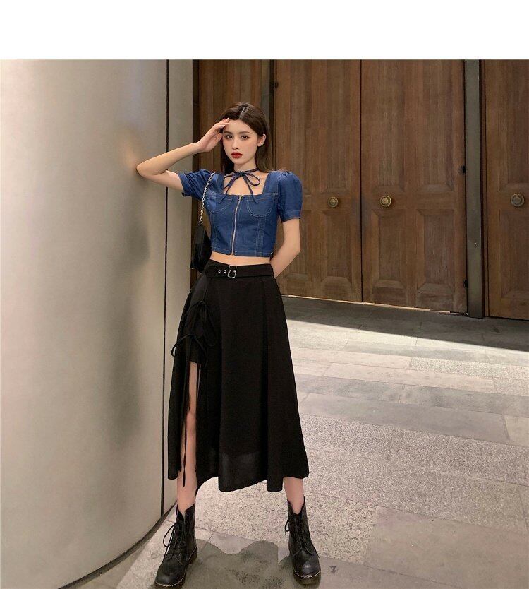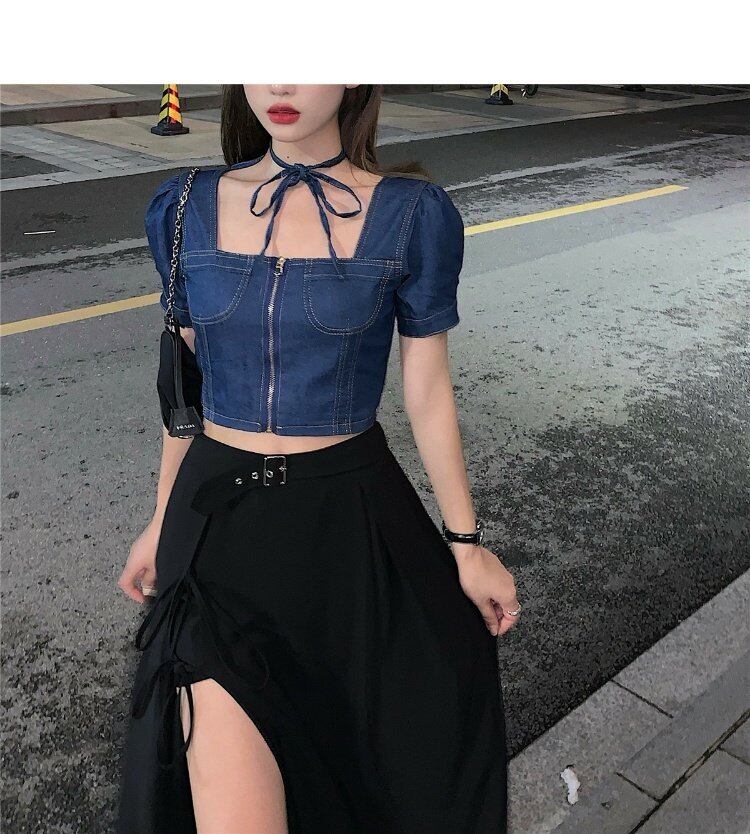 色:デニムクロップトップ,黒の半身グループ