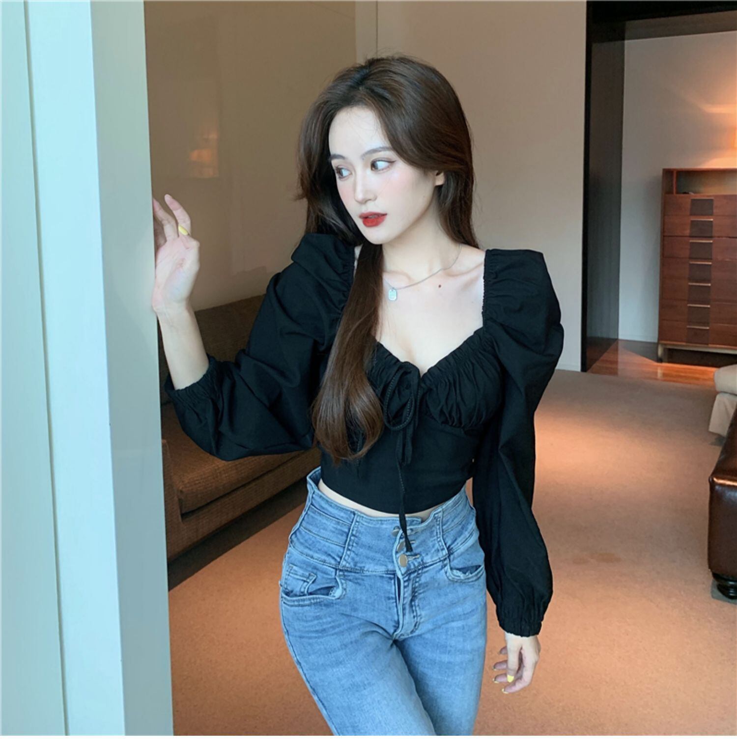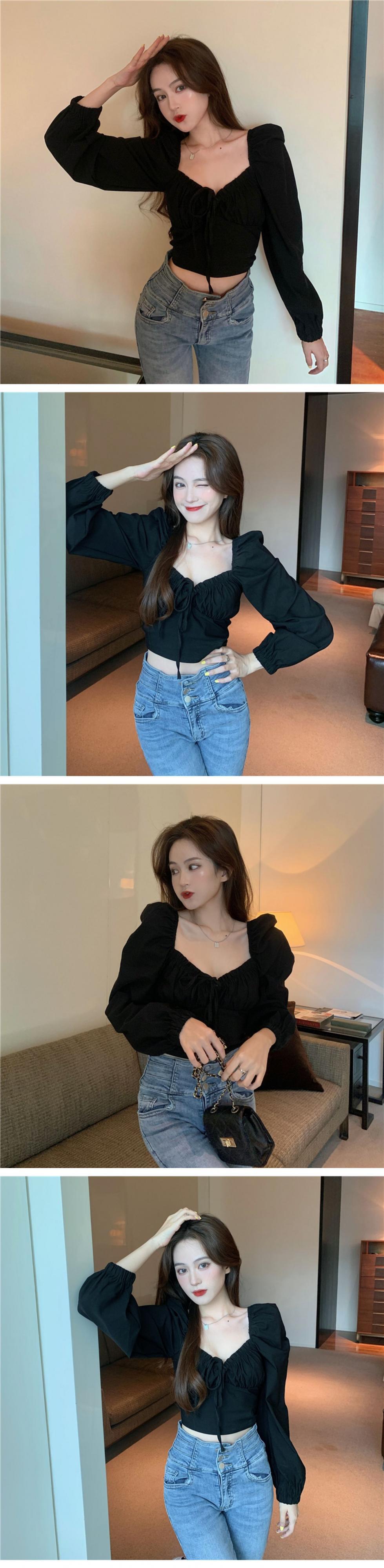 スタイルスリーブスリムショートブラックシャツ トップス サマー薄手 ロング 夏物 ドラファッションホール30815305156