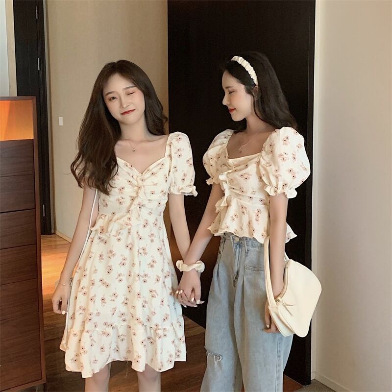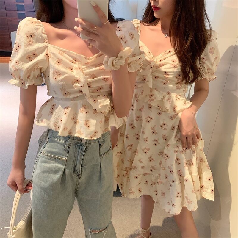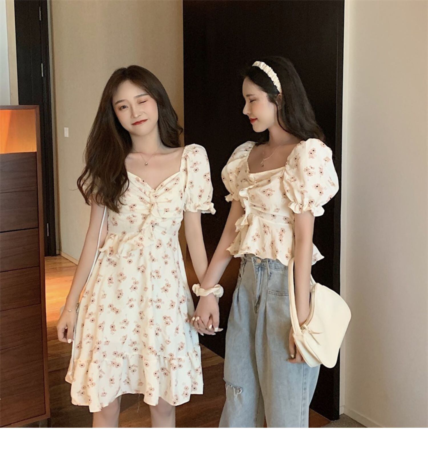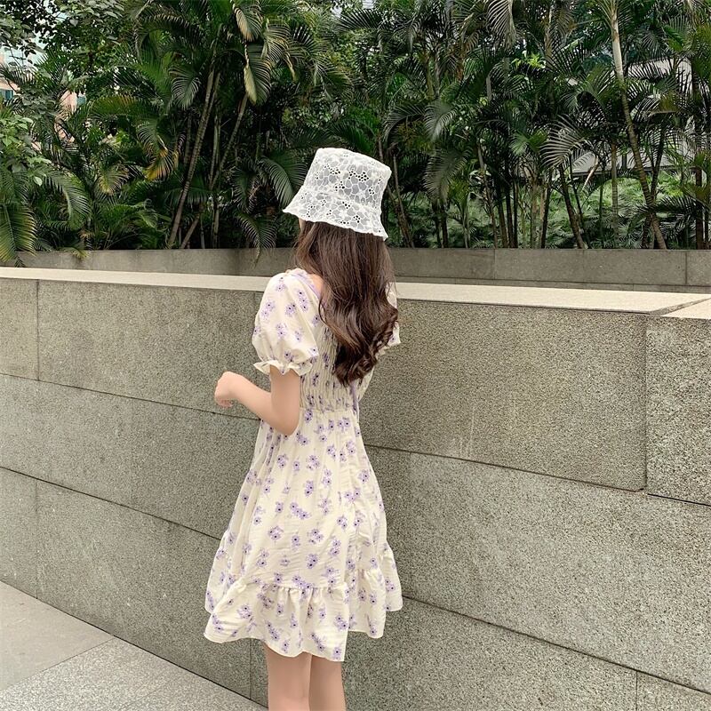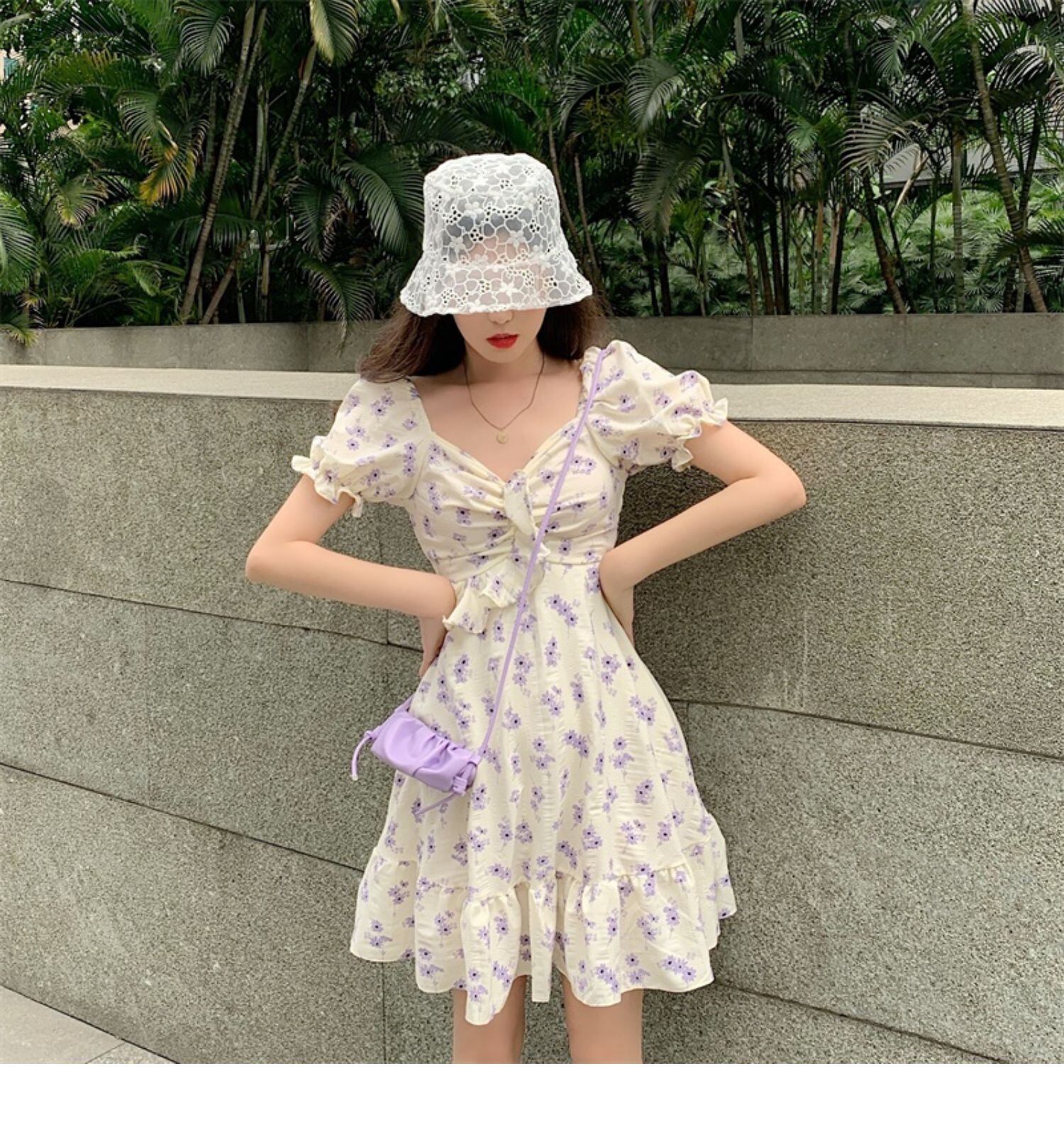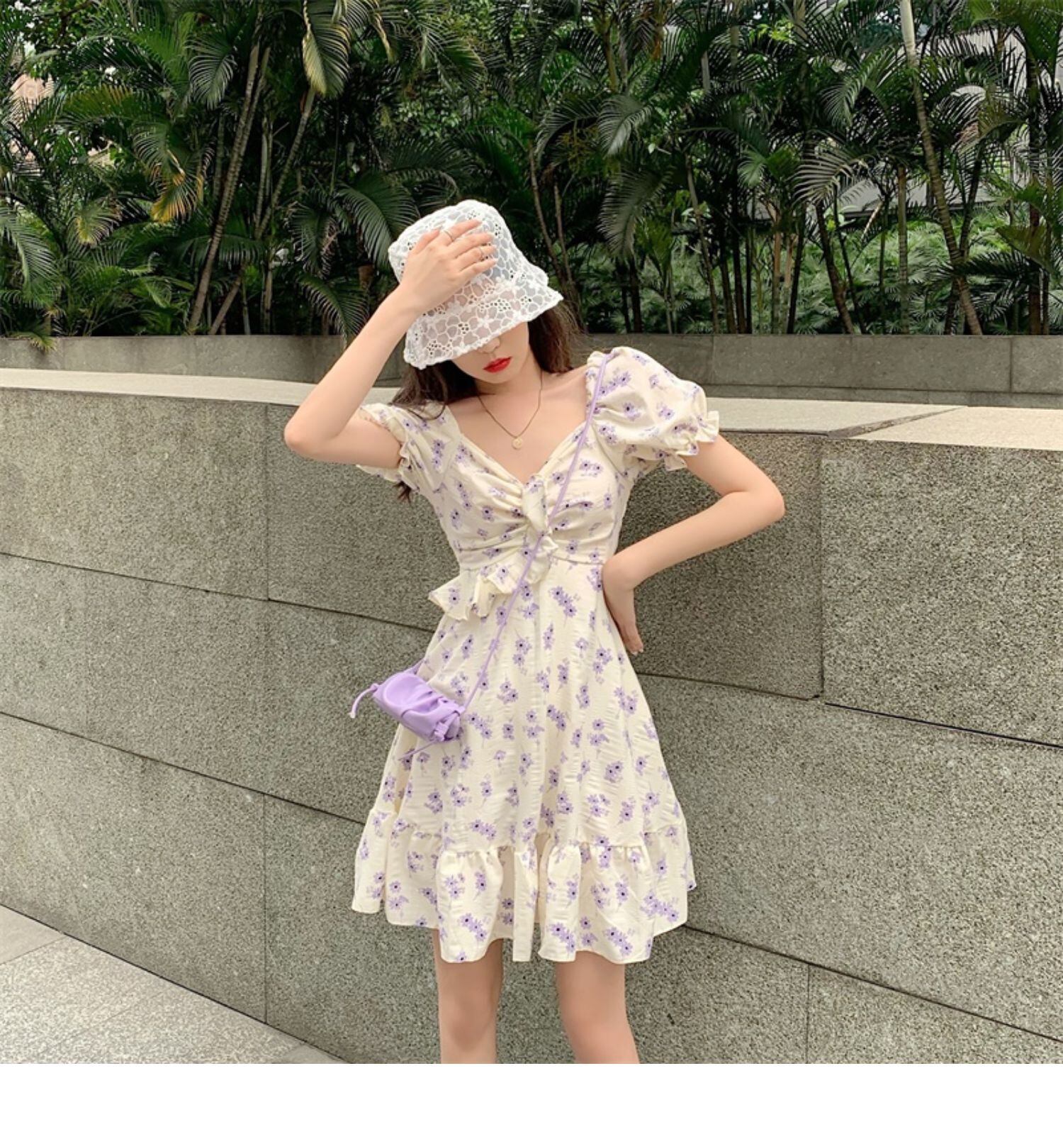 フローラルスリーブスタンダードウェストドレス サマーAラインスカート レトロ 夏物 花柄 ドラファッションホール19877026466