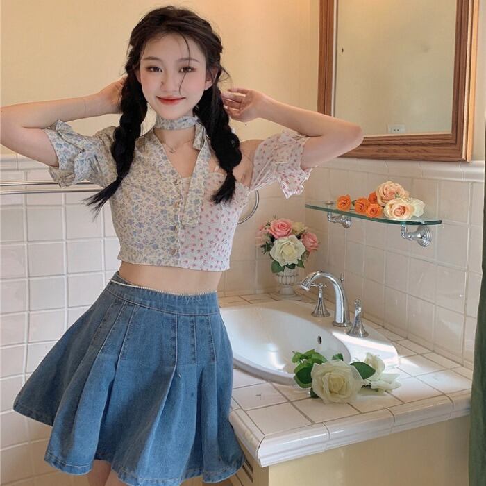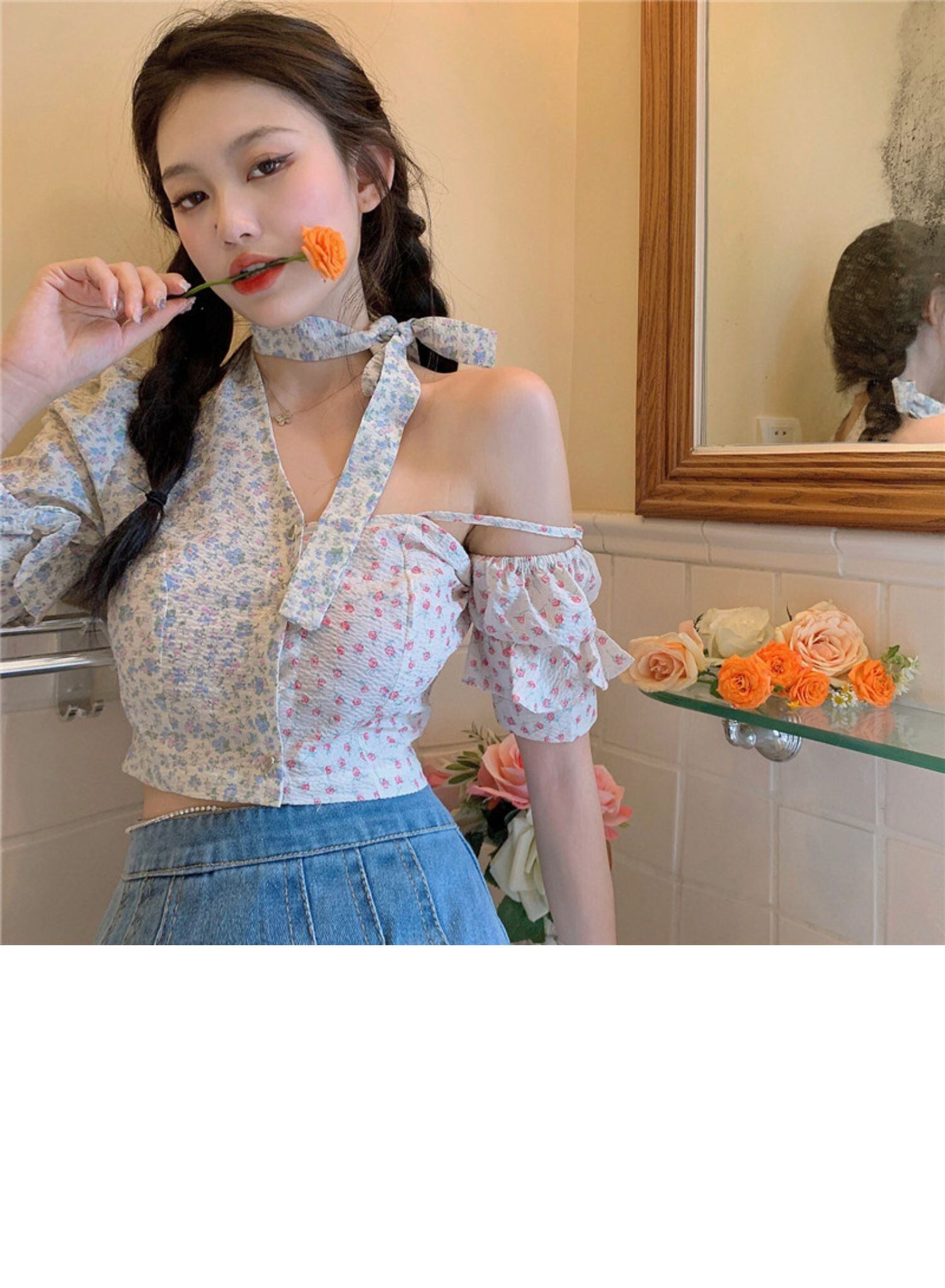 サマースタンダードストラップレスショートフローラルシャツ トップス レディース レトロ 夏物 花柄 ドラファッションホール41286663448
