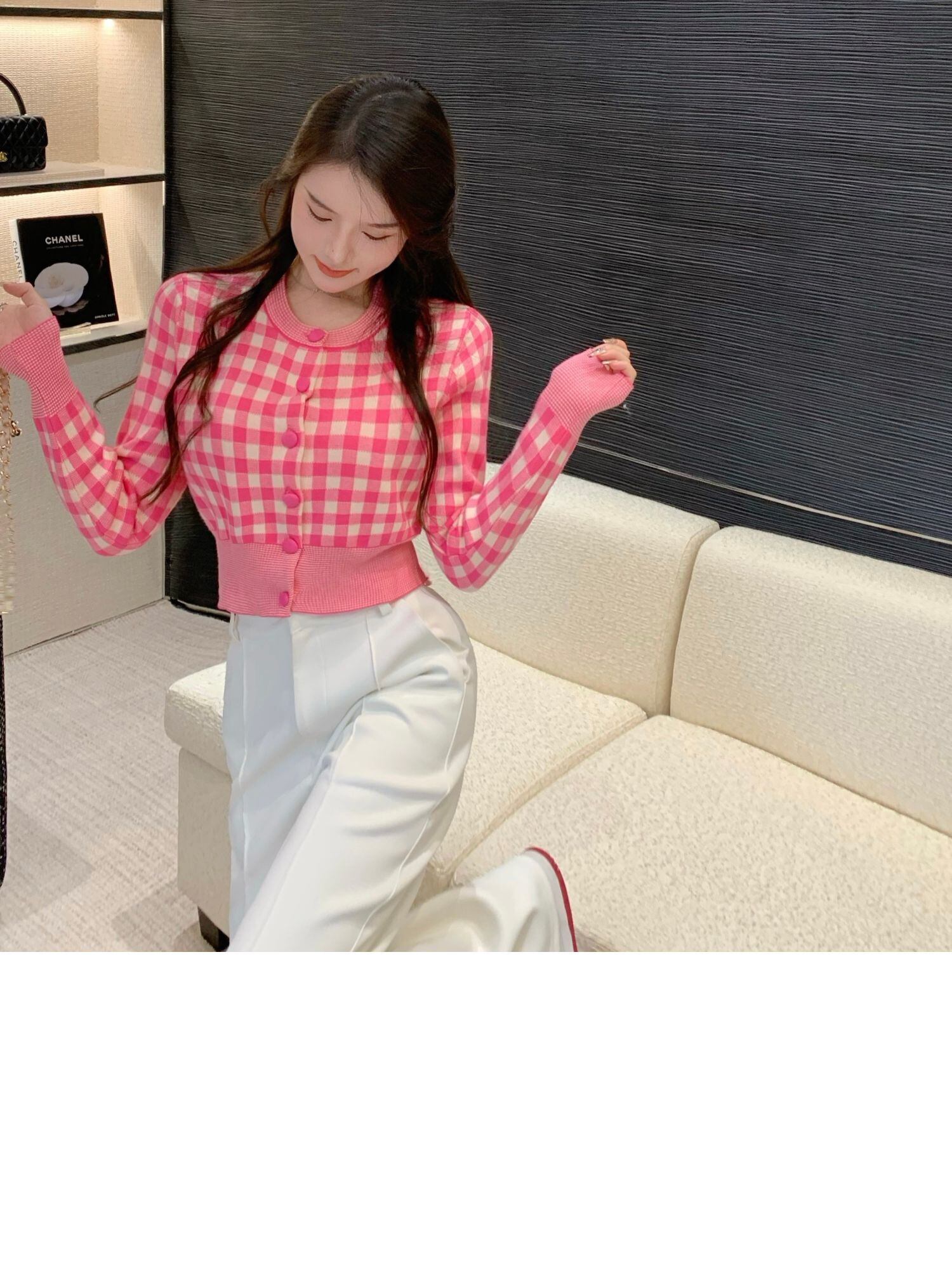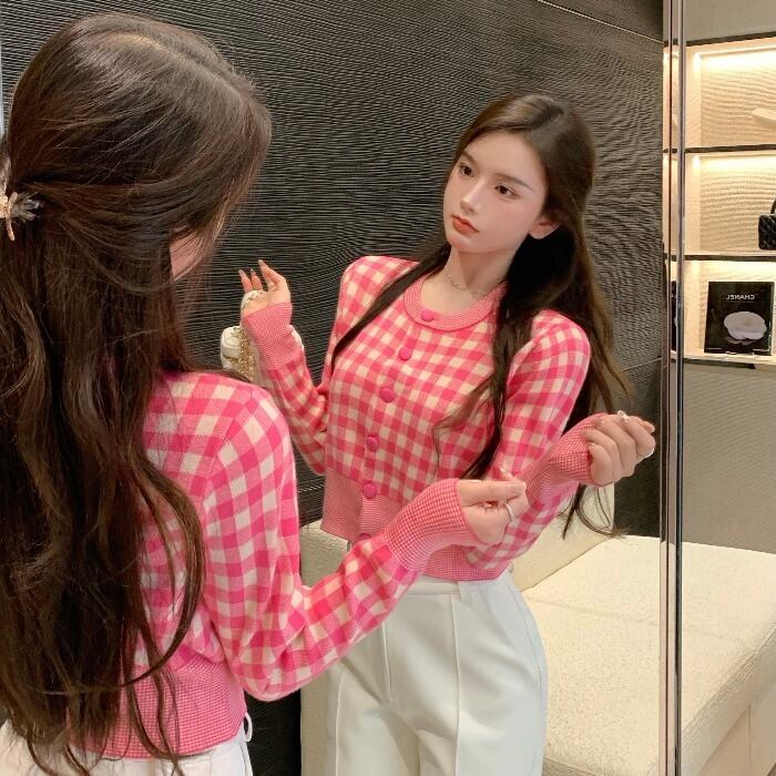 格子柄セーター ジャケット ニットカーディガン ピンク ドラファッションホール48679349986