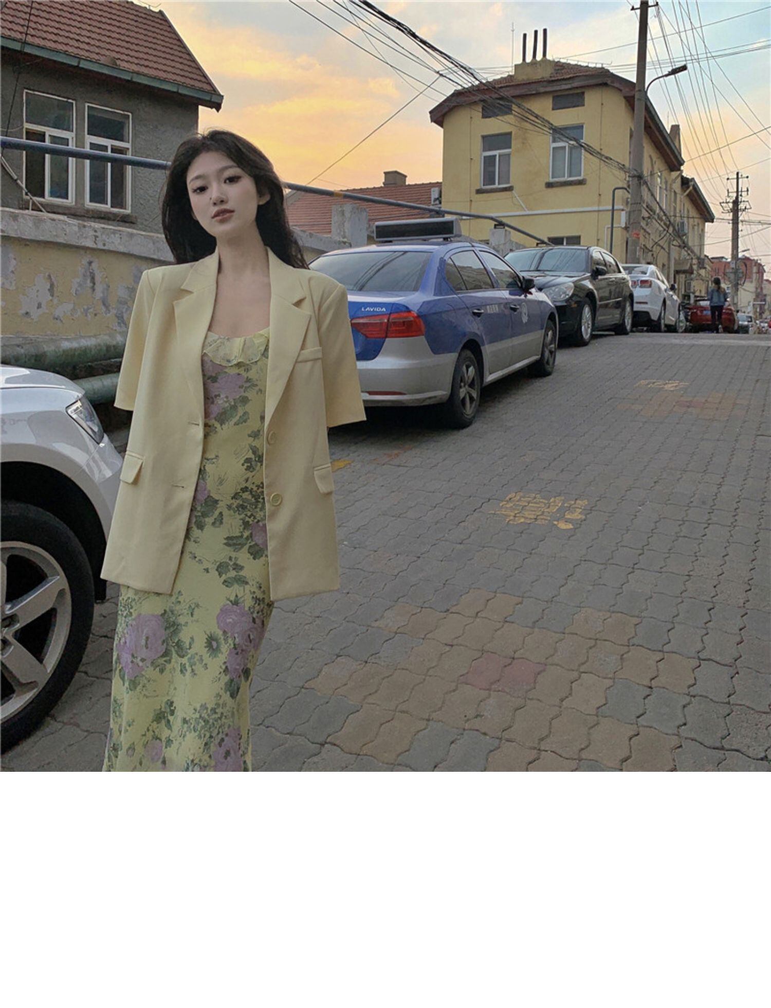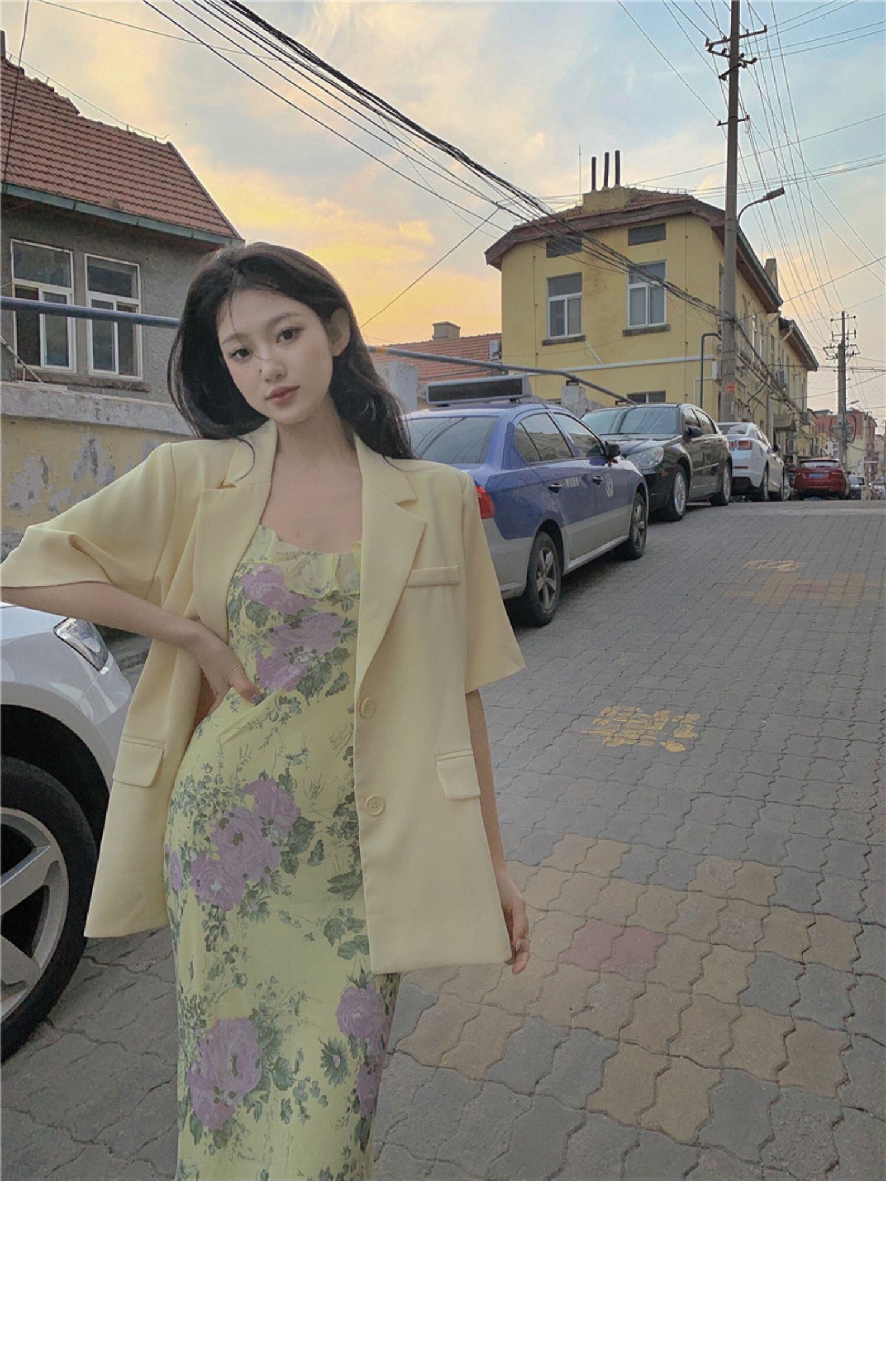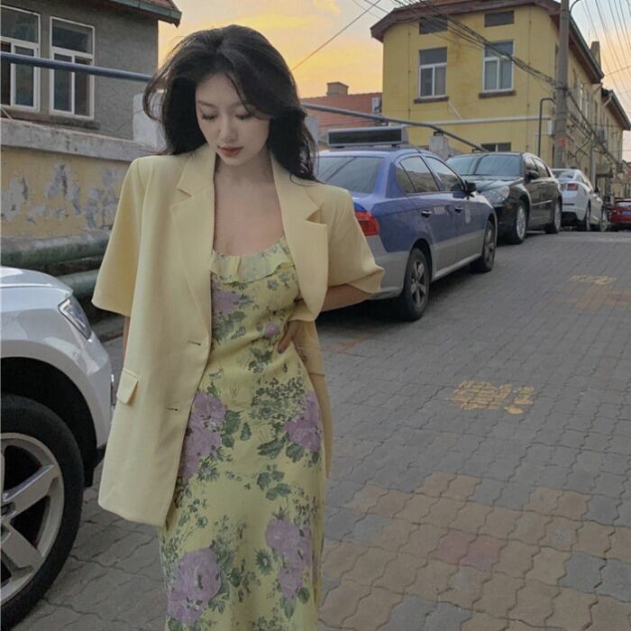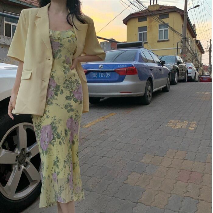 色:花柄ドレス,黄色のスーツ